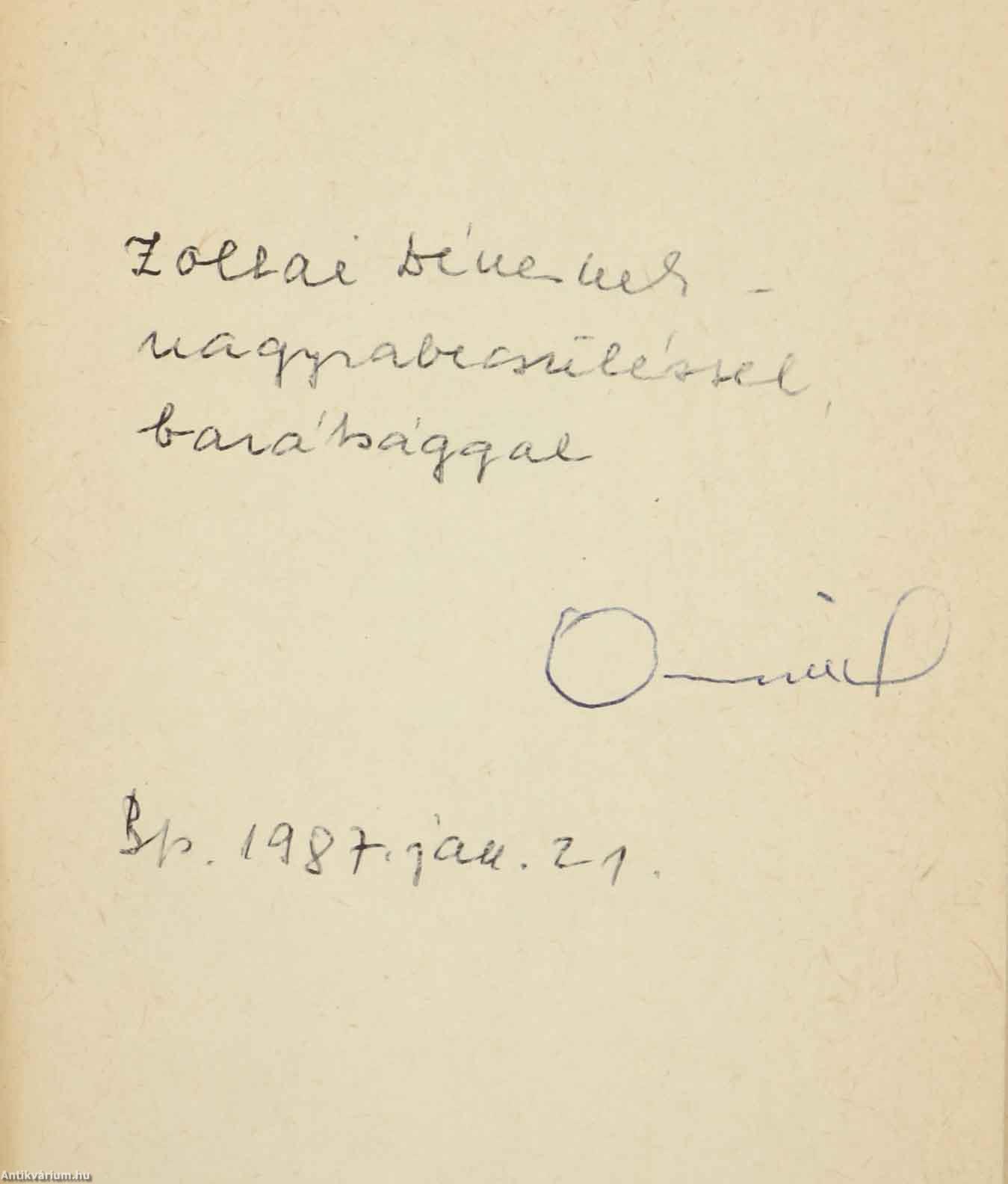 Az előlapon a szerző, Aczél György tollal beírt, névre szóló dedikációja olvasható: "Zoltai Dénesnek - nagyrabecsüléssel, barátsággal Aczél György Bp. 1987. jan. 21.".
