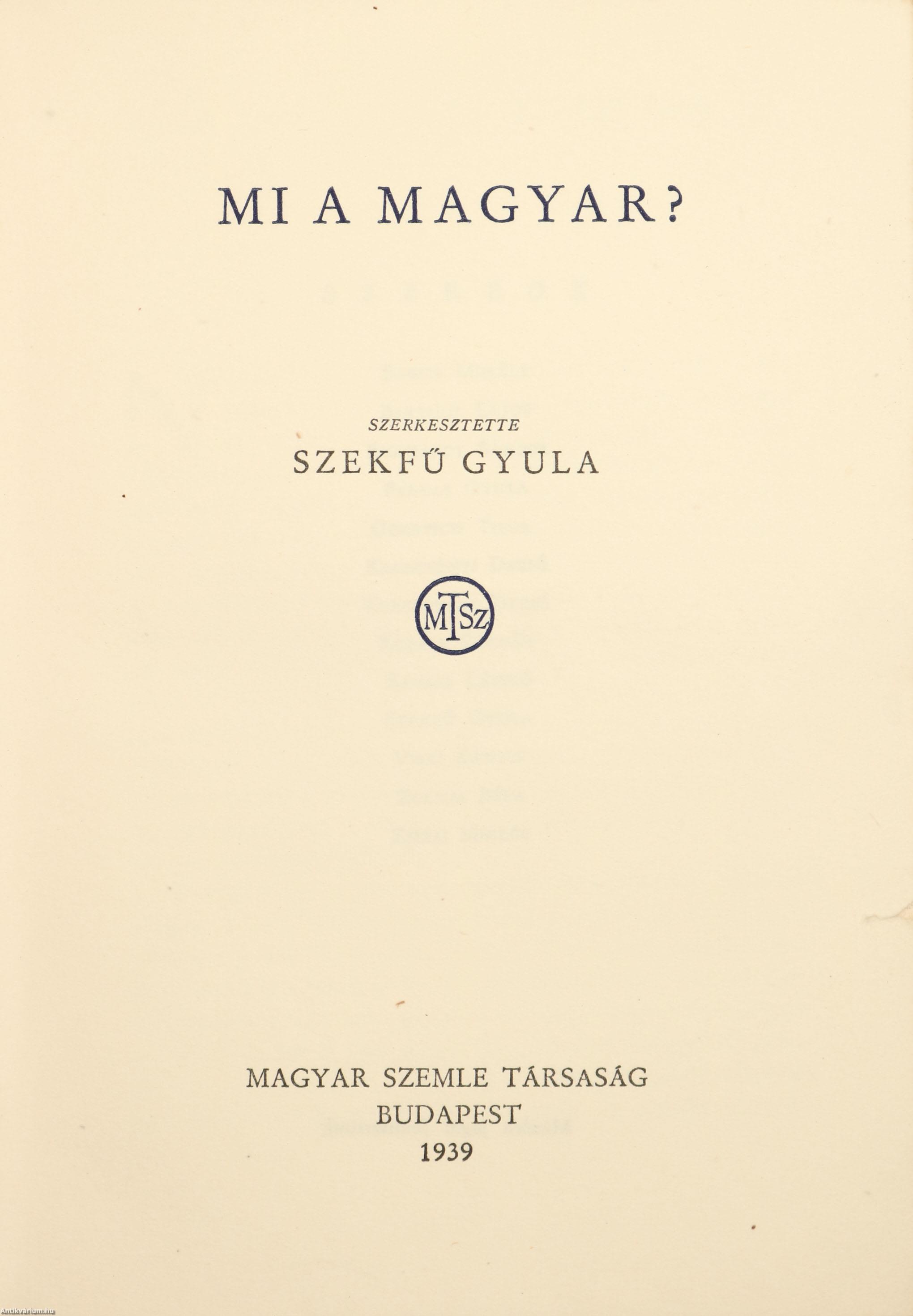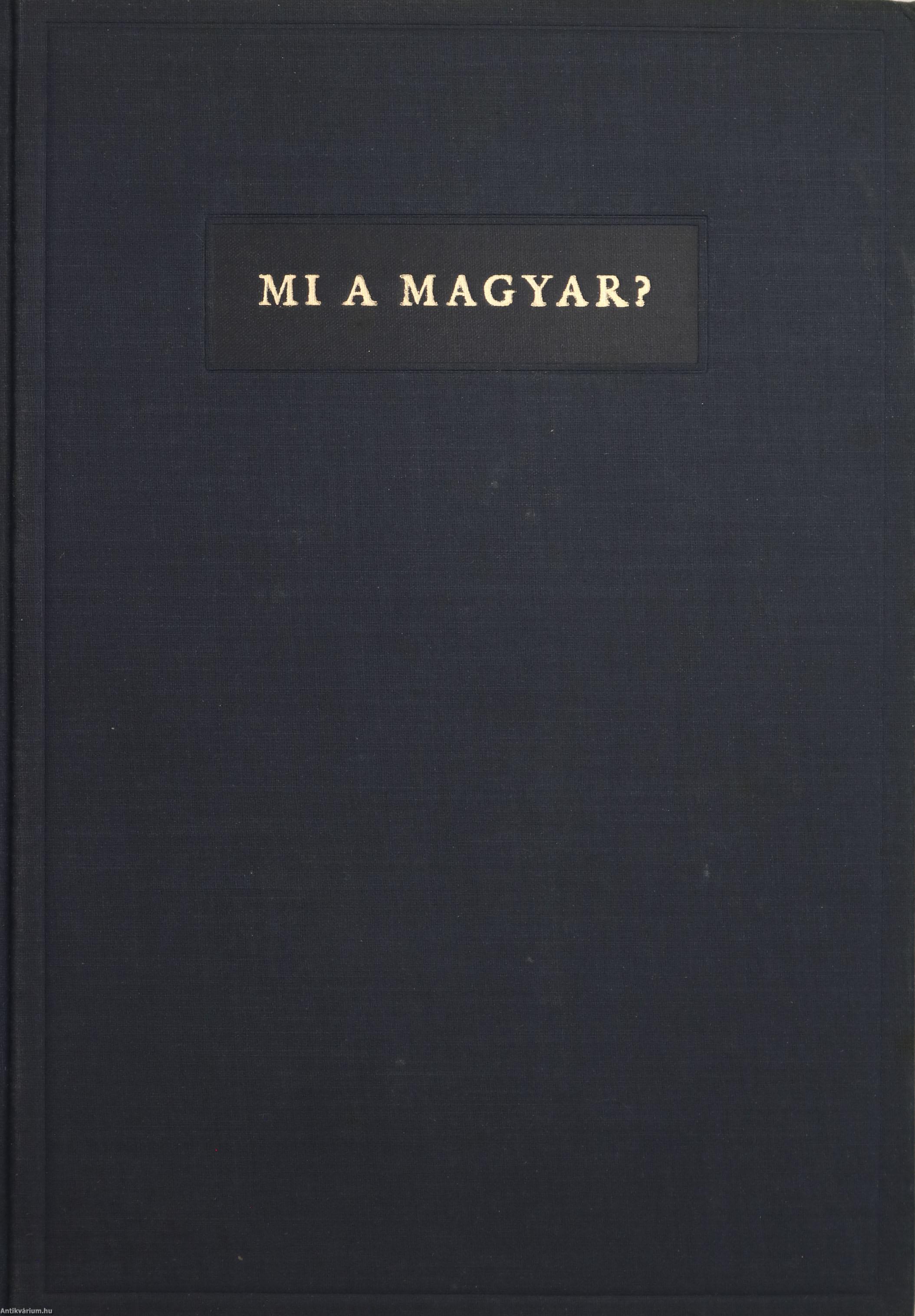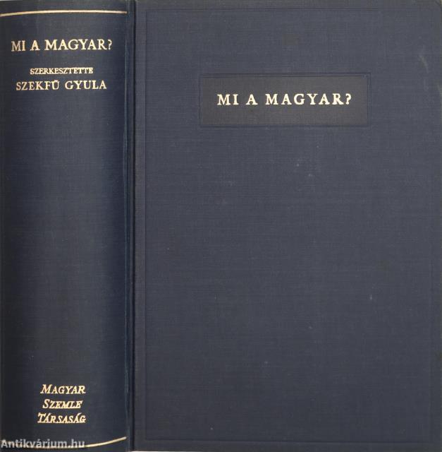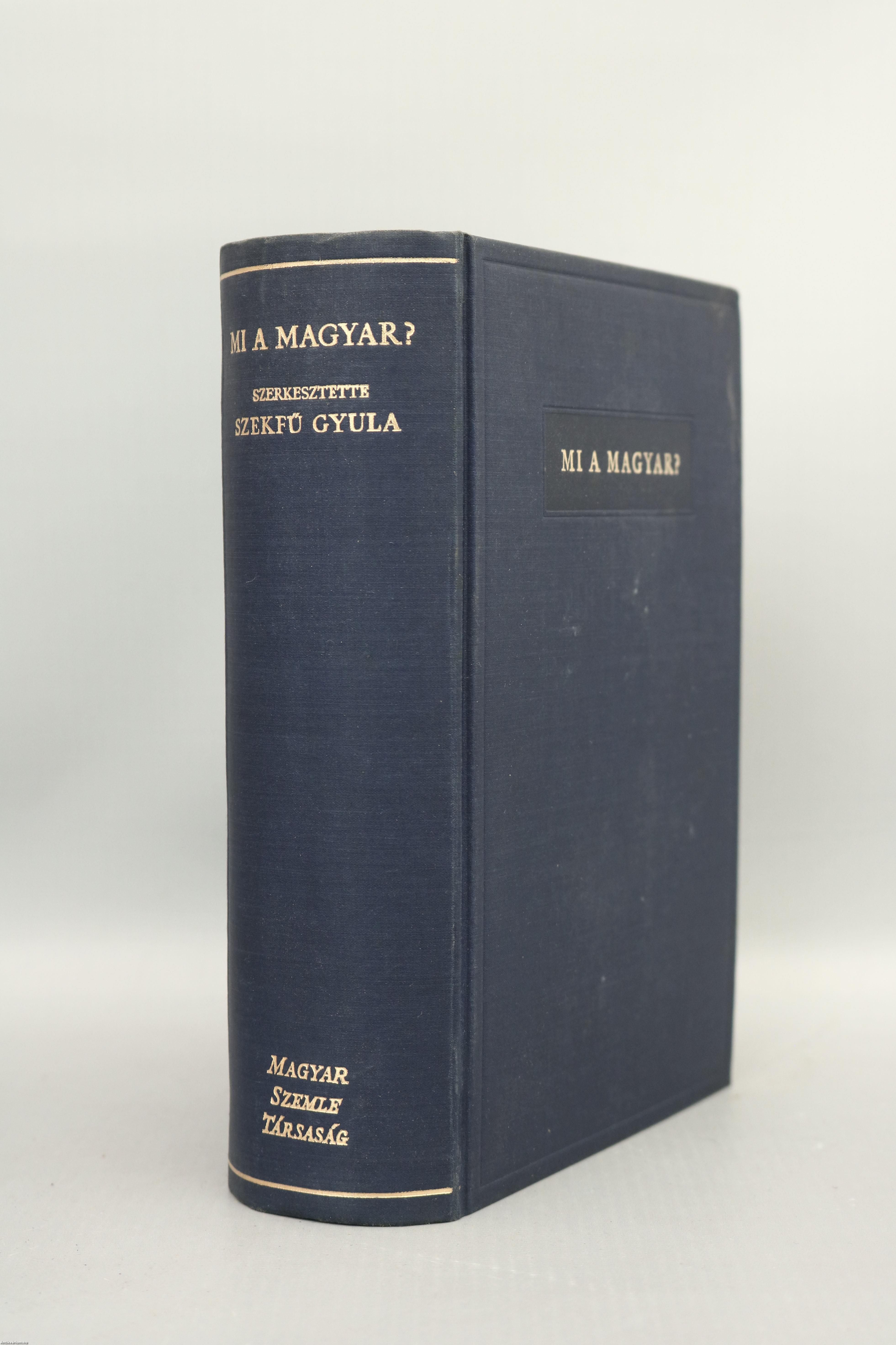 A Magyar Szemle Könyvei. No.: XV. sz. Mi a magyar? Szerkesztette: Szekfű Gyula. "E könyvet a Magyar Szemle Társaság tulajdonában lévő "Old Kenntonian Face" anyadúcokkal ezerkilencszázharminckilenc október és november havában szedte és nyomta az Athenaeum Irodalmi és Nyomdai Részvénytársulat, Budapesten". 16 fekete-fehér, feliratos képtáblával illusztrált, valamint a szerkesztő előszavával, kép- és tartalomjegyzékkel, illetve a sorozat reklámjával kiegészített kötet. Kiadói egészvászon sorozatkötésben lévő példány, aranyozott feliratozású, dombornyomott keretezéssel ellátott címfedéllel, aranyozott feliratozású könyvgerinccel, kiadói előzéklapokkal, a kiadó dombornyomott emblémájával ellátott hátlappal, hiánytalan, jó állapotban. A kötet szerkesztője Szekfű Gyula (Székesfehérvár, 1883. május 23. – Budapest, 1955. június 28.) történész, egyetemi tanár, az MTA tagja, a kora újkori magyar történelem kutatója. Életművéből leginkább a Három nemzedék c. történelmi szakmunka ismert, amely a Horthy-rendszer egyik fő ideológiai alapkövévé vált. Mindezek ellenére szakmai pályafutása 1945 után sem szenvedett csorbát. Bár történetírói munkássága elismerésre méltó, közéleti szerepvállalásai, politikai kurzusokat kiszolgáló írásai miatt megítélése máig ellentmondásos.