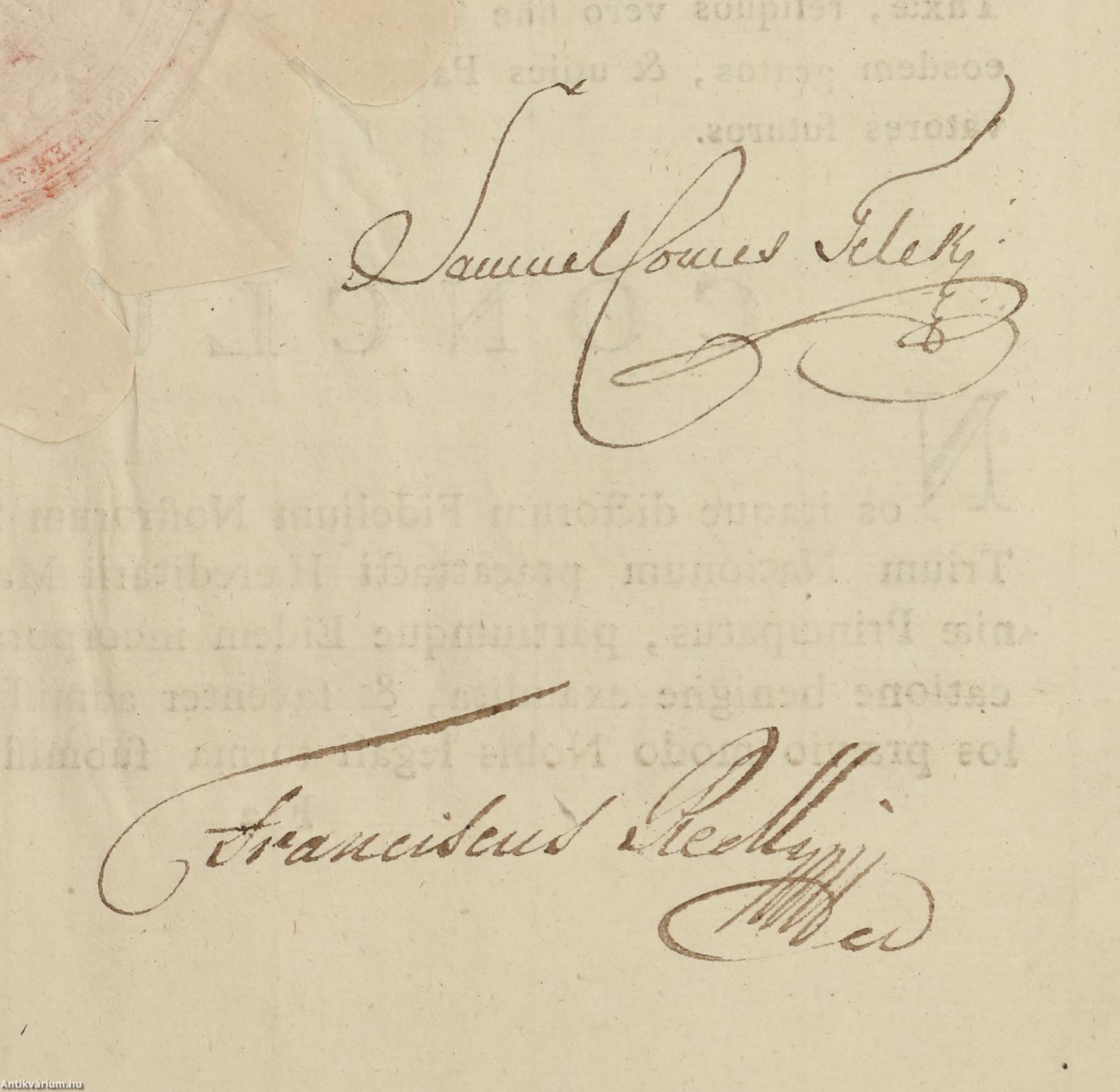 I. Ferenc magyar király és osztrák császár, gróf Teleki Sámuel erdélyi kancellár és máramarosi főispán, valamint Redly Ferenc által aláírt példány.