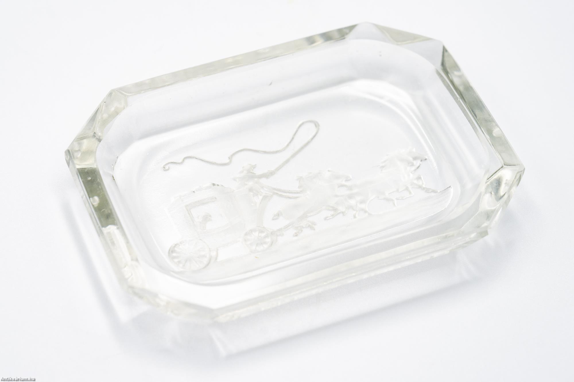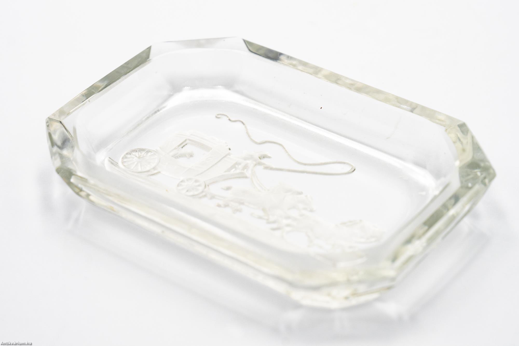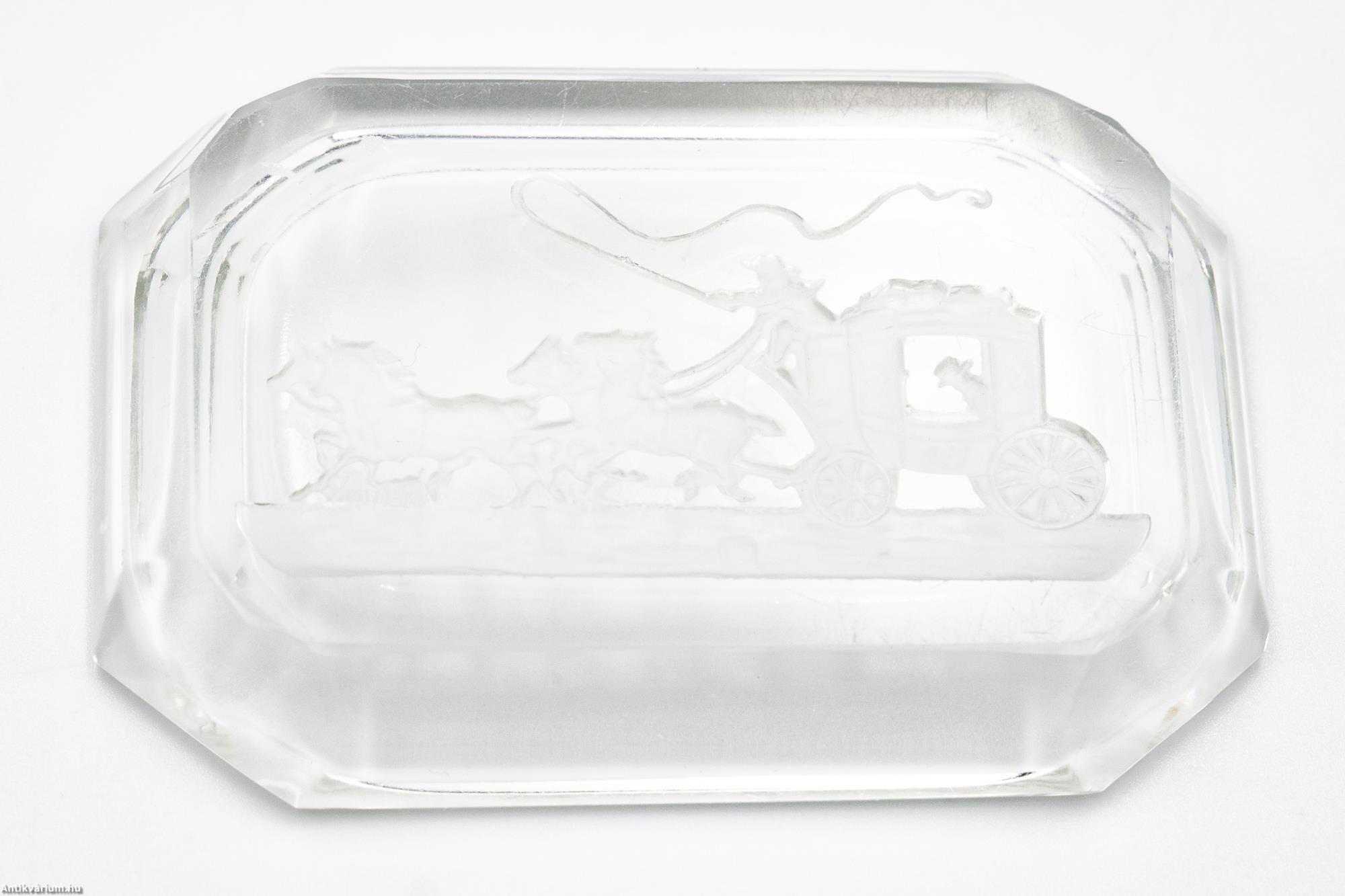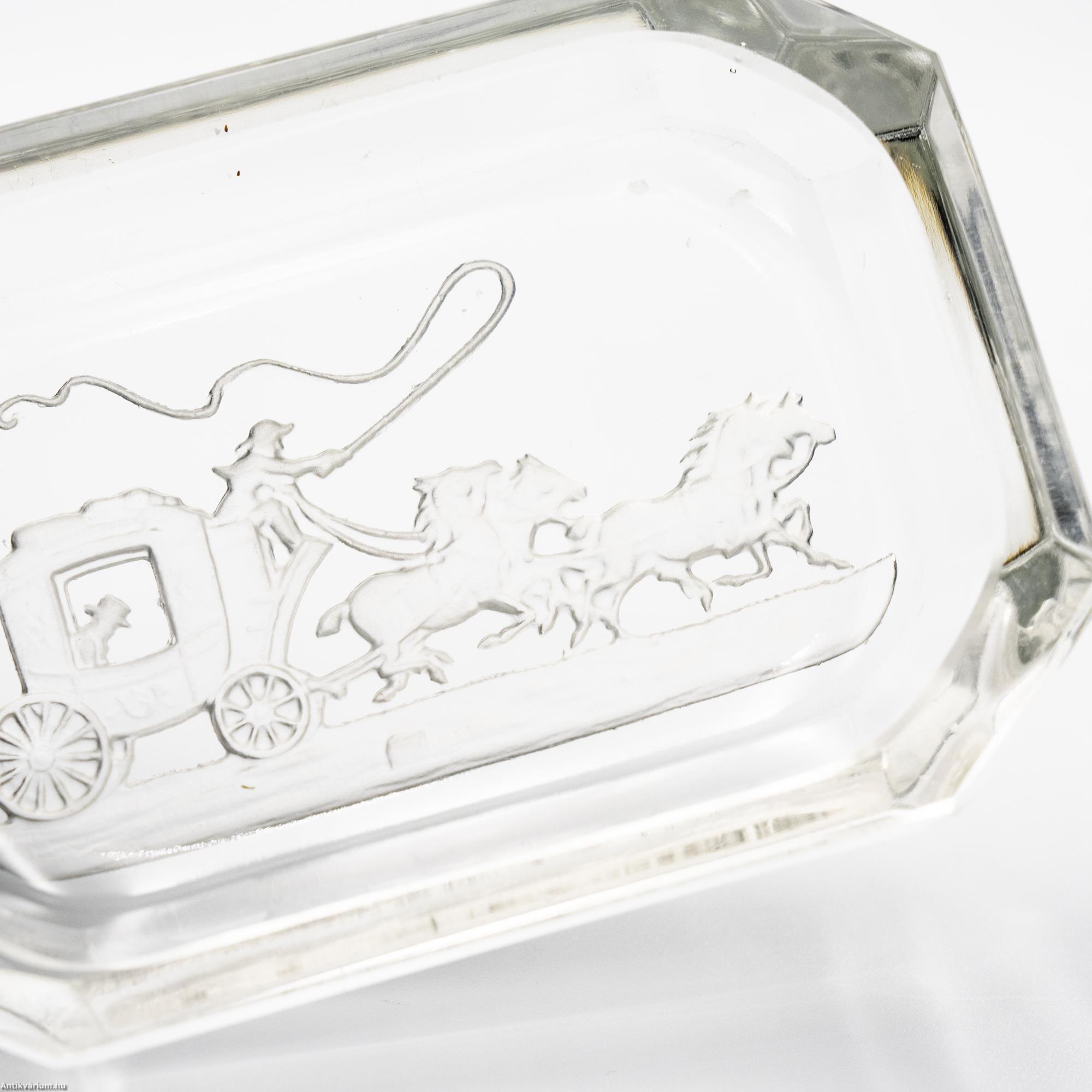 Hibátlan állapotú, fújt és kézzel formázott Schlevogt által tervezett színtelen, téglalap alakú, art deco csiszolt üveg tálka. Nyolcszögletű alkotás lapra csiszolt oldalakkal, alján homok fúvott posta kocsit ábrázoló motívummal. Készítésének ideje a 20. század első fele. Schlevogt (1904 - 1984) ékszer és üvegtervező művész, akire elsődlegesen a művészi üvegáru (kis méretű, öntéssel vagy fújással készült üvegtárgyak) tervezése volt jellemző.