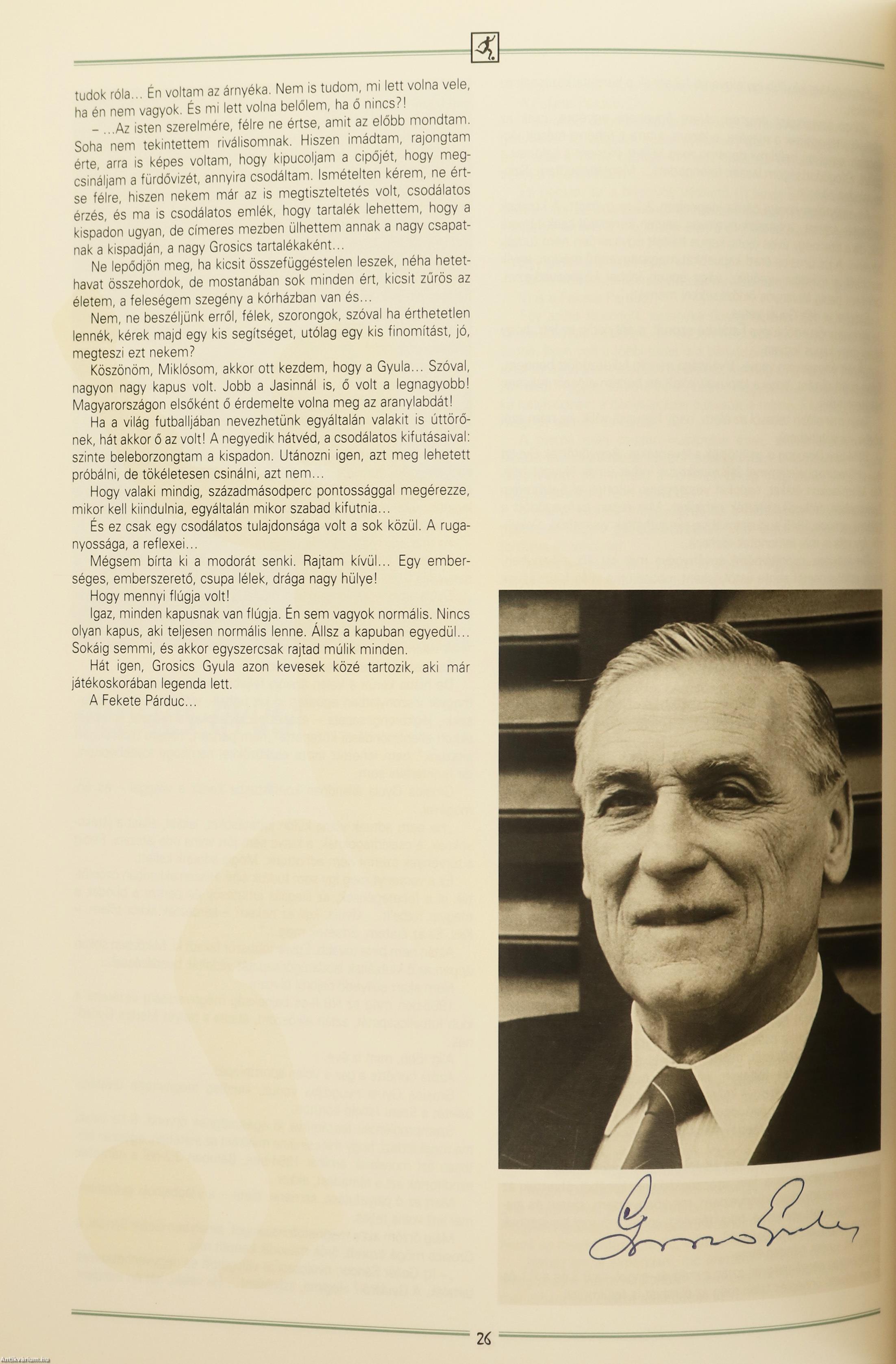 - Grosics Gyula (Dorog, 1926. február 4. – Budapest, 2014. június 13.) a Nemzet Sportolója címmel kitüntetett magyar labdarúgó, az Aranycsapat kapusa, 86-szoros magyar válogatott. Aláírása a 26. oldalon található.