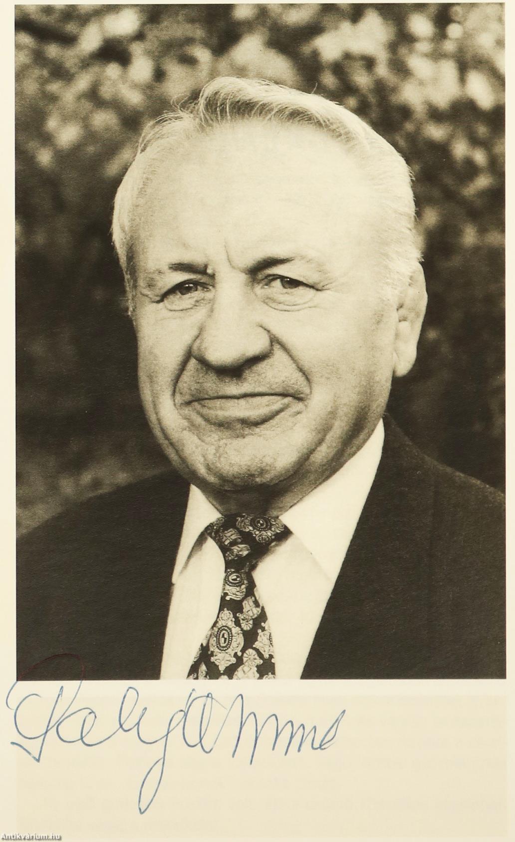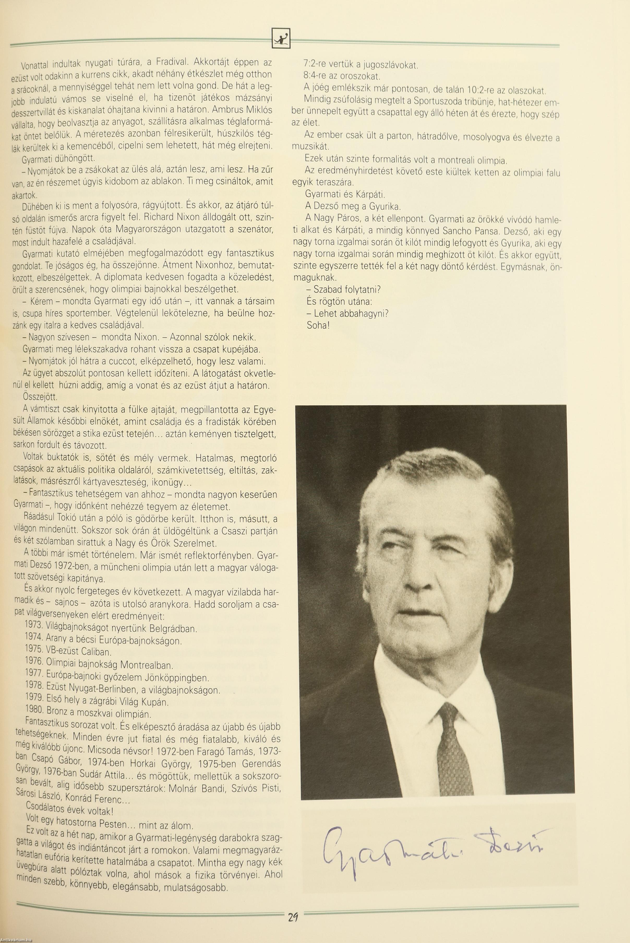 Gyarmati Dezső (Miskolc, 1927. október 23. – Budapest, 2013. augusztus 18.) a Nemzet Sportolója címmel kitüntetett magyar vízilabdázó, szakedző, országgyűlési képviselő tollal beírt, névre szóló dedikációja olvasható: