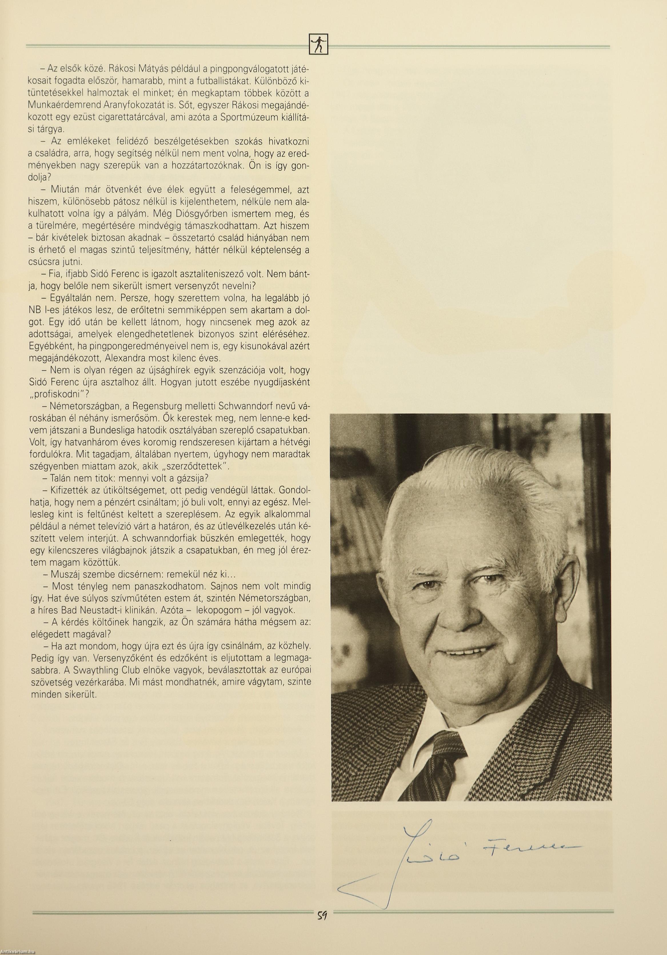 - Sidó Ferenc (Vágpatta, 1923. április 18. – Budapest, 1998. február 6.) kilencszeres világbajnok asztaliteniszező, labdarúgó, edző, sportvezető. Aláírása az 59. oldalon található.