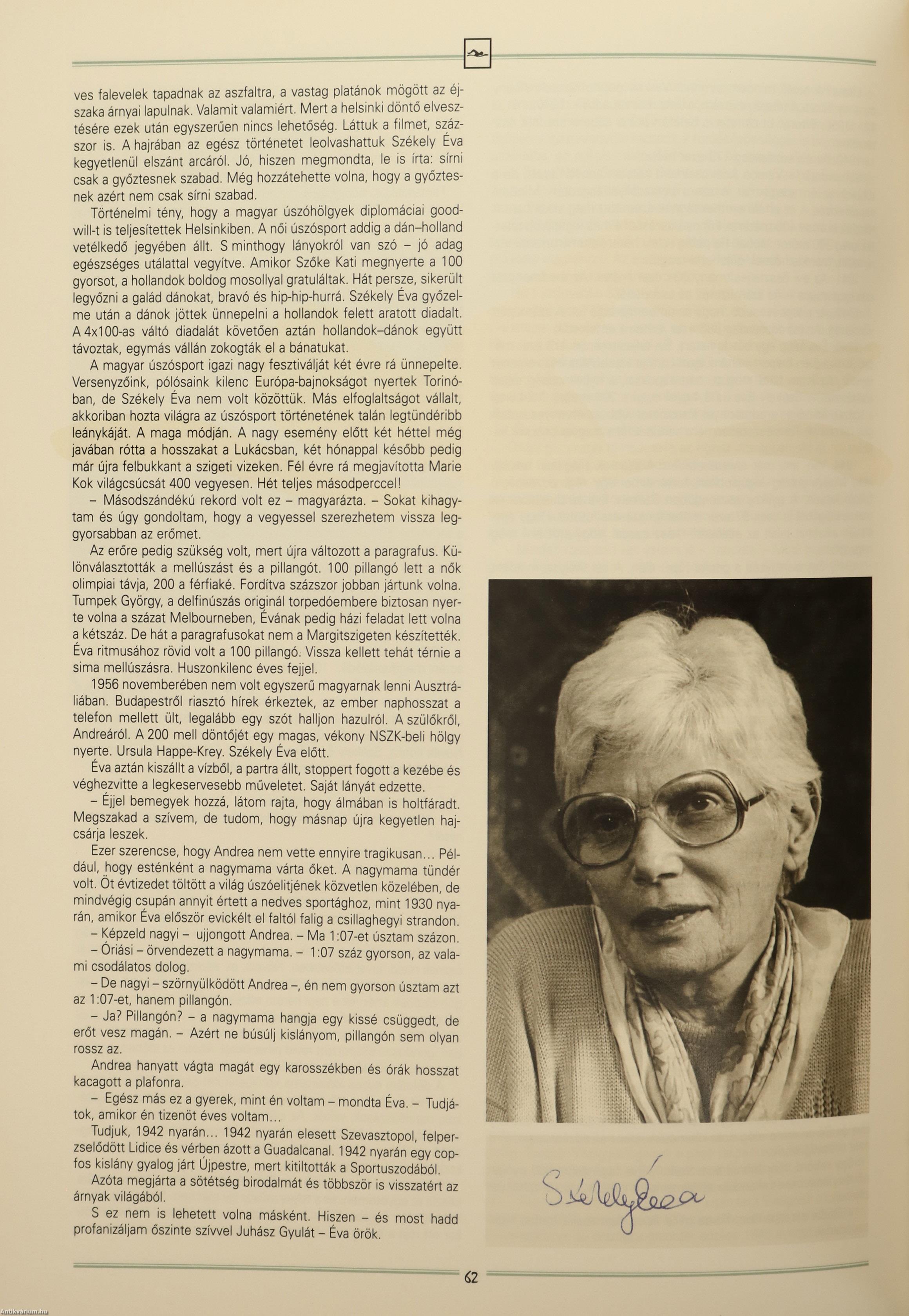 - Székely Éva (Budapest, 1927. április 3. – Budapest, 2020. február 29.) a Nemzet Sportolója címmel kitüntetett olimpiai bajnok magyar úszónő. Aláírása a 62. oldalon található.