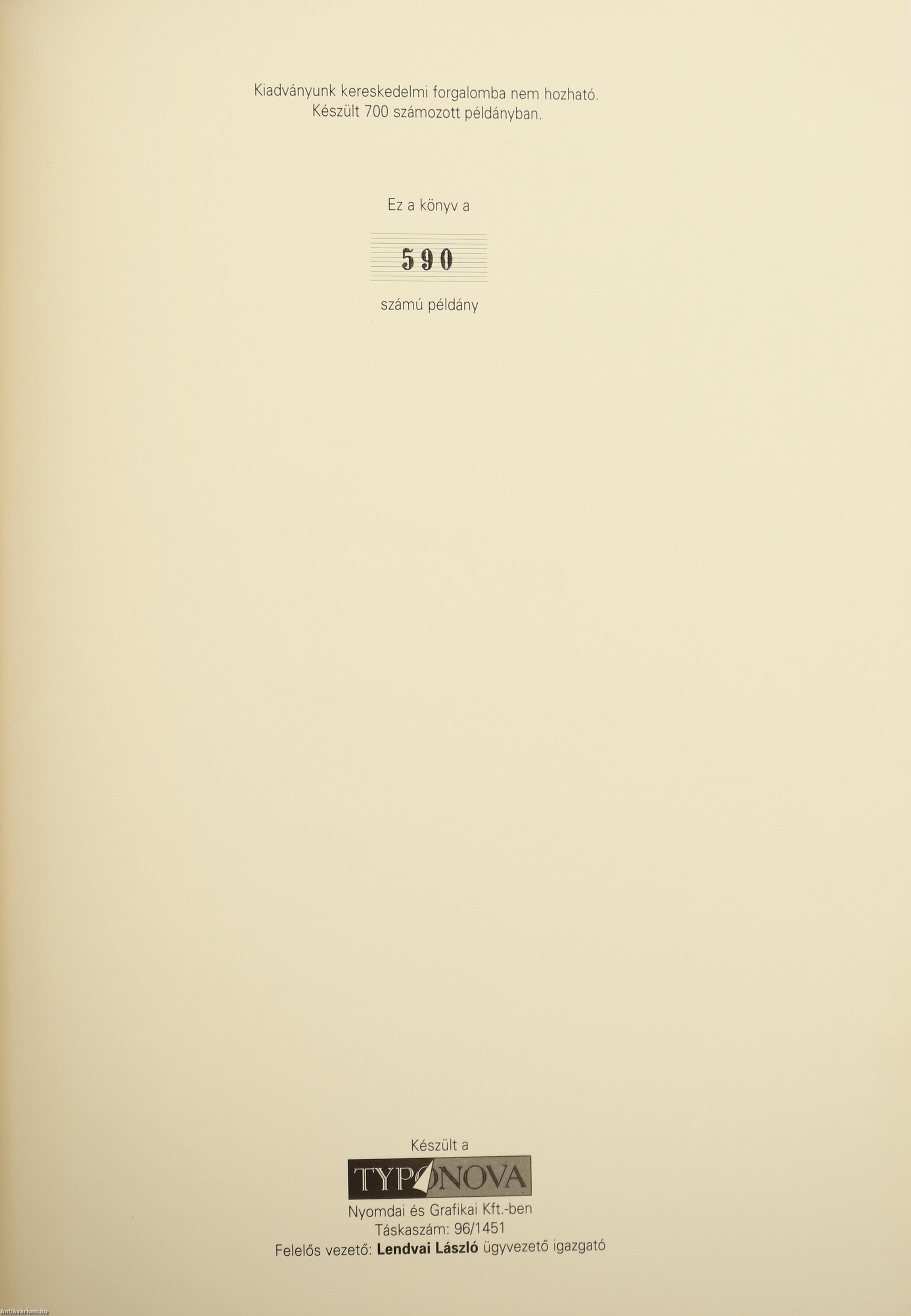 Kiadványunk kereskedelmi forgalomba nem hozható. Készült 700 számozott példányban. Ez a könyv a 590. számú példány.Szöveg közti, fekete-fehér fotókkal illusztrált, valamint Dr. Schmitt Pál előszavával, utószóval, a szerzők listájával és tartalomjegyzékkel kiegészített kötet. A fotókat az MTI Archív-Sajtó Szolgálat bocsájtotta a kiadó rendelkezésére.