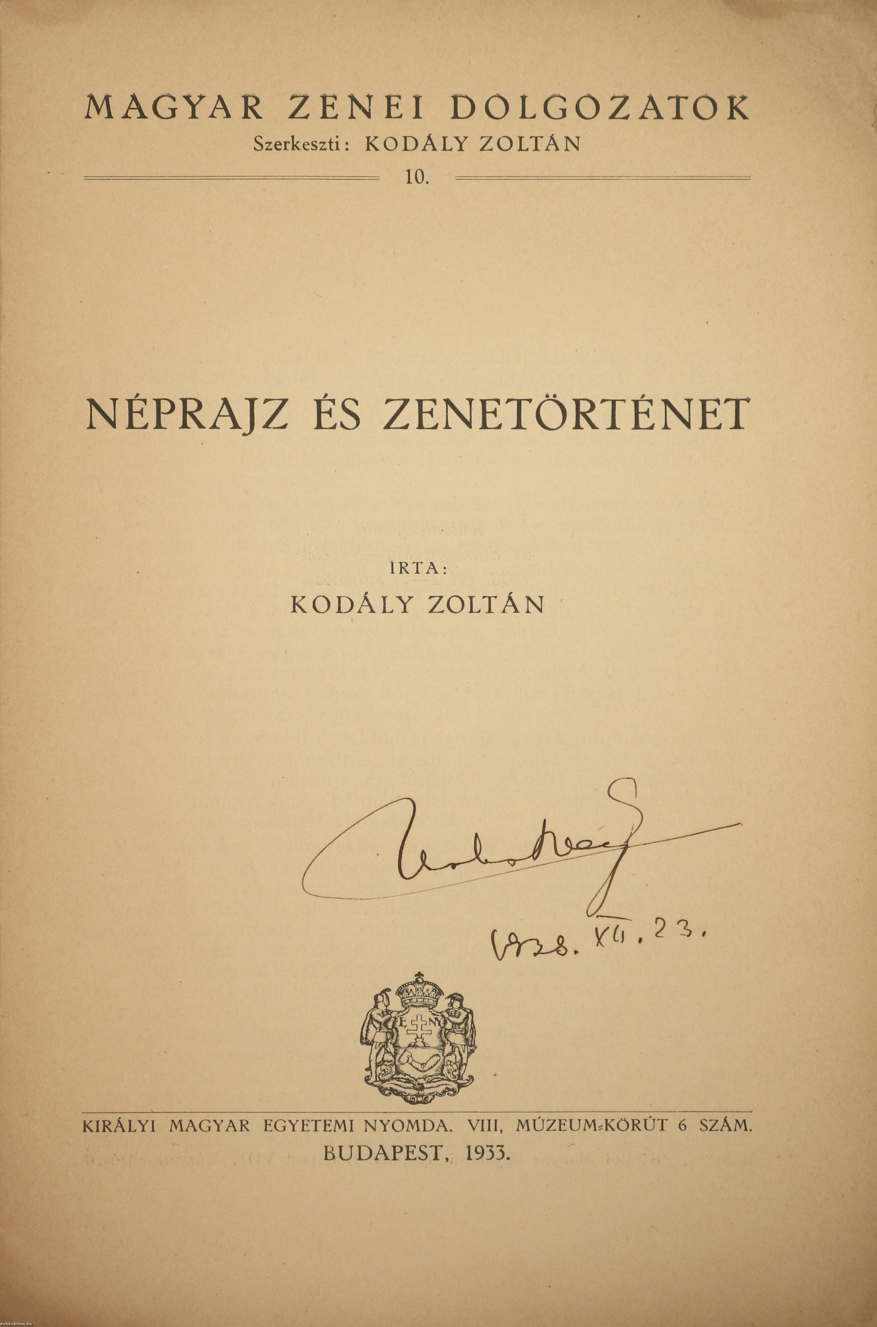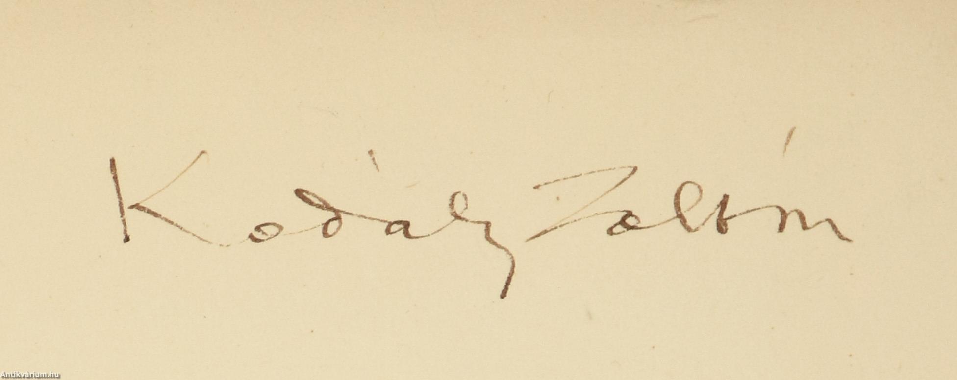A címlapon a szerző, Kodály Zoltán tollal beírt, jól olvasható aláírása látható.