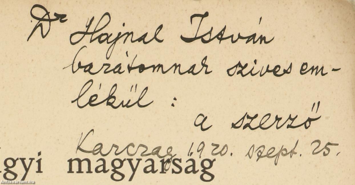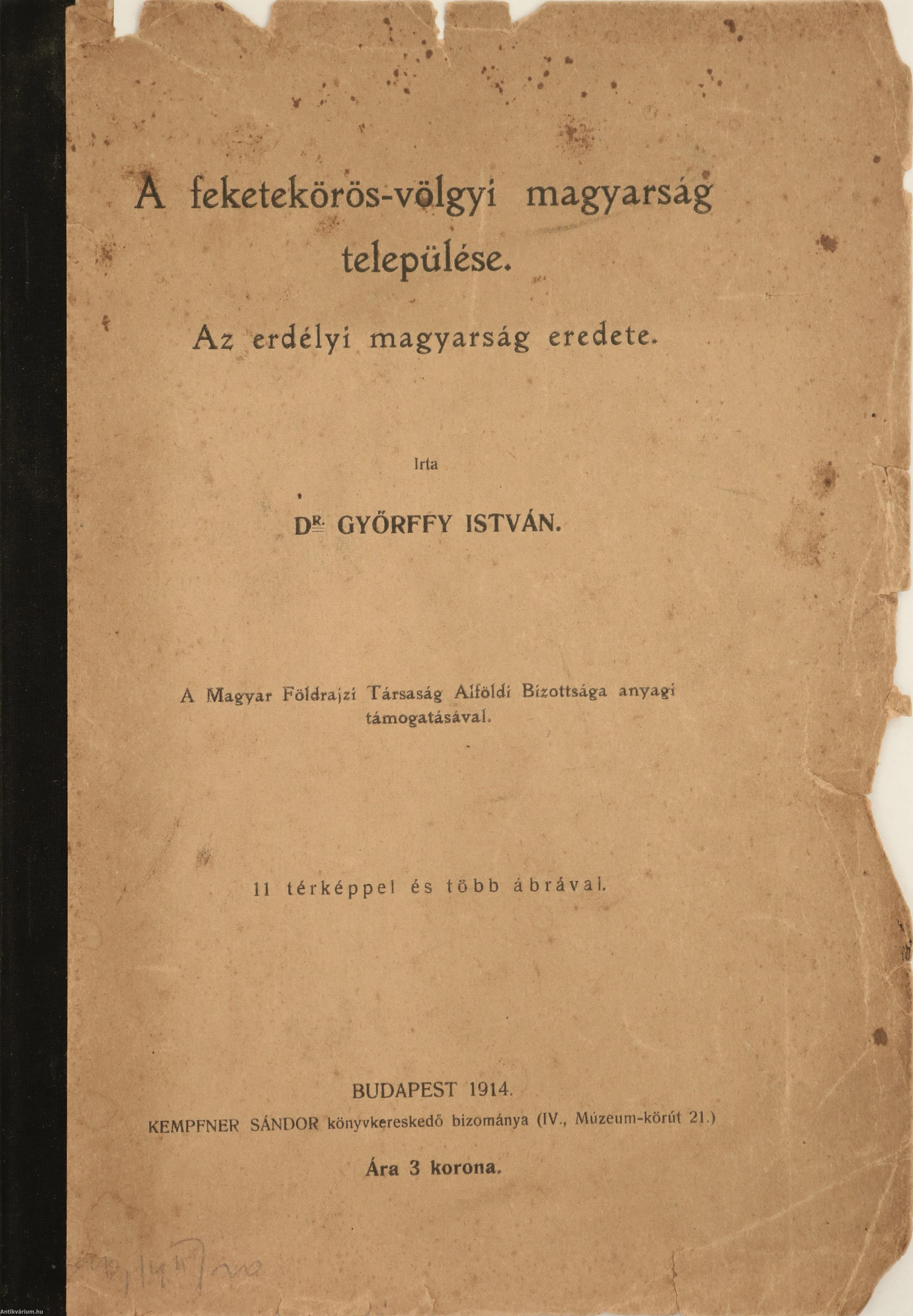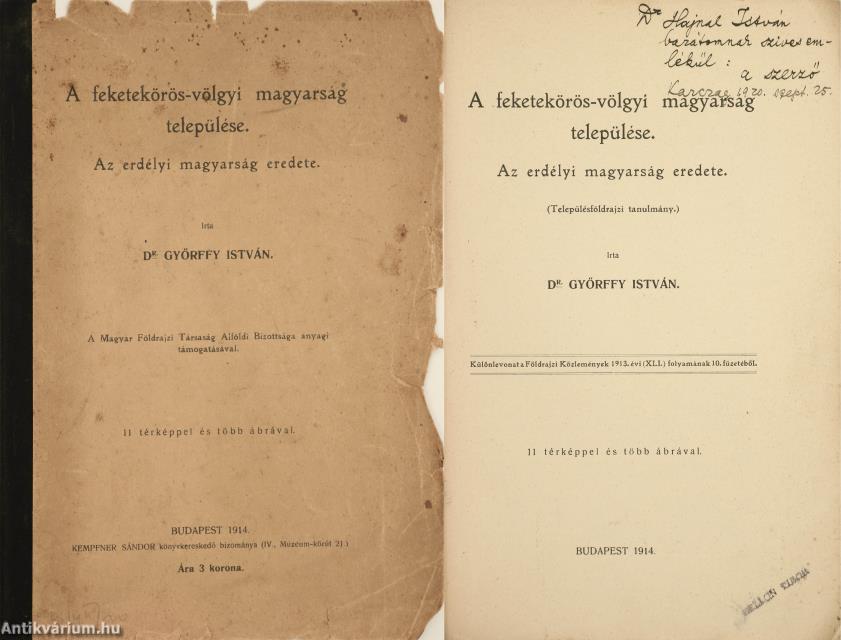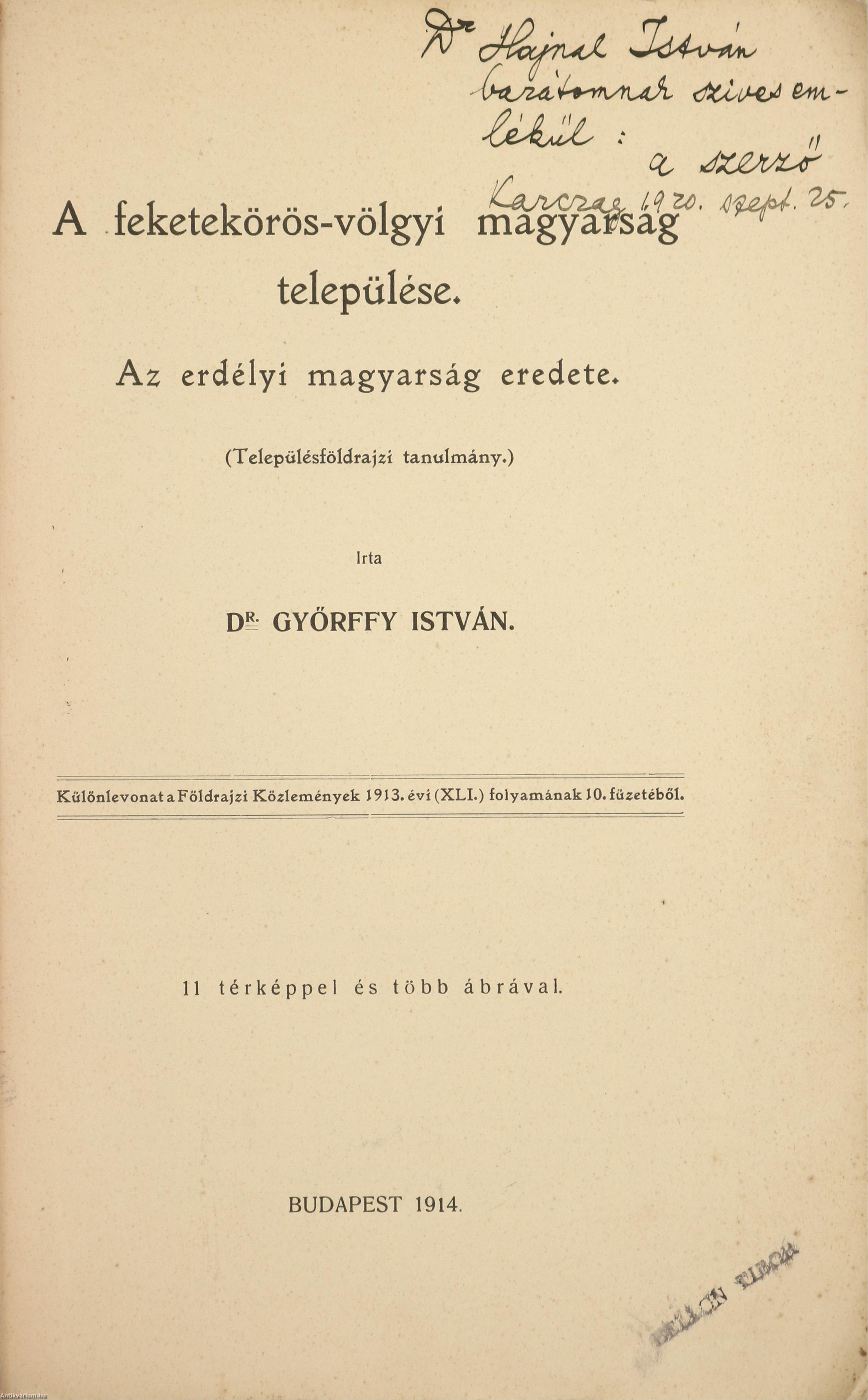 Szerző által dedikált példány. A feketekörös-völgyi magyarság települése. Az erdélyi magyarság eredete. A címlapon a szerző, Dr. Győrffy István tollal beírt, névre szóló dedikációja olvasható: "Dr. H. I. barátomnak szives emlékűl: a szerző. Karczag, 1920. szept. 25." Településföldrajzi tanulmány. Különlevonat a Földrajzi Közlemények 1913. évi (XLI.) folyamának 10. füzetéből. 11 térképpel (ebből 8 kihajtható, oldalszámozáson kívüli) és több fekete-fehér ábrával illusztrált, valamint előszóval és a források jegyzékével kiegészített kötet. A címlapon és néhány oldalon tulajdonosi bélyegzés látható. Nyomtatta Fritz Ármin Könyvnyomdája. Könyvkötői félvászon papírkötésben lévő példány feliratozott, kiadói címfedéllel, feliratozatlan könyvgerinccel és hátlappal, néhány oldalon színes ceruzás jelöléssel és aláhúzással, hiánytalan állapotban. A kötet szerzője, Szigeti és nádudvari Györffy István (Karcag, 1884. február 11. – Budapest, 1939. október 3.) magyar néprajzkutató, szakíró, egyetemi tanár, az MTA levelezőtagja. Egyetemi tanulmányait Kolozsváron és Budapesten végezte. Kolozsváron szerzett bölcsészdiplomát. A Magyar Nemzeti Múzeum gyakornoka, múzeumi segédőre, a moldvai csángók kutatója, résztvevője a félbeszakadt Lénard-féle kisázsiai expedíciónak, MNM igazgatóőre, a budapesti egyetemen a néprajz első nyilvános rendes tanára, a Táj- és Népkutató Központ vezetője, a kunság és a hajdúk, matyók néprajzi hagyományainak kutatója. A népi írók falukutató irodalmának egyik előfutára. Neve a Györffy István Kollégium és a belőle kinövő Népi Kollégiumok Országos Szövetsége (NÉKOSZ) Mozgalom révén vált ismertté Magyarországon.