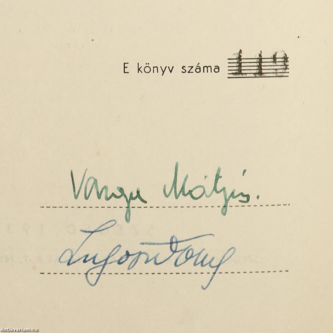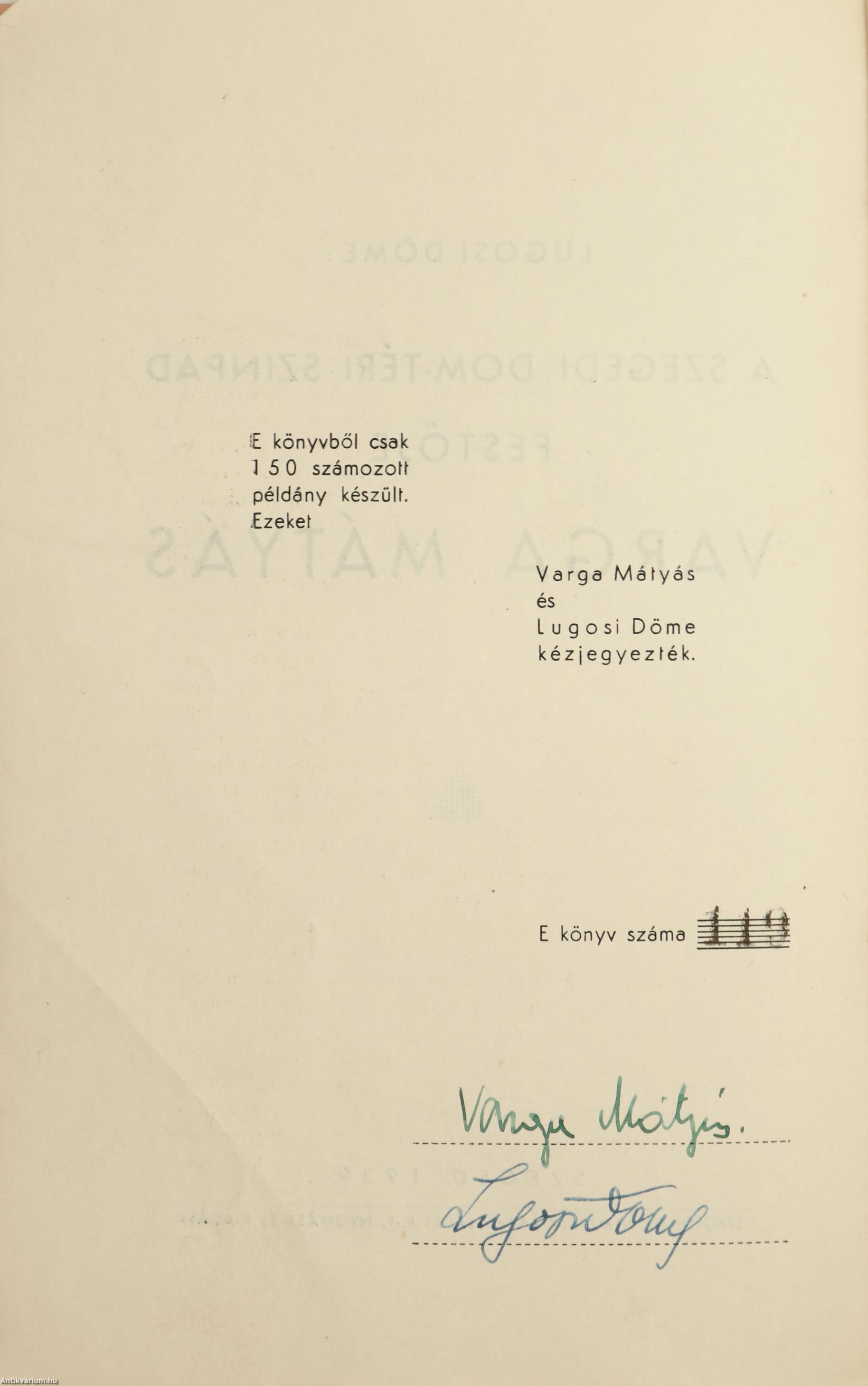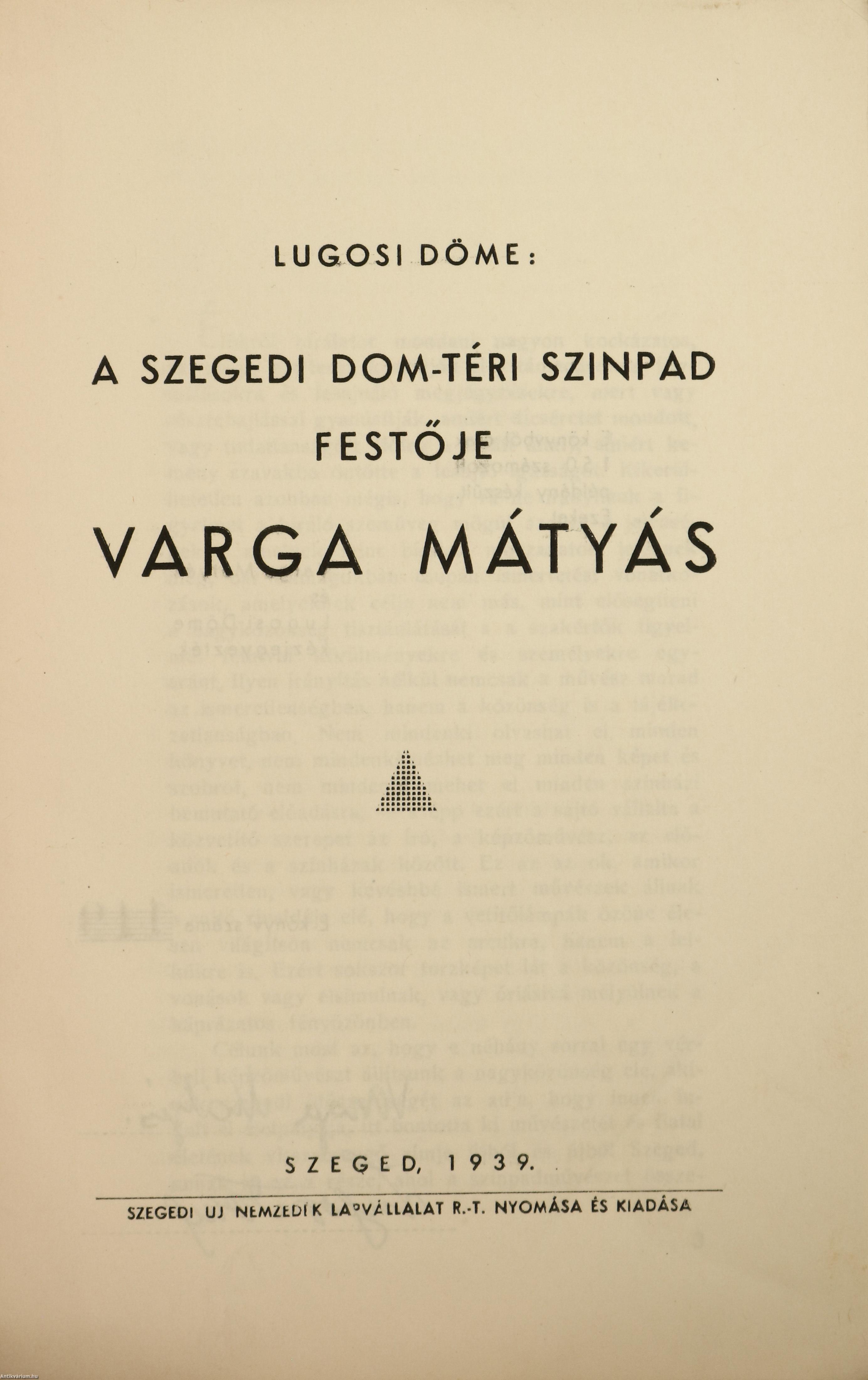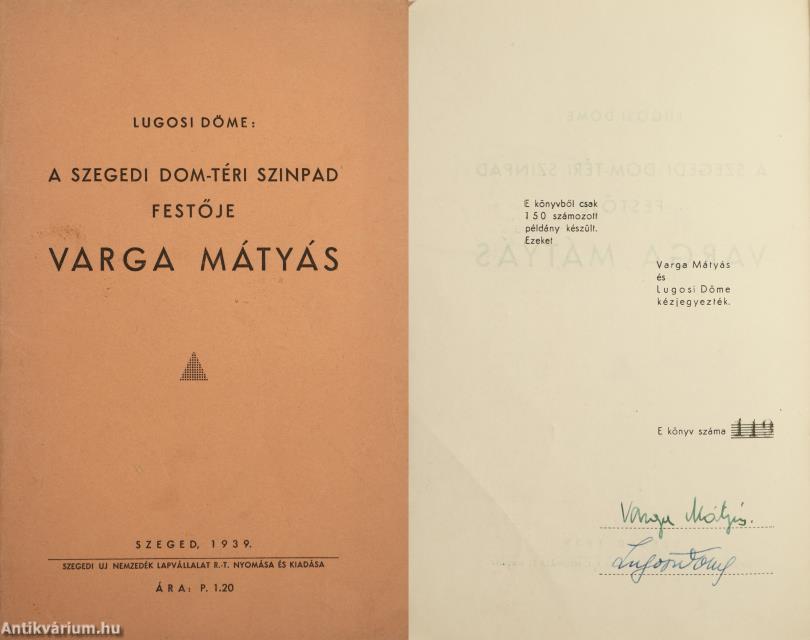 Varga Mátyás és Lugosi Döme által aláírt példány. Első, számozott, bibliofil kiadás. A szegedi Dom-téri színpad festője, Varga Mátyás. A címlap verzóján a szerző, Lugosi Döme, valamint Varga Mátyás grafikusművész tollal írt aláírása látható. "E könyvből csak 150 számozott példány készült. Ezeket Varga Mátyás és Lugosi Döme kézjegyezték". E könyv száma: 119. Szöveg közti, fekete-fehér képekkel illusztrált kötet. Nyomtatta és kiadta a Szegedi Uj Nemzedék Lapvállalat Rt., Szegeden. Kiadói tűzött papírkötésben lévő példány feliratozott címfedéllel, feliratozatlan könyvgerinccel és hátlappal, hiánytalan állapotban.