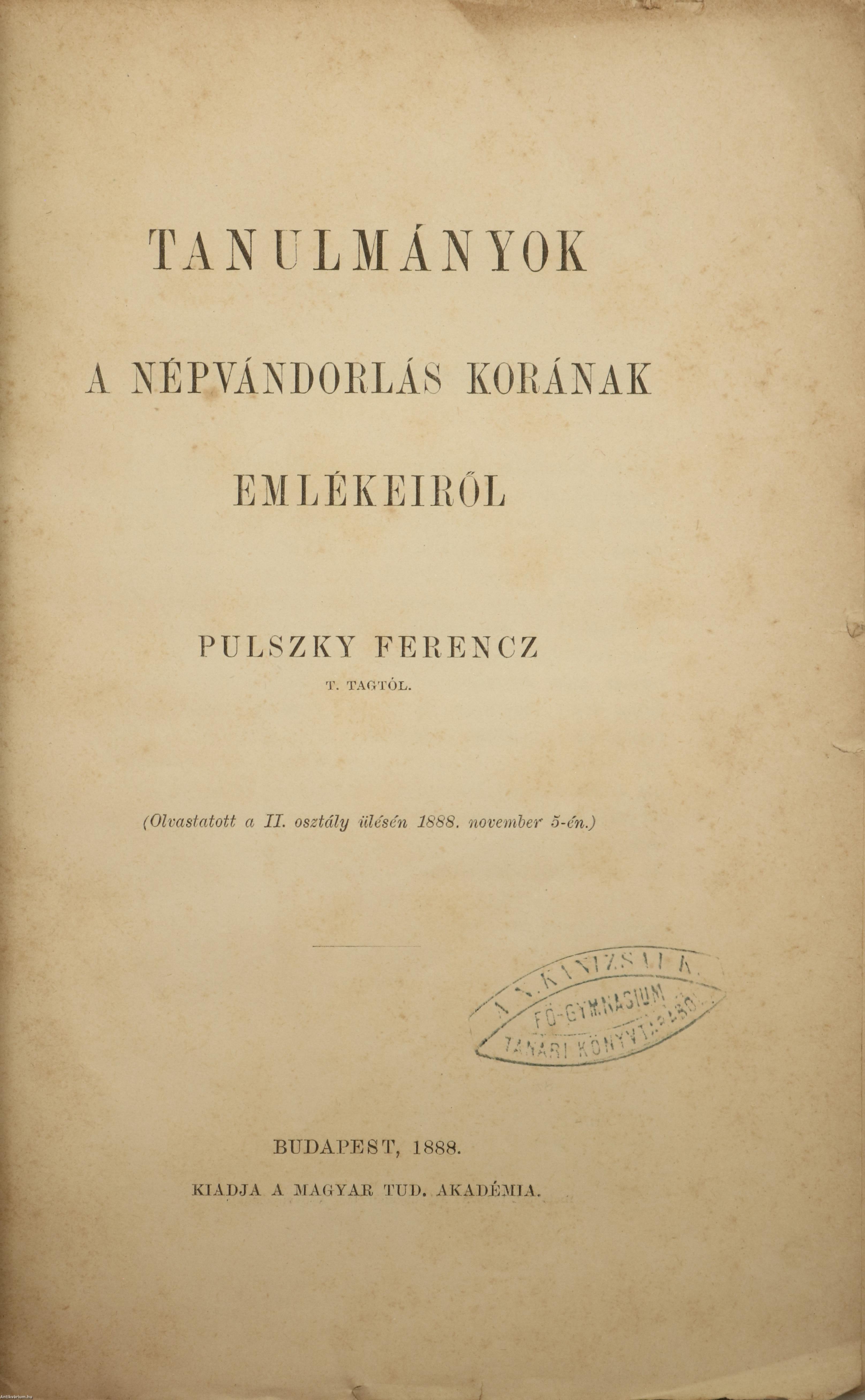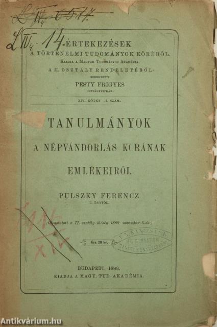 Első kiadás. Értekezések a történelmi tudományok köréből. XIV. kötet. I. szám. Kiadja a Magyar Tudományos Akadémia. A II. osztály rendeletéből szerkeszti: Pesty Frigyes osztálytitkár. Tanulmányok a népvándorlás korának emlékeiről [I]. Pulszky Ferencz t. tagtól. Olvastatott a II. osztály ülésén 1888. november 5-én. Szöveg közti, fekete-fehér rajzokkal illusztrált kötet. A címfedélen és a címlapon tulajdonosi bélyegzés, valamint az előbbin tollal írt jelzet látható. Nyomtatta az Athenaeum R. Társ. Könyvnyomdája, Budapesten. Kiadói tűzött papírkötésben lévő példány feliratozott címfedéllel, feliratozatlan könyvgerinccel, szöveges hátlappal, átlagos, hiánytalan állapotban. A kötetek szerzője, cselfalvi és lubóczi Pulszky Ferenc (Eperjes, 1814. szeptember 17. – Budapest, 1897. szeptember 9.) politikus, régész, műgyűjtő, a Magyar Tudományos Akadémia tagja. Diplomáját a Pesti Egyetem jogi karán szerezte. Magy. kir. joggyakornok, a pozsonyi országgyűlés hivatalnoka, Sáros Vármegye aljegyzője és országgyűlési képviselője, magy. kir. államtitkár, valamint az ideiglenes rendőri bizottmány tagja. Ezt követően Kossuth mellett pénzügyi, majd Esterházy Pál, a király személye körüli miniszter mellett államtitkár, illetve a Honvédelmi Bizottmány földmívelés-, ipar és kereskedelmi ügyekkel megbízott képviselője. Deák politikáját támogatta az országgyűlésben előbb Szentes, majd Szécsény város követeként. Részt vett az Esterházy-Képtár és több más külföldi gyűjtemény állami megvásárlásának előmozdításában. A Nemzeti Múzeum igazgatója, majd nyugdíjazása után a magyarországi múzeumok és könyvtárak országos főfelügyelője lett. A Régészeti Társaság, Országos Magyar Képzőművészeti Társulat, a Kisfaludy Társaság, Petőfi Társaság tagja. Ismert szabadkőműves, az olasz „Dante Alighieri” Szabadkőműves Páholy tagja. Hazatérése után aktívan részt vesz a magyarországi szabadkőművesség újjáélesztésében.