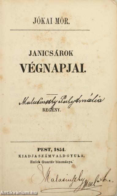 Első kiadás. Janicsárok végnapjai. Regény. Írta: Jókai Mór. Jeleni kötet A fehér rózsa c. regény második, de magában is önálló, része. Részletes tartalomjegyzékkel kiegészített kötet. A címlapon tulajdonosi bejegyzések láthatók. Nyomatott Emich Gusztávnál, Pesten. Könyvkötői félvászon kötésben lévő példány feliratozatlan, mintás címfedéllel, feliratozatlan könyvgerinccel, modern előzéklapokkal, néhány foltos lappal, feliratozatlan, mintás hátlappal. A szerző, Jókai Mór (Komárom, 1825. február 18. – Budapest, 1904. május 5.) író, újságíró, politikus, a "Márciusi Ifjak" egyike. Első regényének, a "Hétköznapok" a sikere után az írásnak szentelte az egész életét. A "Pesti Füzetek", majd az "Életképek" szerkesztője volt. Az "Életképek" az idők folyamán egyértelműen politikai lappá alakul át. Jókai ebben cikkeivel a nemzeti politikát támogatja a "Szabadság, egyenlőség, testvériség" eszméjének jegyében. Az "Életképek" után a "Pesti Hírlap" szerkesztését vállalta el, majd megindította az "Esti Lapokat", a radikálisok főorgánumát. A forradalom bukása után Jókai tevékenységét többnyire a "Vasárnapi Újságnak" szentelte, ami ugyan eszmeiségben megegyezett a nagy író gondolataival, de a lapnak politikai okokból a szerkesztője nem lehetett. A 19. századi magyar irodalom rendkívüli népszerűséget elérő, nagy regényírója volt, gazdag és tartalmas életművet hagyott hátra. Regényeinek befogadását, értelmezését a keletkezésüktől az utóbbi évtizedekig a realista és a romantikus stílus kettőssége határozta meg; e két irodalmi stílus ötvözése tette Jókait "a magyar nemzet íróóriásává".