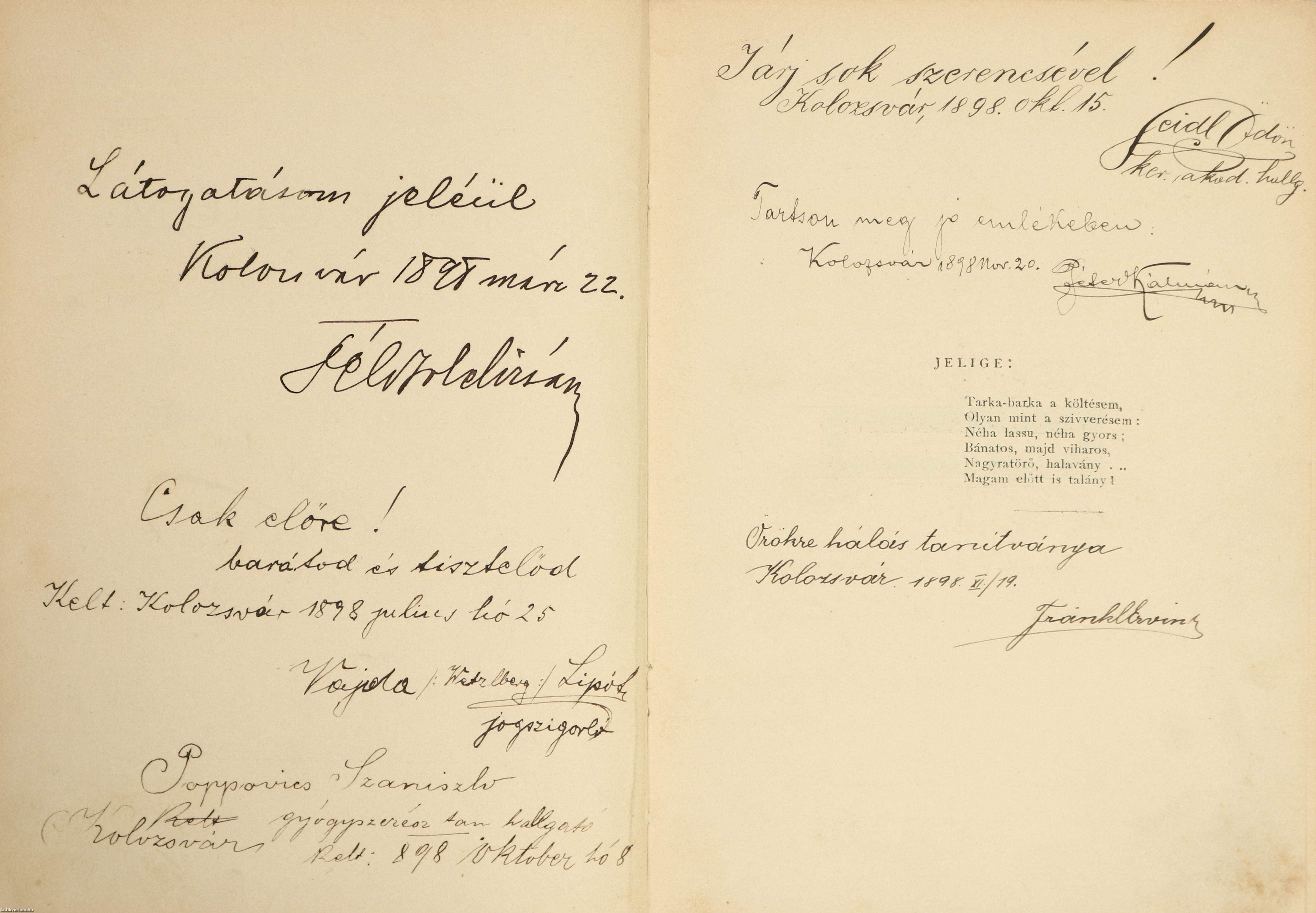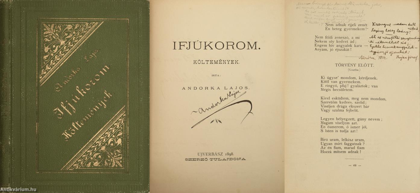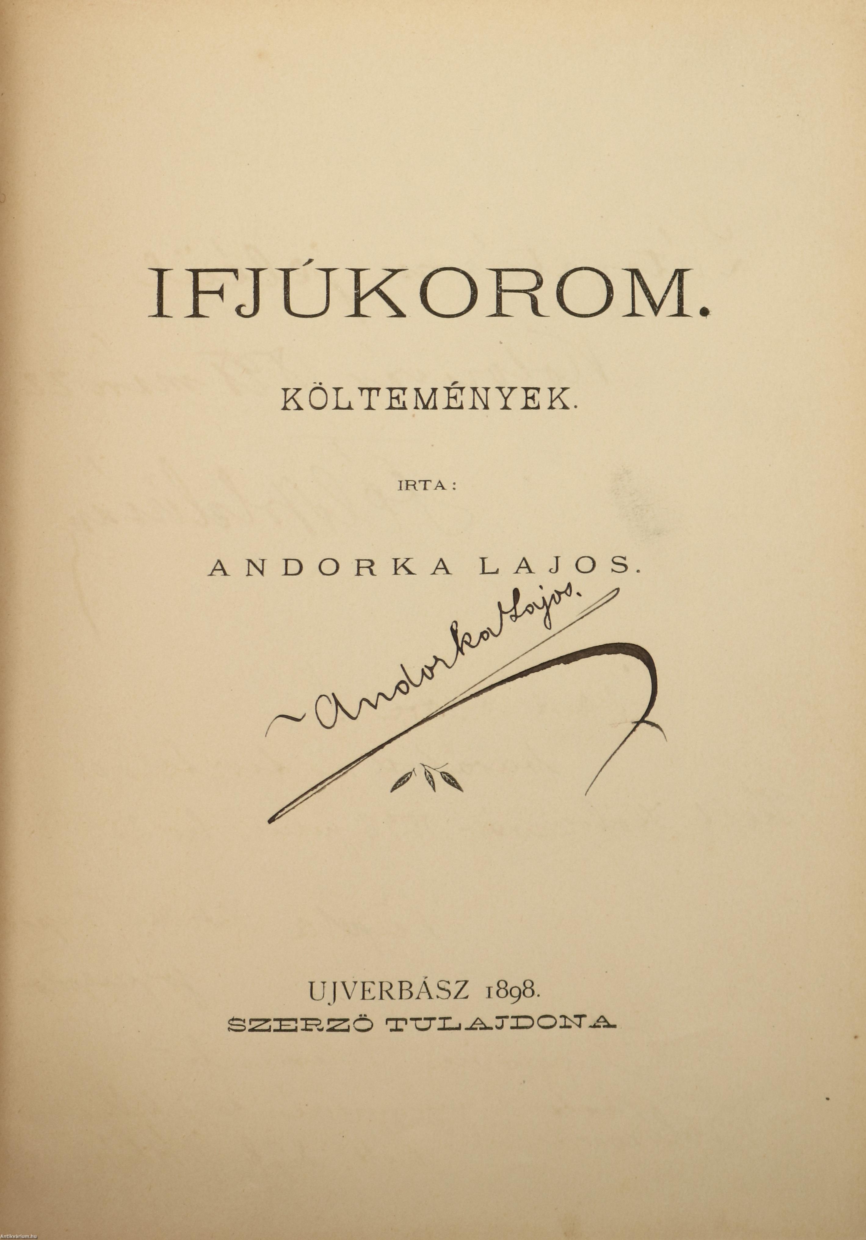 Szerző által aláírt példány. Első kiadás. Ifjúkorom. Költemények. Írta: Andorka Lajos. A címlapon a szerző, Andorka Lajos tollal beírt, jól olvasható aláírása látható. Részletes tartalomjegyzékkel kiegészített kötet. A címlap hátoldalán és a harmadik oldalon többnyire kolozsvári hallgatók kézzel írt sorai olvashatók. Nyomtatta a Verbászi Könyvnyomda. Kiadói egészvászon kötésben lévő példány aranyozott feliratozású, aranyozott motívumokkal díszített, dombornyomott keretezéssel ellátott címfedéllel, aranyozott feliratozású könyvgerinccel, feliratozatlan, dombornyomott keretezéssel ellátott hátlappal, mintázott, címfedél felől sérült kiadói előzéklapokkal, aranyozott lapélekkel, a szöveg között néhány német és magyar nyelven írt idézettel, hiánytalan állapotban. A kötet szerzője, Andorka Lajos /szül. Scherer Lajos/ (Óverbász, 1874. szeptember 16. - Szeged, 1957. február 16.) költő, helytörténész, lapszerkesztő. 1894 és 1898 között a Kolozsvári Magyar Királyi Ferenc József Tudományegyetem hallgatója volt. 1900-tól Losoncon tanított, majd 1921-ben megindította A Mi Lapunk című cserkész- és diáklapot, ami az 1920-as évek végén a Sarló mozgalom szócsöve lett. 1945-ben Magyarországra került, ahol Nagymaroson, Bihartordán és Kiszomboron élt. Több tankönyv és művelődéstörténeti írás szerzője volt. Tanulmányai, cikkei a Prágai Magyar Hírlap, a Magyar Tanító és a losonci lapok hasábjain jelentek meg.