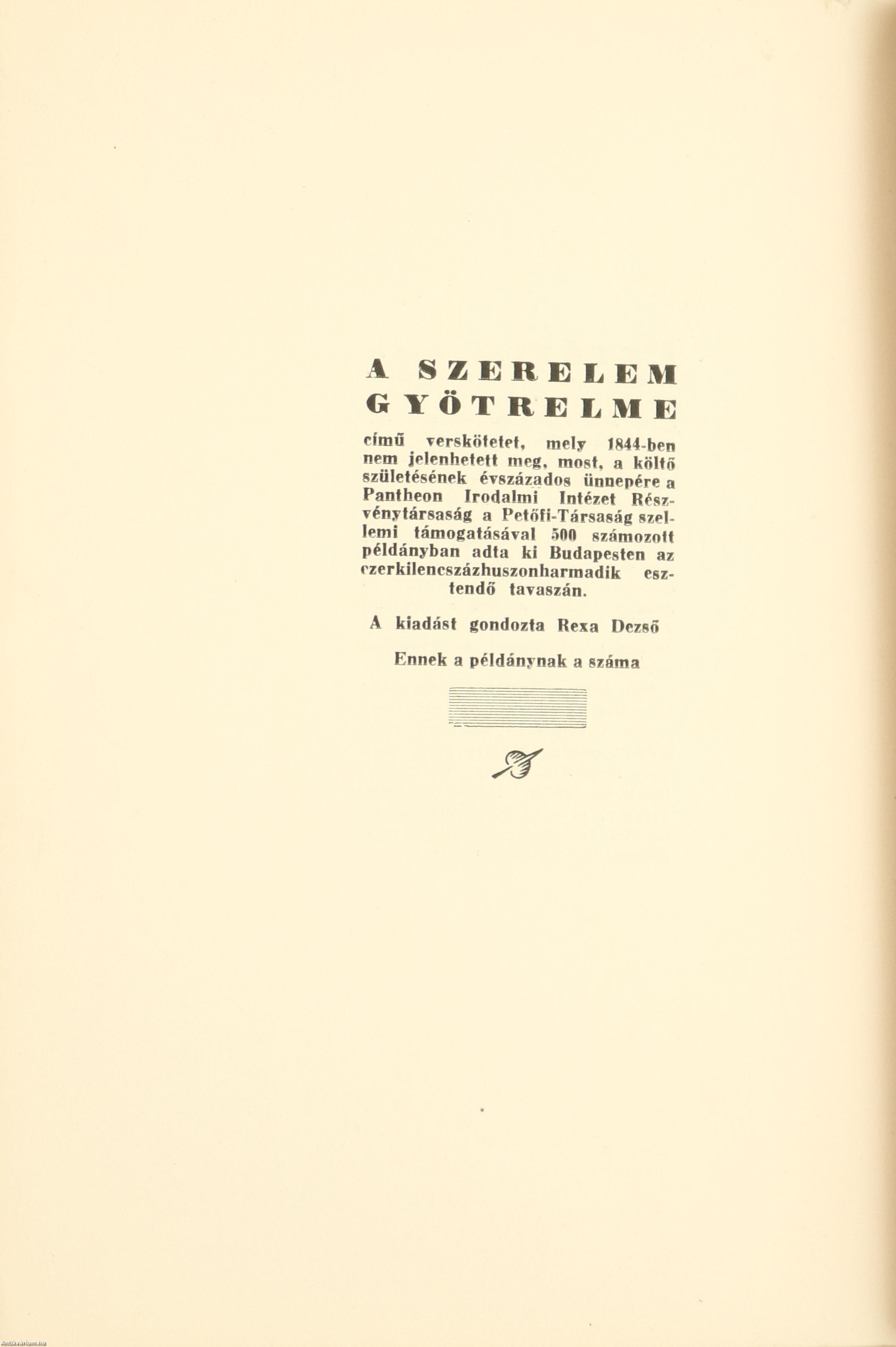 "A Szerelem gyötrelme című verseskötetet, mely 1844-ben nem jelenhetett meg, most, a költő születésének évszázados ünnepére a Pantheon Irodalmi Intézet Részvénytársaság a Petőfi-Társaság szellemi támogatásával 500 számozott példányban adta ki Budapesten az ezerkilencszázhuszonharmadik esztendő tavaszán. A kiadást gondozta Rexa Dezső". Jelen példány számozásának helye kitöltetlen.