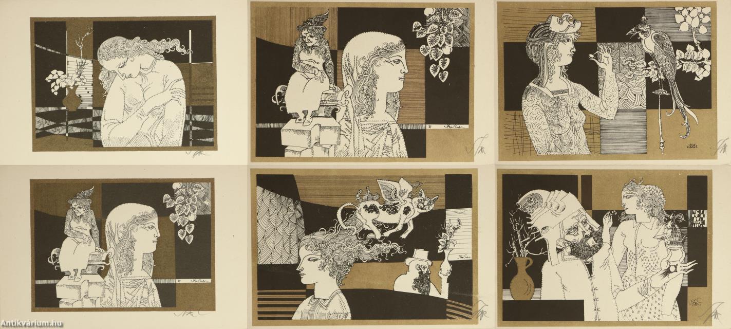 Szász Endre grafikáival illusztrált, szétnyitható (belső oldalaikon üres) emléklapok. A képes oldalon a művész a lapok mindegyikét saját kezű, ceruzás aláírásával látta el.
