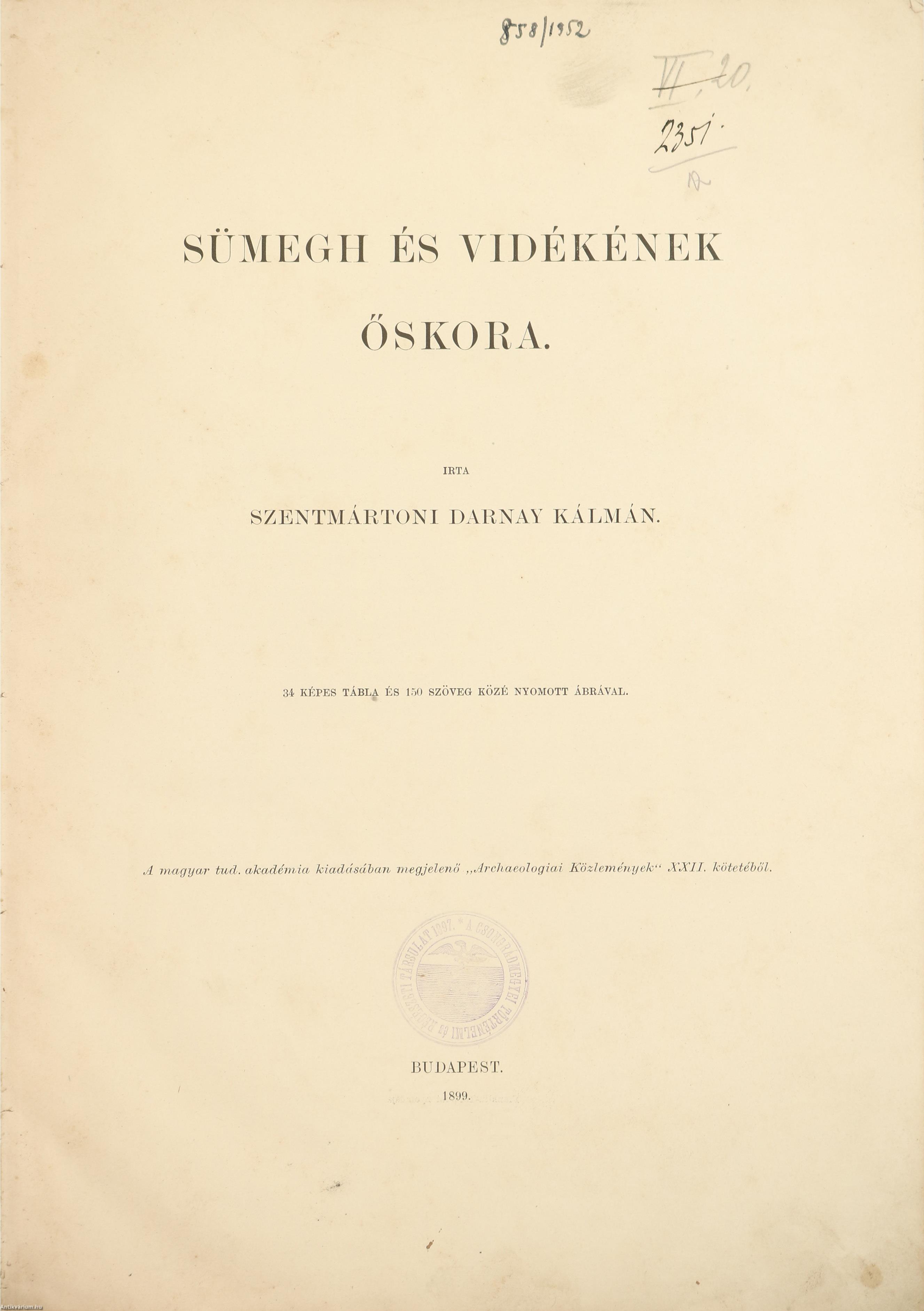 Sümegh és vidékének őskora. Írta: Szentmártoni Darnay Kálmán. A magyar tud. akadémia kiadásában megjelenő "Archaeologiai Közlemények" XXII. kötetéből. 34 képes tábla és 150 szöveg közé nyomott ábrával illusztrált, valamint bevezetéssel és tartalomjegyzékkel kiegészített kötet. A címlapon tulajdonosi bélyegzés és tollal írt jelzetek, a címfedél belső oldalán nehezen olvasható tollal írt feljegyzés látható. Nyomtatta a Franklin-Társulat Nyomdája. Könyvkötői félvászon kötésben lévő példány, feliratozatlan, mintás, számjezéses ragasztott címkékkel ellátott címfedéllel, aranyozott feliratozású, könyvgerinccel, feliratozatlan, mintás hátlappal, hiánytalan állapotban. A kötet szerzője, Darnay Kálmán (Sümeg, 1864. május 11. – Sümeg, 1945. július 3.) régész, muzeológus, író, magyar királyi tanácsos, kormányfőtanácsos. A Kereskedelmi Akadémiát Grazban végezte. Majd Ausztriában és Németországban múzeumokat és régiségboltokat keresett fel. A kereskedői pályát választotta, de minden szabadidejét a régészetnek szentelte. Rövid időn belül hatalmas régiséggyűjtemény tulajdonosa lett. Gyűjteményét folyamatosan feldolgozta és rendszerezte. Régészeti megfigyeléseit korabeli szakfolyóiratokban (Archaelogiai Értesítő, Archaeologiai Közlemények, Múzeumi és Könyvtári Értesítő, Zalai Közlöny) is publikálta. Az Országos Régészeti és Embertani Társulat igazgatói választmányának tagja volt. Régészeti leletekből álló gyűjteményét az államnak ajándékozta (1907) és az abból létrejött múzeumnak lett az igazgatója.