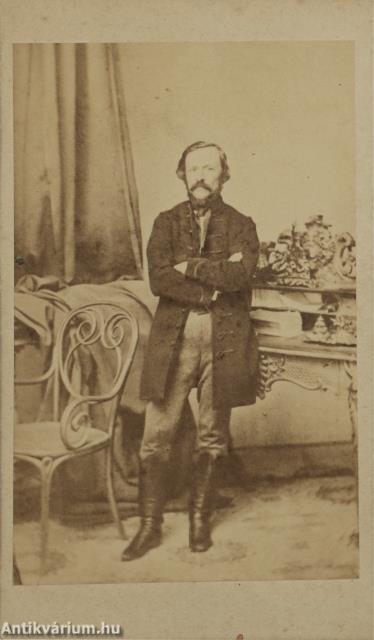 Eötvös József 9 cm x 5,6 cm nagyságú, fekete-fehér fotóportréja egy 10 cm x 6 cm-es keménypapír hátlapra ragasztva.