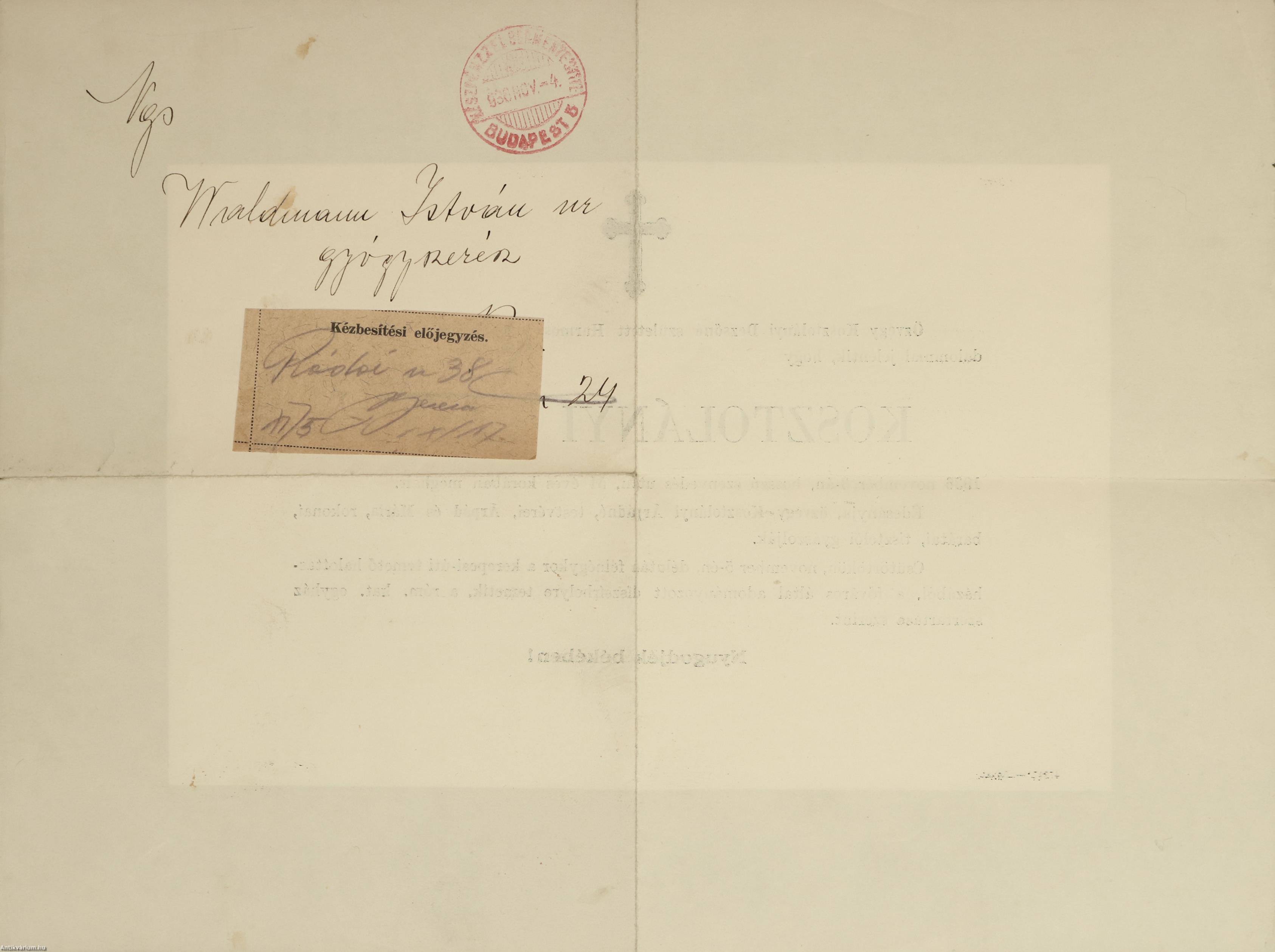 Fekete keretbe foglalt, hajtogatott, jó állapotú gyászjelentés, kézzel címzett, postai bélyegzővel és ragasztott kézbesítési előjegyzés feliratozású címkével ellátott hátlappal.