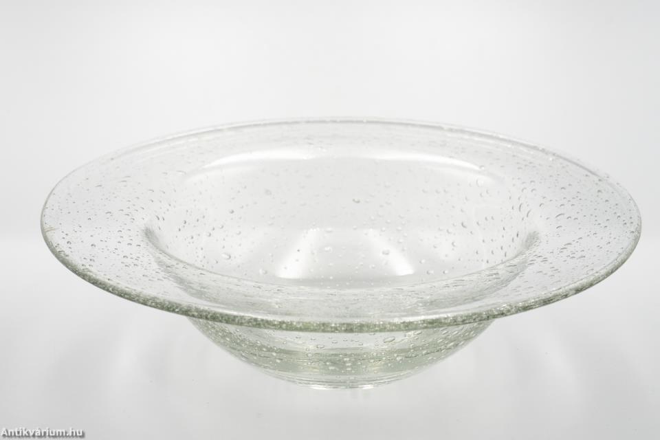 Hibátlan állapotú, fújt és kézzel formázott skandináv színtelen üveg tál, amely a 20. század második felében készült. A vastagfalú tál üvegrétegét esetleges elrendezésű, szabálytalan formájú és méretű légbuborékok díszítik. Harmonikus formavilágú, diszkrét mintázatú, egyszínű üveg alkotás, amely egyszerre foglalja magában a hagyományos formák és a kézi üvegfújási technikák kombinációját, annak minden egyediségével és letisztultságával.