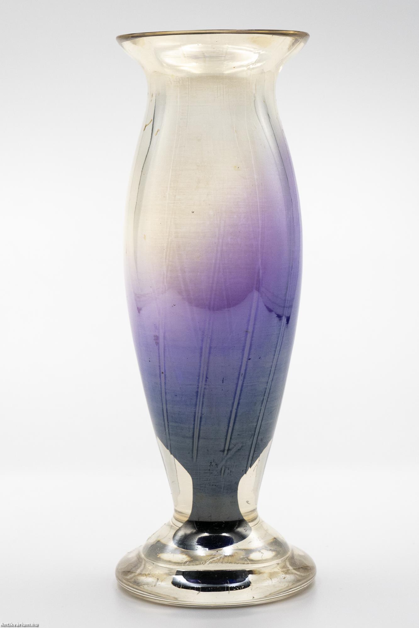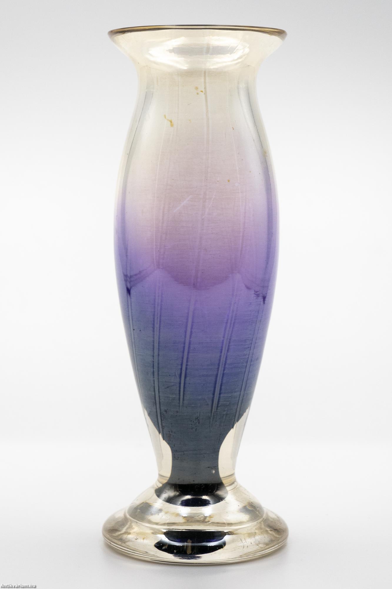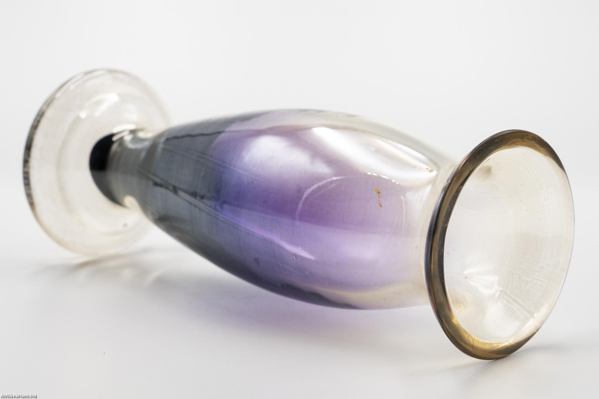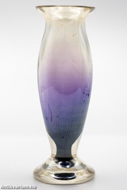 Hibátlan állapotú, fújt és kézzel formázott, lila üveg váza a 20. század első feléből. A mély lilából induló színátmenetes üveg váza teljes felületét csillogó hatású lüszterezett réteg borítja. A talapzaton álló üveg váza szimmetrikusan formázott, azonos mérető perem és talp résszel. Baluszter váza, amely a kifelé domborodó testű, kiszélesedő peremű és talapzatú vázák jellemzésére utal. A balluszter váza különböző anyagból készült vázák egyik leggyakoribb formája. Elegáns, szecessziós hangulatú üveg váza.