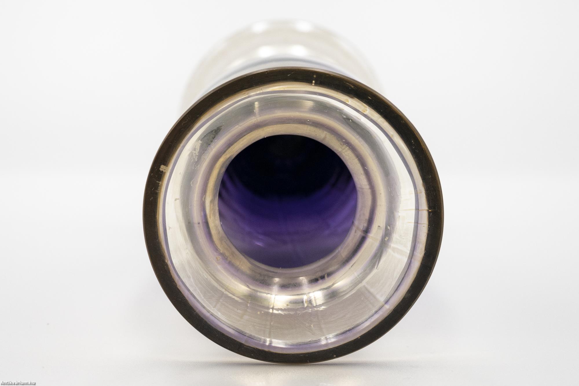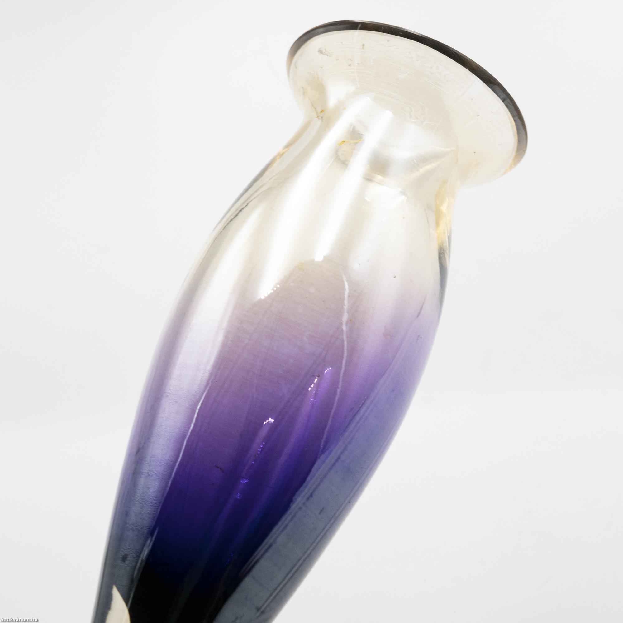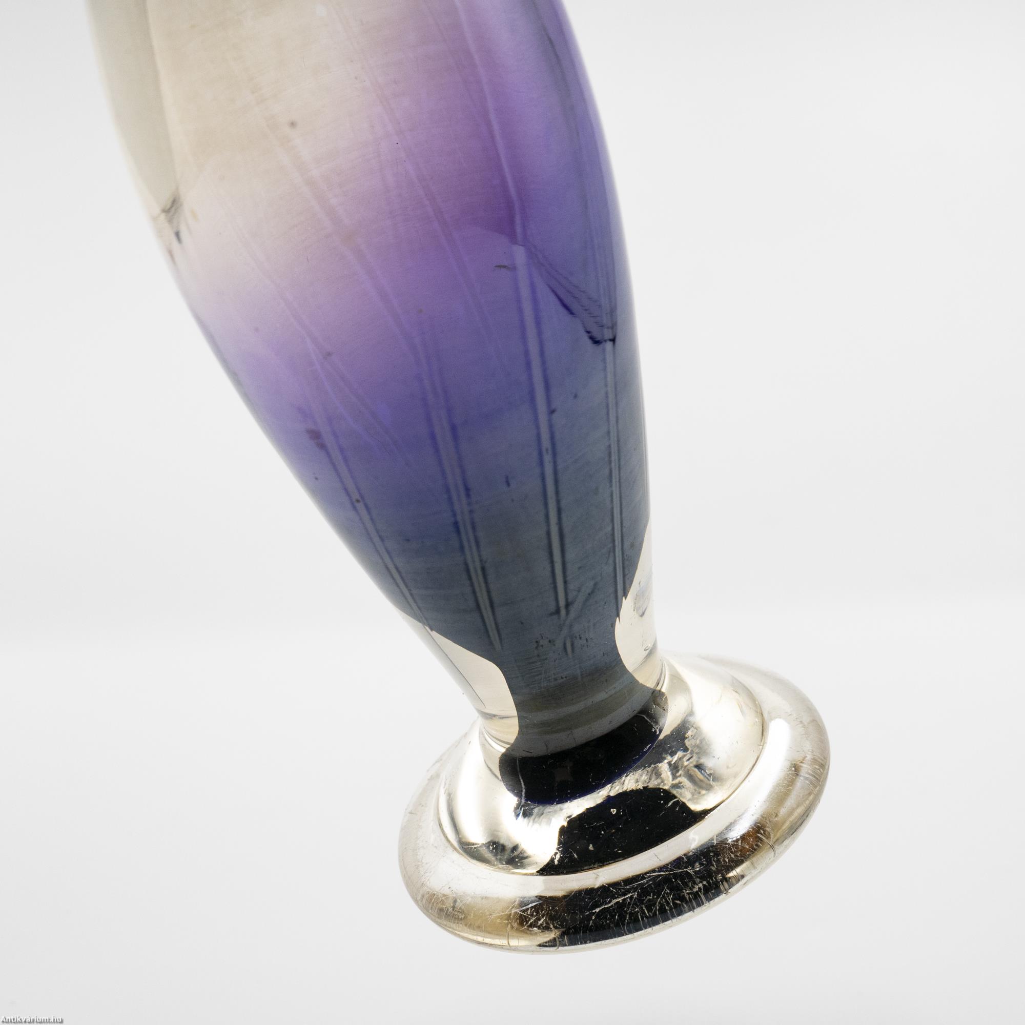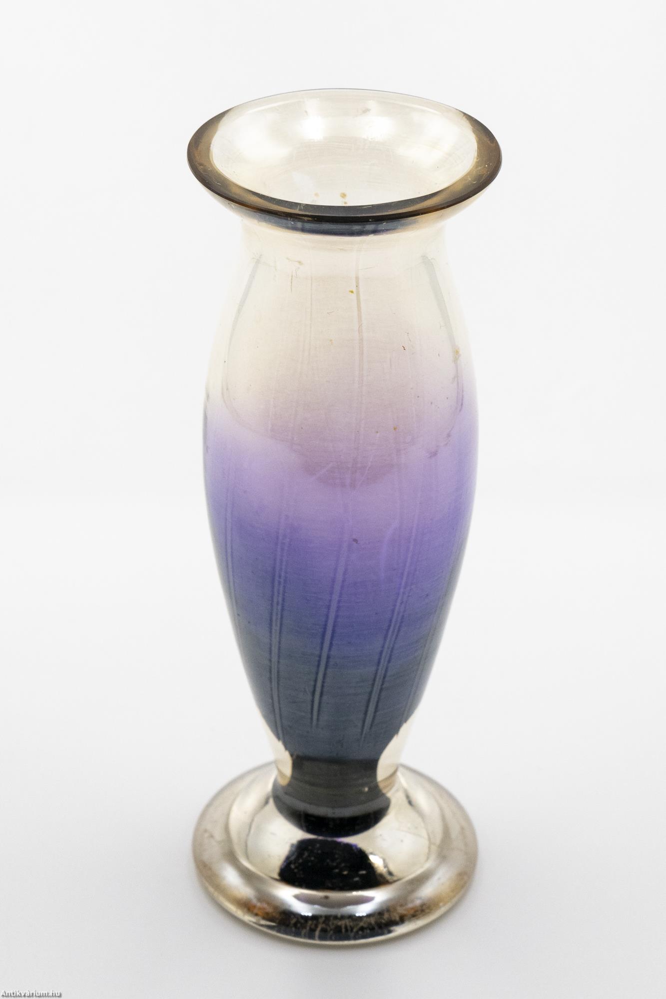 Hibátlan állapotú, fújt és kézzel formázott, lila üveg váza a 20. század első feléből. A mély lilából induló színátmenetes üveg váza teljes felületét csillogó hatású lüszterezett réteg borítja. A talapzaton álló üveg váza szimmetrikusan formázott, azonos mérető perem és talp résszel. Baluszter váza, amely a kifelé domborodó testű, kiszélesedő peremű és talapzatú vázák jellemzésére utal. A balluszter váza különböző anyagból készült vázák egyik leggyakoribb formája. Elegáns, szecessziós hangulatú üveg váza.