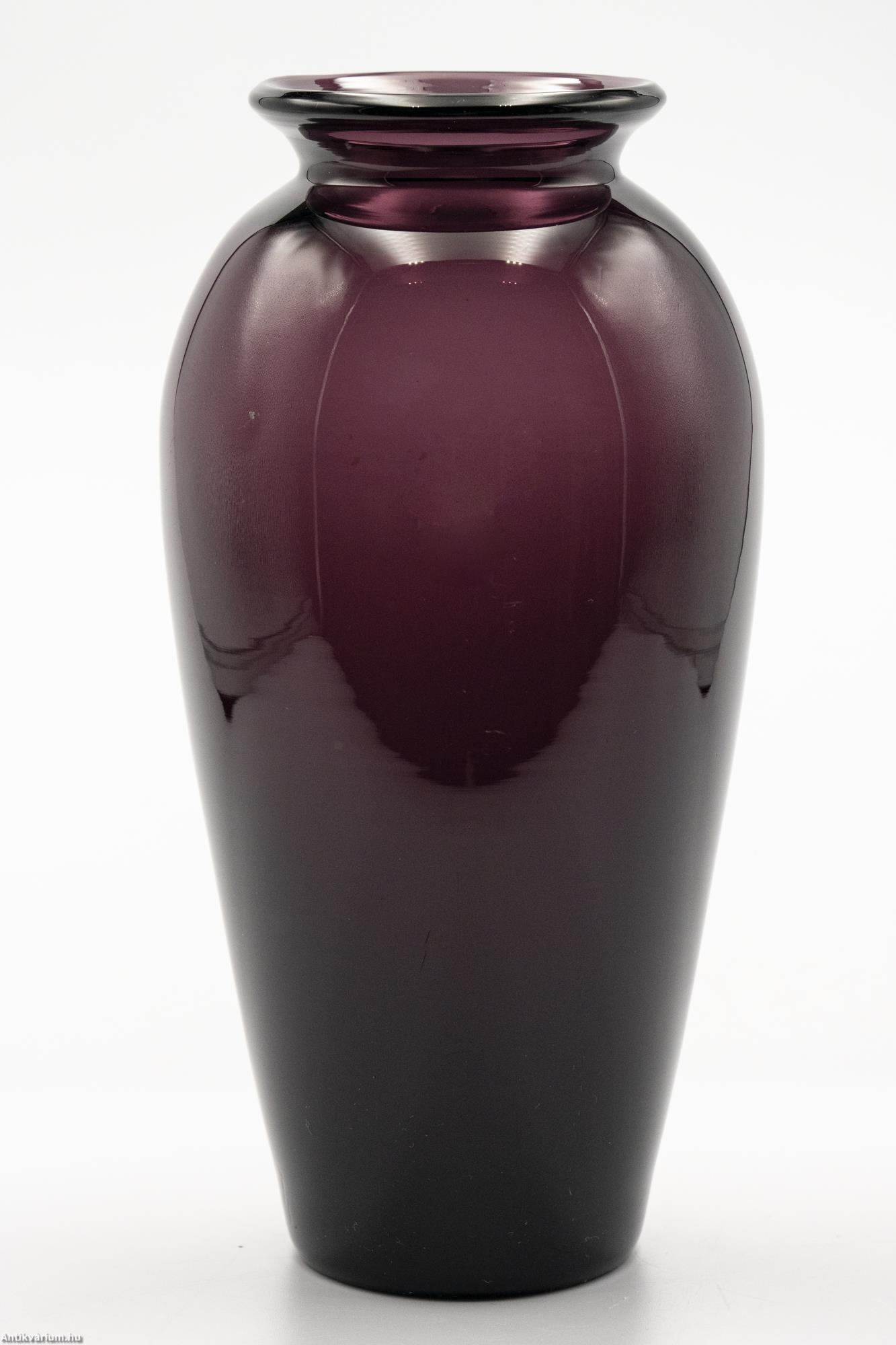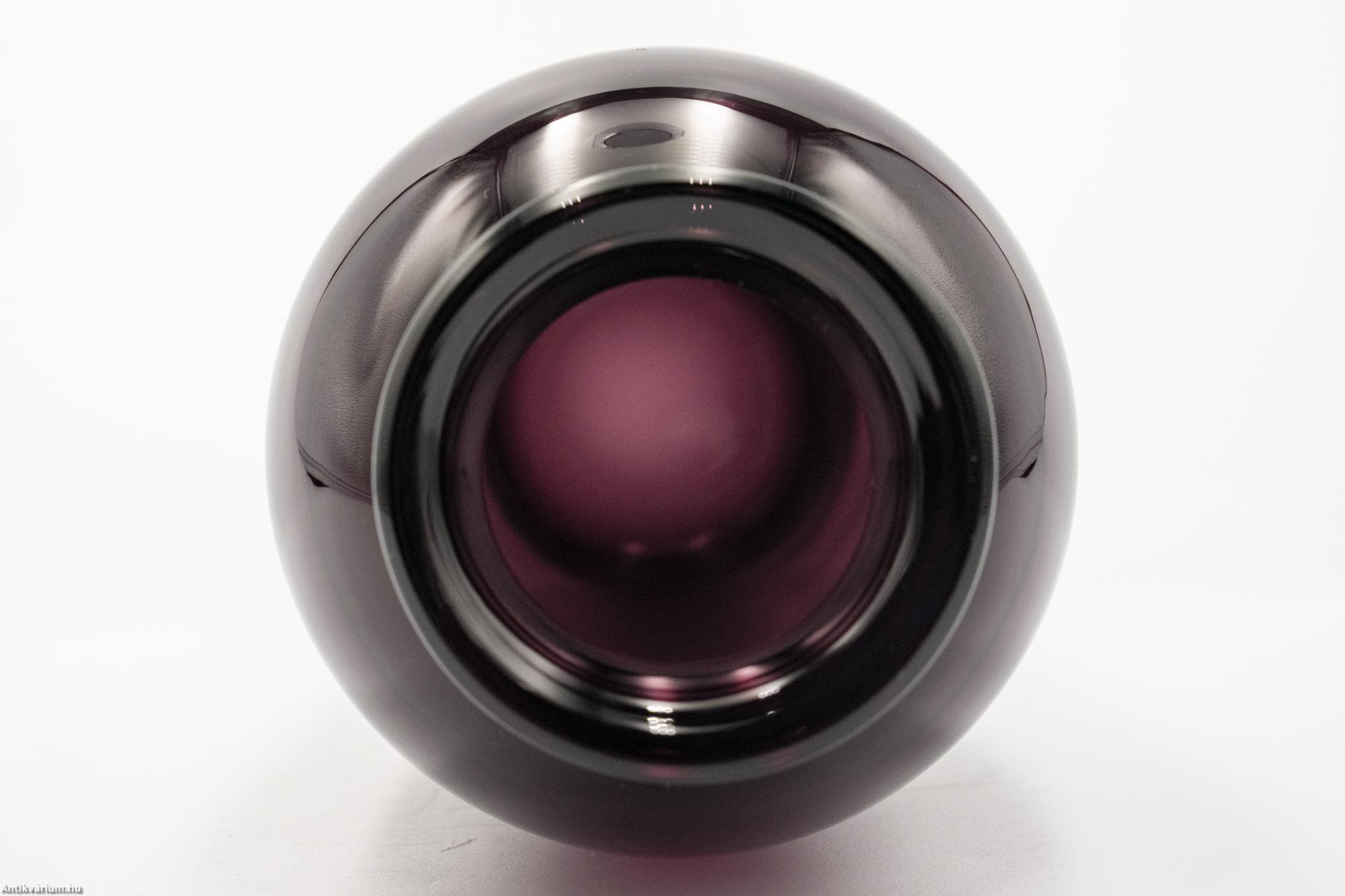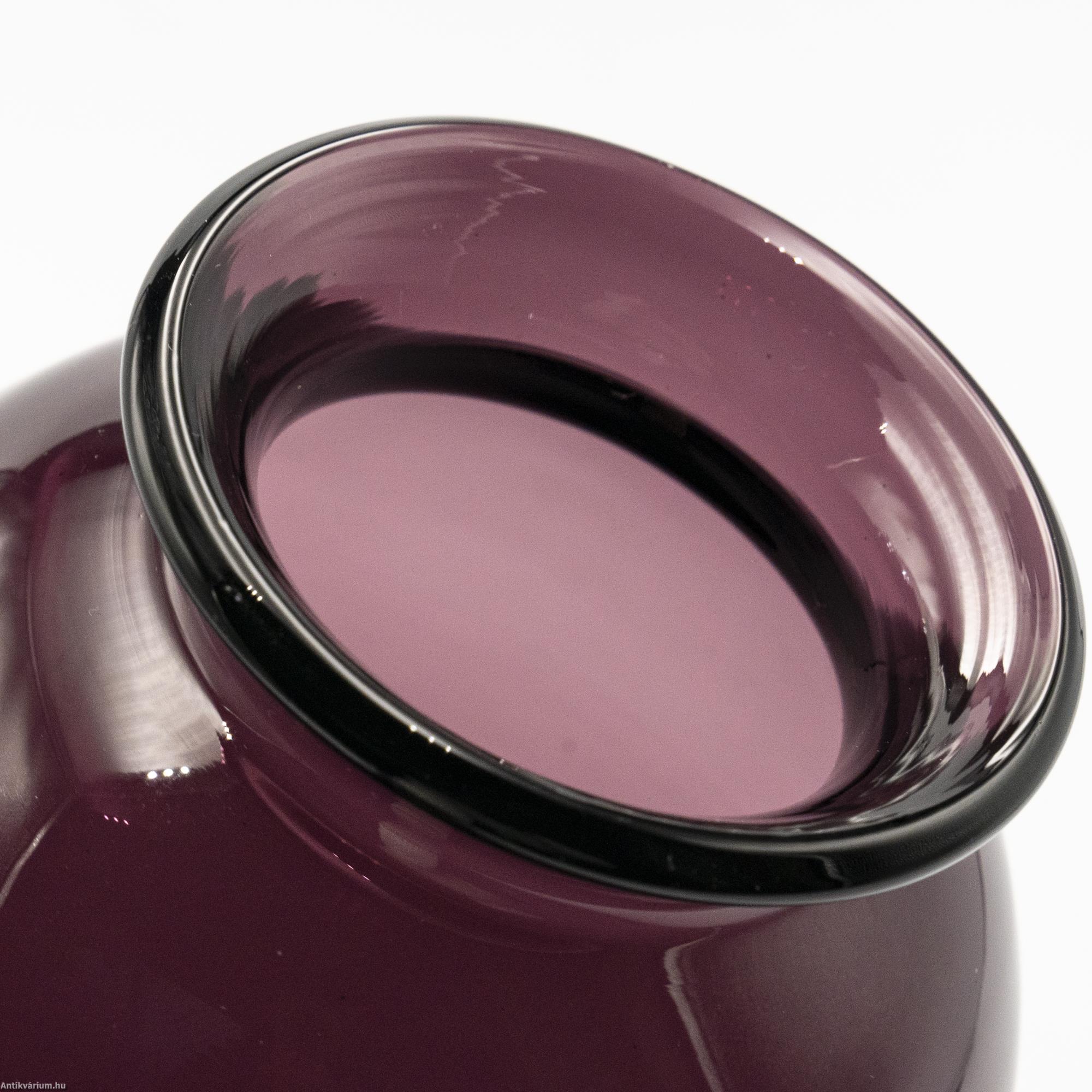 Hibátlan állapotú, fújt és kézzel formázott Moser stílusú lila üveg váza a 20. század első feléből. Letisztult geometriai formát és monokróm színhasználatot megjelenítő alkotás. Elegánsan légies megjelenését legömbölyített sziluettje és arányos vonalvezetése adja. Talpán a fújás helye körkörösen kicsiszolt.