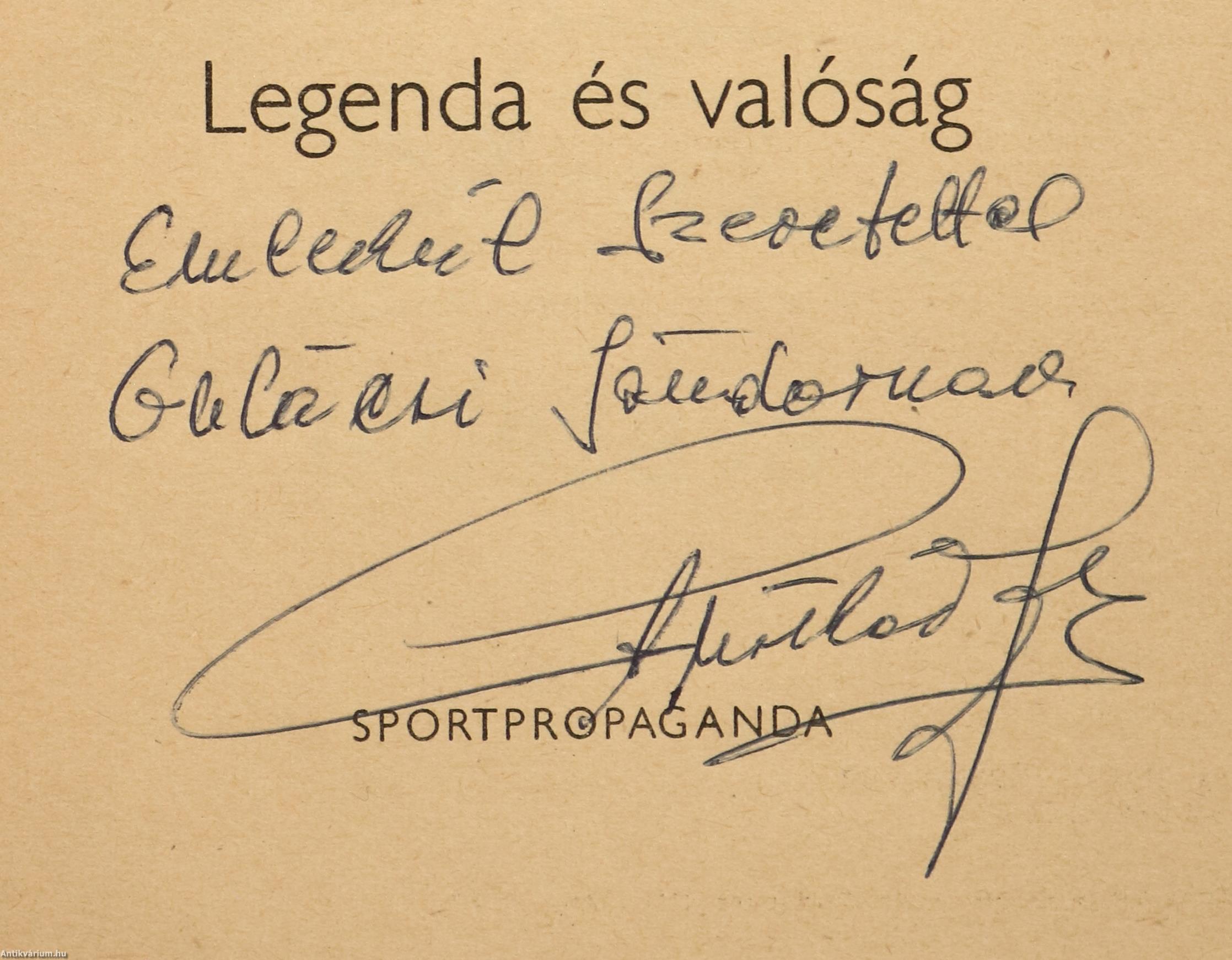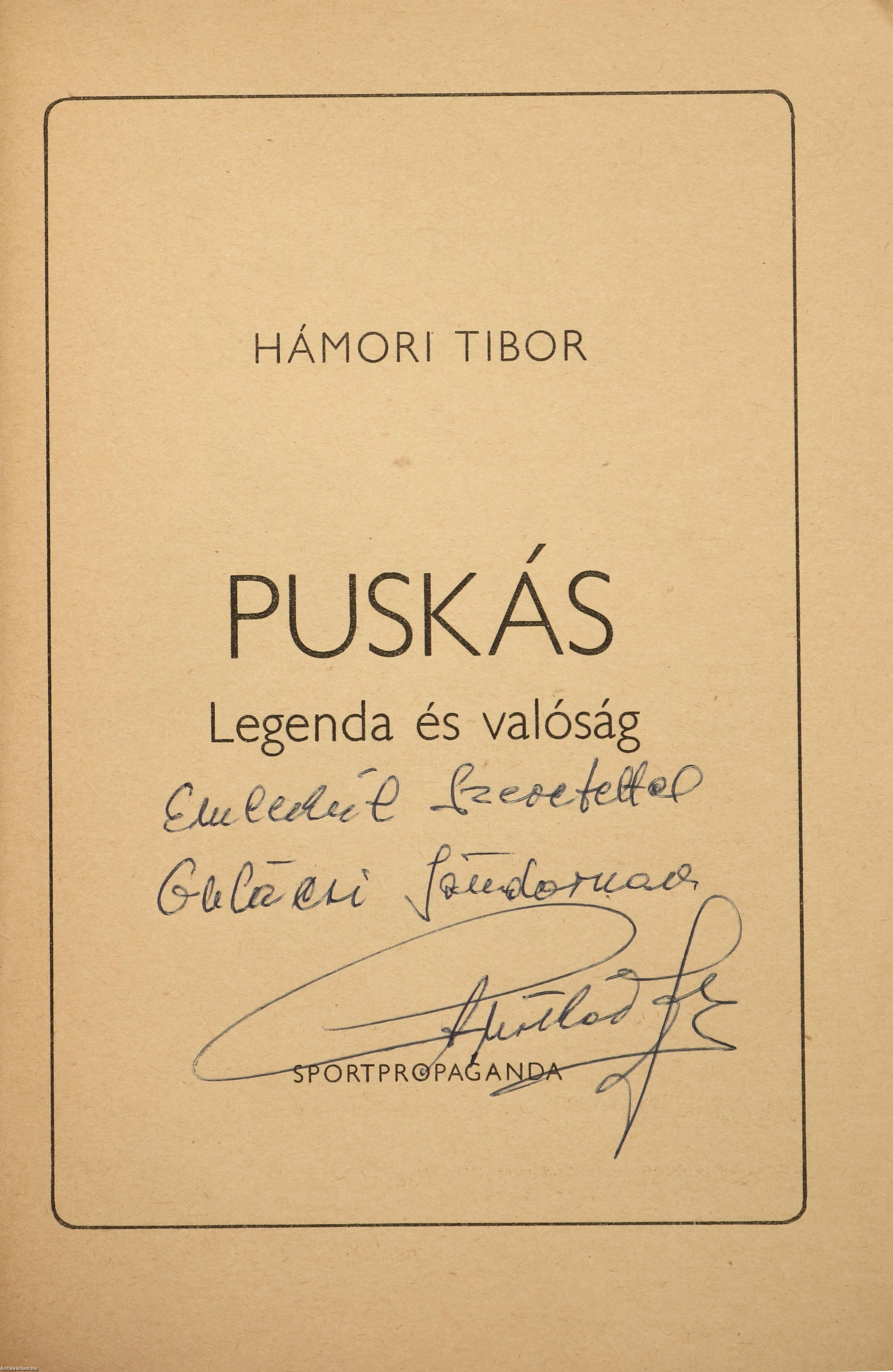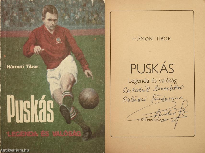 Puskás Ferenc olimpiai bajnok labdarúgó által dedikált példány. Első kiadás. Puskás. Legenda és valóság. Írta: Hámori Tibor.