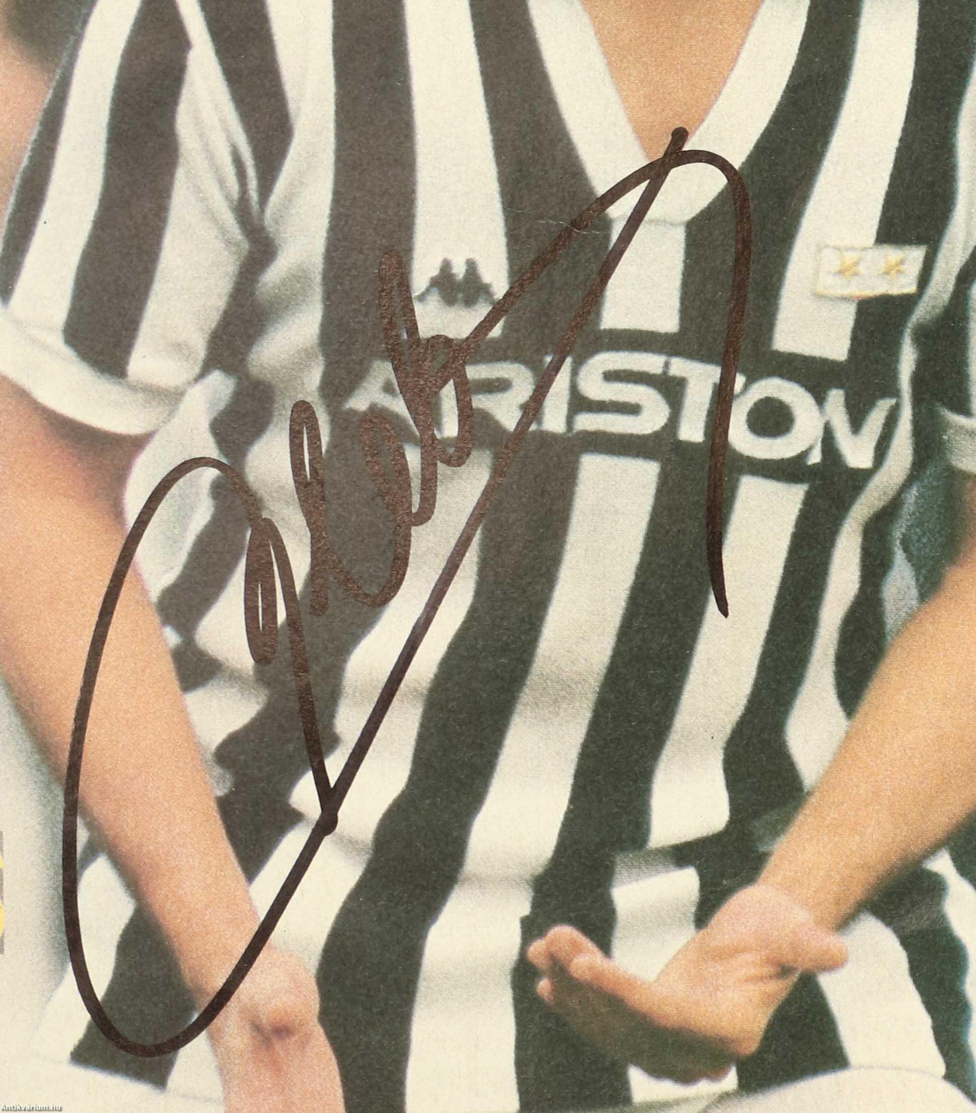 A lapot aláírta, Michel Platini (Jouf, 1955. június 21. – ) Európa-bajnok francia labdarúgó, edző, sportdiplomata, az UEFA elnöke (2007–2015). Hosszú pályafutása során közel hétszáz hivatalos mérkőzésen játszott és ezeken összesen 368 gólt lőtt. 1976 és 1987 között tagja volt a francia válogatottnak, mely 1984-ben Európa-bajnokságot nyert, ahol ő lett a legjobb és a legtöbb gólt szerző játékos. Részt vett az 1978-as, 1982-es, és az 1986-os világbajnokságon is. Platini, Alain Giresse, Luis Fernández és Jean Tigana alkották a "carré magique"-et (mágikus négyes), a legendás középpályás sort, akik a francia válogatott szíve voltak az 1980-as évek alatt. A válogatottban 72 mérkőzésen 41 gólt szerzett.