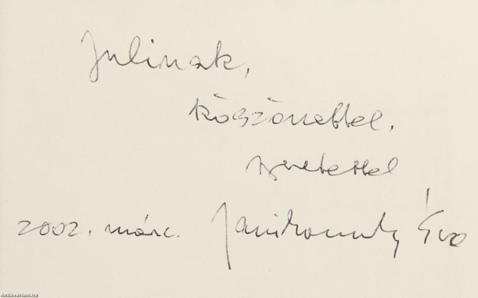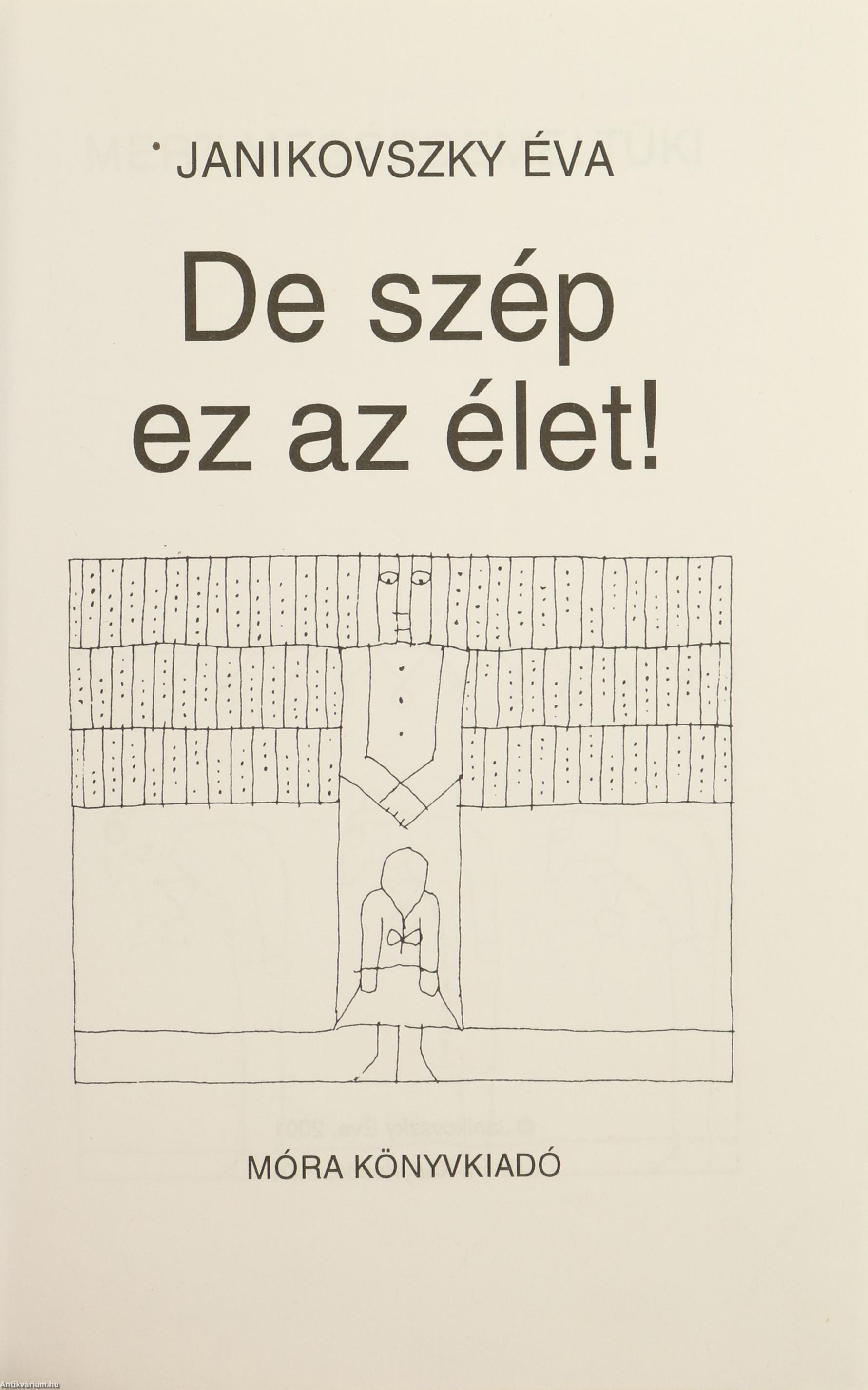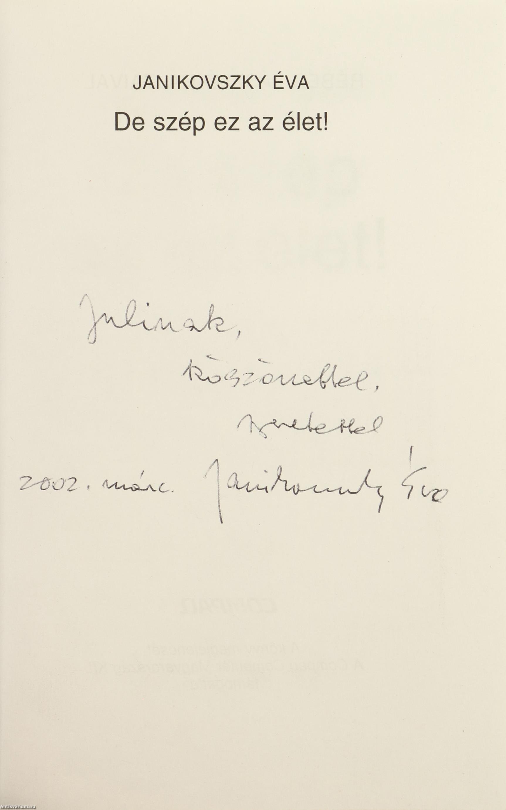 Szerző által dedikált példány. Első kiadás. De szép ez az élet. Írta: Janikovszky Éva. Az előlapon a szerző, Janikovszky Éva tollal beírt, névre szóló dedikációja olvasható: "J.-nak köszönettel, szeretettel. 2002. márc. Janikovszky Éva". Réber László szöveg közti, fekete-fehér rajzaival illusztrált, valamint részletes tartalomjegyzékkel és könyvhirdetésekkel kiegészített kiadás. Nyomtatta az Alföldi Nyomda Rt. Kiadói fűzött kemény papírkötésben lévő példány feliratos, színes illusztrációval ellátott címfedéllel, feliratos könyvgerinccel, szöveges hátlappal, hiánytalan, megőrzött, jó állapotban. A szerző Janikovszky Éva (Szeged, 1926. április 23. – Budapest, 2003. július 14.) Kossuth- és József Attila-díjas író, költő, szerkesztő. Tanulmányait Szegeden és Budapesten végezte. Az 1950-es években az Ifjúsági (később Móra) Könyvkiadó lektora, később (1987-ig) főszerkesztője volt. 1981-82-ben a Minerva Kiadó szerkesztője. 1978-95-ig elnöke volt az IBBY (Gyermekkönyvek Nemzetközi Tanácsa) magyar bizottságának. 1996-tól az Írószövetség Gyermekirodalmi szakosztályát vezette. Gyermekkönyvek szerzőjeként a '60-as években vált országosan ismertté. Hangja, ábrázolásmódja, világa összetéveszthetetlen másokéval. Írói világában fontos helyet kap a felnőtt-gyerek kapcsolat, a mindennapi élet apró konfliktusai, az őszinteség, a barátság és a közösség értékei.