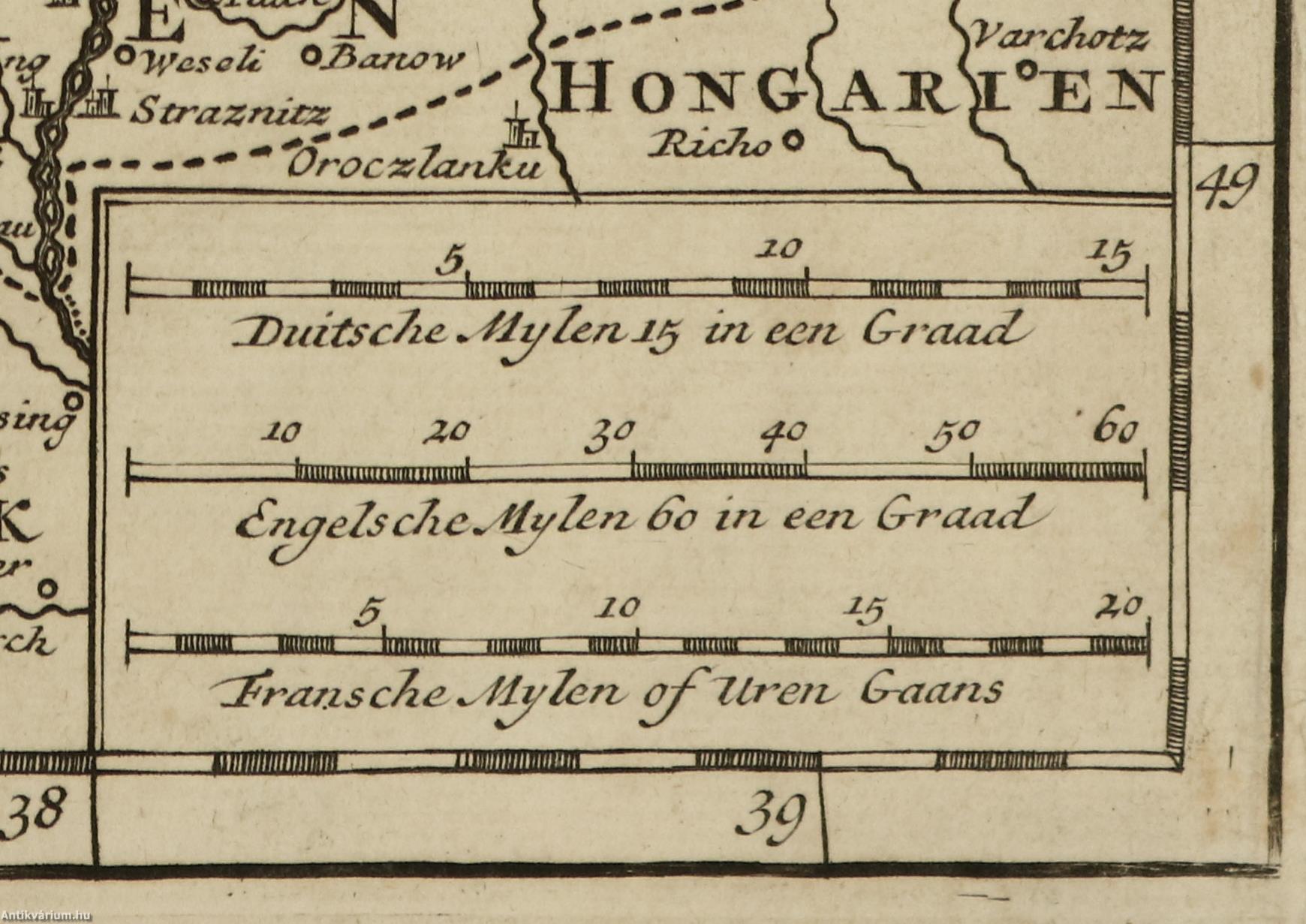 Holland nyelvű, fekete-fehér, rézmetszetes történelmi térkép a korabeli mértékek feltüntetésével.