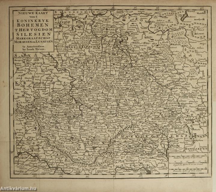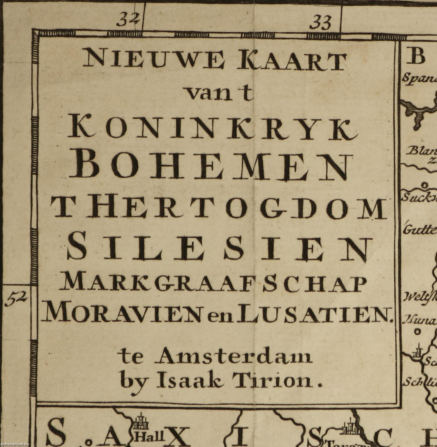 Nieuwe kaart van t Koninkryk Bohemen, Thertogdom Silesien, Markgraafschap Moravien en Lusatien. te Amsterdam by Isaak Tirion. / A Cseh Királyság, a Sziléziai Hercegség, valamint a Morva és a Lausitzi Őrgrófság új térképe. Készítette Isaak Tirion Amszterdamban.