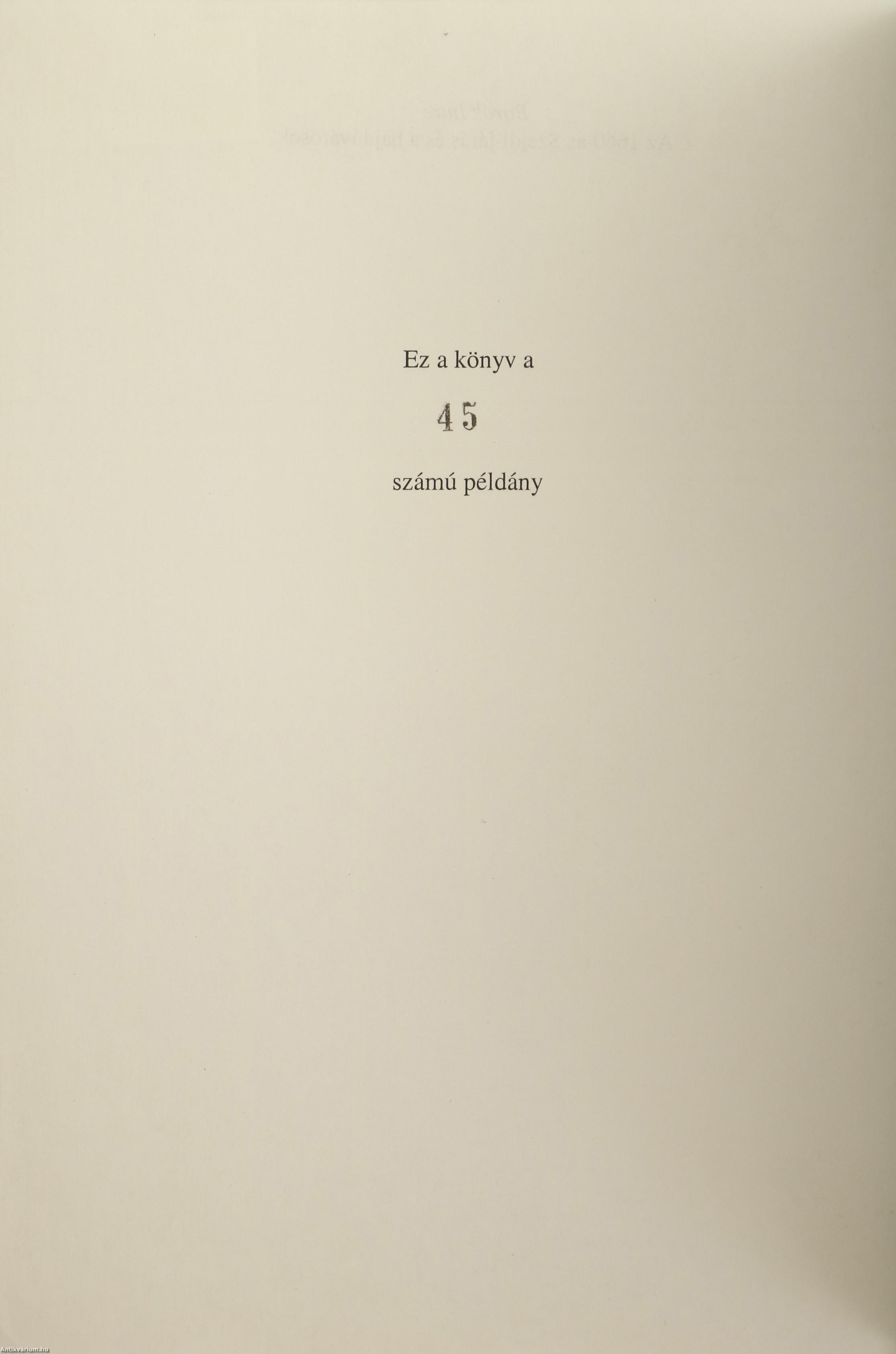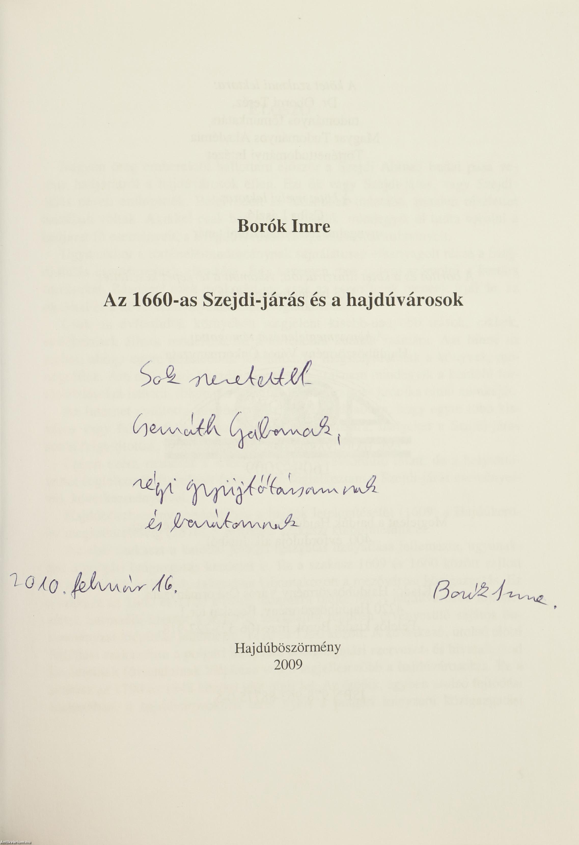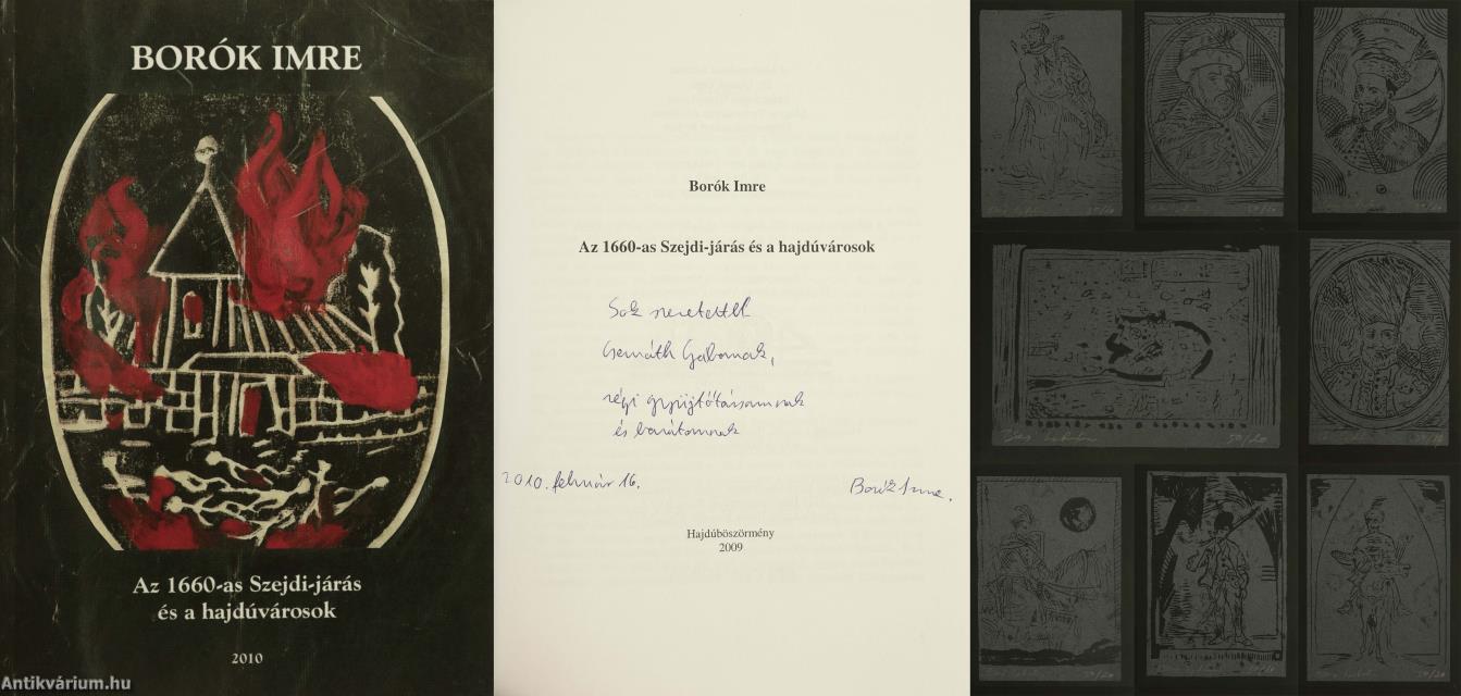Szerző által dedikált példány, grafikus által többszörösen aláírt, egyedi mellékletekkel. Első, számozott kiadás. Az 1660-as Szejdi-járás és a hajdúvárosok. Írta: Borók Imre. Az előlap verzóján számozással: Ez a könyv a 45. számú példány.