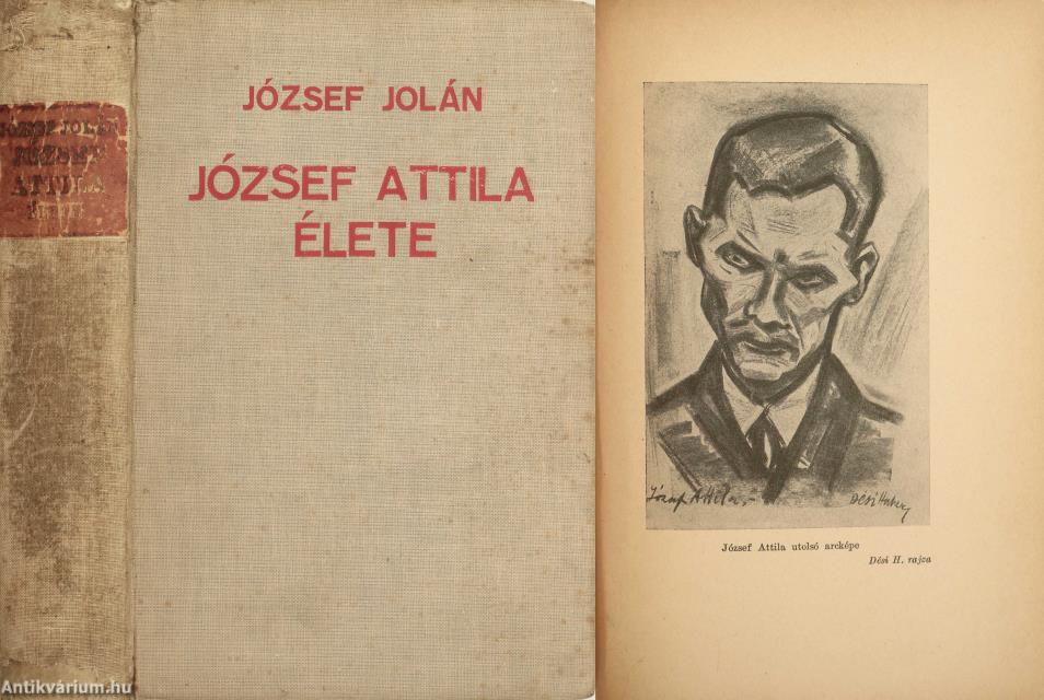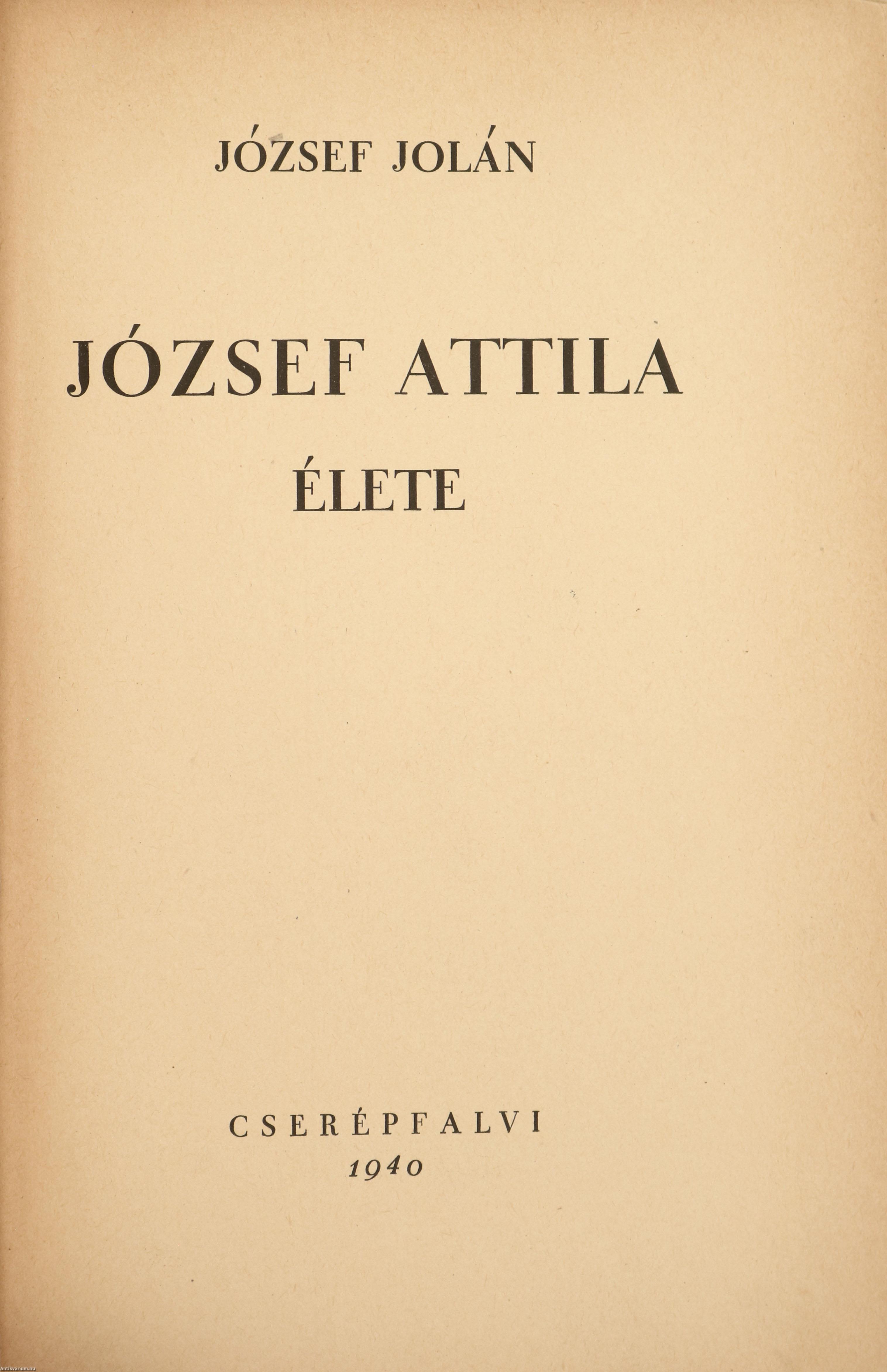 Első kiadás. József Attila élete. Írta: József Jolán. József Attila utolsó arcképének reprodukciójával (Dési Huber István rajza) illusztrált kötet. Készült a könyvnyomtatás feltalálásának ötszázadik esztendejében. Nyomtatta Pápai Ernő műintézete, Budapesten. Kiadói egészvászon kötésben lévő példány feliratozott címfedéllel, aranyozott feliratozású, javított könyvgerinccel, új előzéklapokkal, feliratozatlan hátlappal, hiánytalan állapotban. A szerző, József Jolán (Budapest, 1899. január 16. – Budapest, Ferencváros, 1950. június 25.) író, József Attila és József Etelka nővére. A Híd és Az Est című lapok munkatársa volt, számos elbeszélést és tárcát írt. 1945 után újságíróként dolgozott, több cikke jelent meg a Független Magyarország és a Kis Újság hasábjain. 1947-től a Magyar Nap című bulvárlap alkalmazásába állt. József Attila 1937-es halálát követően a szerzőnő többnyire öccse életművét gondozta, ebből született az 1940-ben kiadott regényes életrajz, melynek címe József Attila élete.