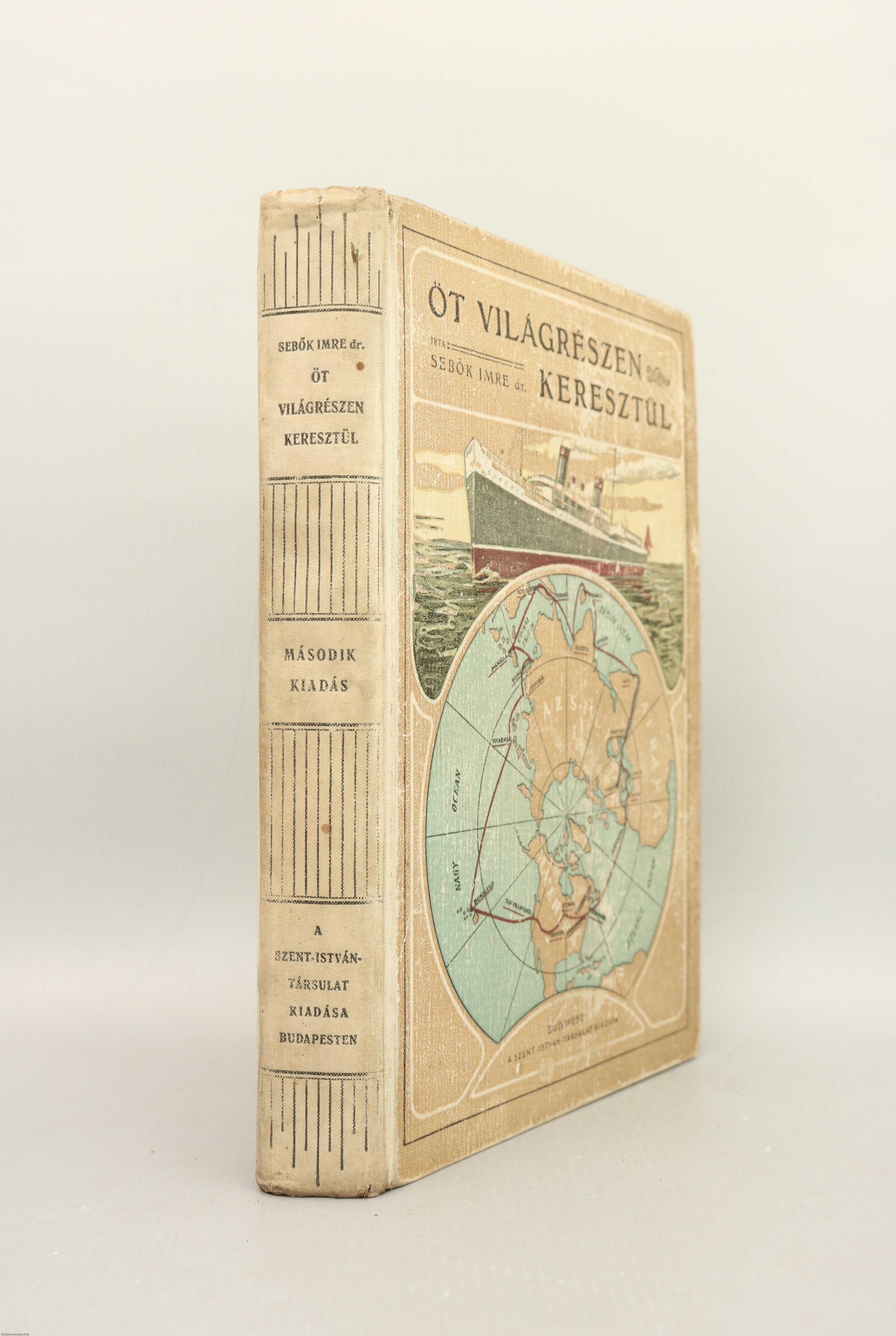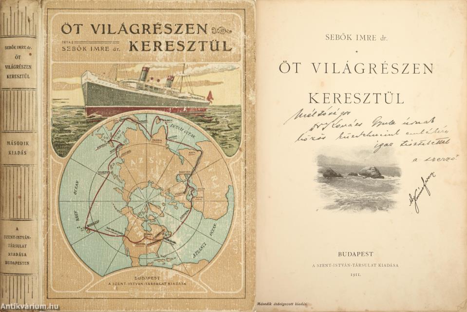 Szerző által dedikált példány. Öt világrészen keresztül. Írta: Dr. Sebők Imre. A címlapon a szerző, Dr. Sebők Imre tollal beírt, névre szóló dedikációja olvasható: "Méltóságos Dr. K. Gy. úrnak közös küzdelmeink emlékére igaz tisztelettel a szerző". Második, átdolgozott kiadás. Számos szöveg közti, fekete-fehér képpel és egy színes térképpel illusztrált, valamint elöljáróbeszéddel és tartalomjegyzékkel kiegészített kötet. A címlapon tollal írt tulajdonosi bejegyzés látható. Nyomtatta a Stephaneum Nyomda R. T., Budapesten. Kiadói egészvászon kötésben lévő példány, feliratozott, színes illusztrációval ellátott címfedéllel, feliratos könyvgerinccel, növénymotívumokkal díszített, kiadói előzéklapokkal, hátlapon a kötészet feltüntetésével, hiánytalan állapotban. A kötet szerzője, Dr. Sebők Imre (Budapest, 1878. január 1.–Budapest, 1917. december. 5.) esztergomi főegyházmegyés katolikus pap, hitoktató, földrajz tanár, a Rákóczi Kollégium és a Budapesti Érseki Katolikus Gimnázium alapítója, az utóbbi első igazgatója. 1905-ben hatalmas utazást tett és körül utazta a Földet. Ezt követően több kisebb utazást is tett. Számos nyelven beszélt és műfordító munkássága is jelentős. Utazásairól könyv formájában is beszámolt.