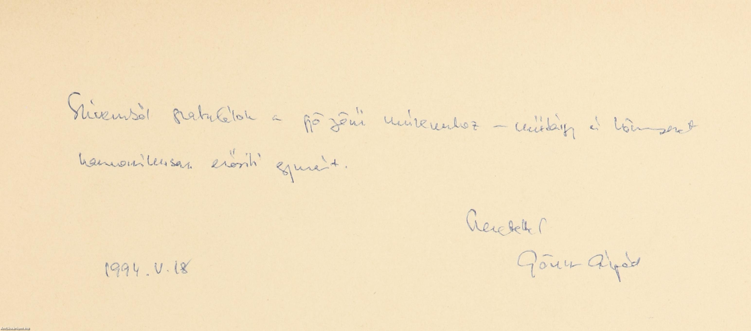 Göncz Árpád (1922-2015) József Attila-díjas író, műfordító, politikus, 1990-2000 között a Magyar Köztársaság elnöke írta, 1994. május 18-án, a Munkácsy Mihály Emlékház átadásának időpontjában: