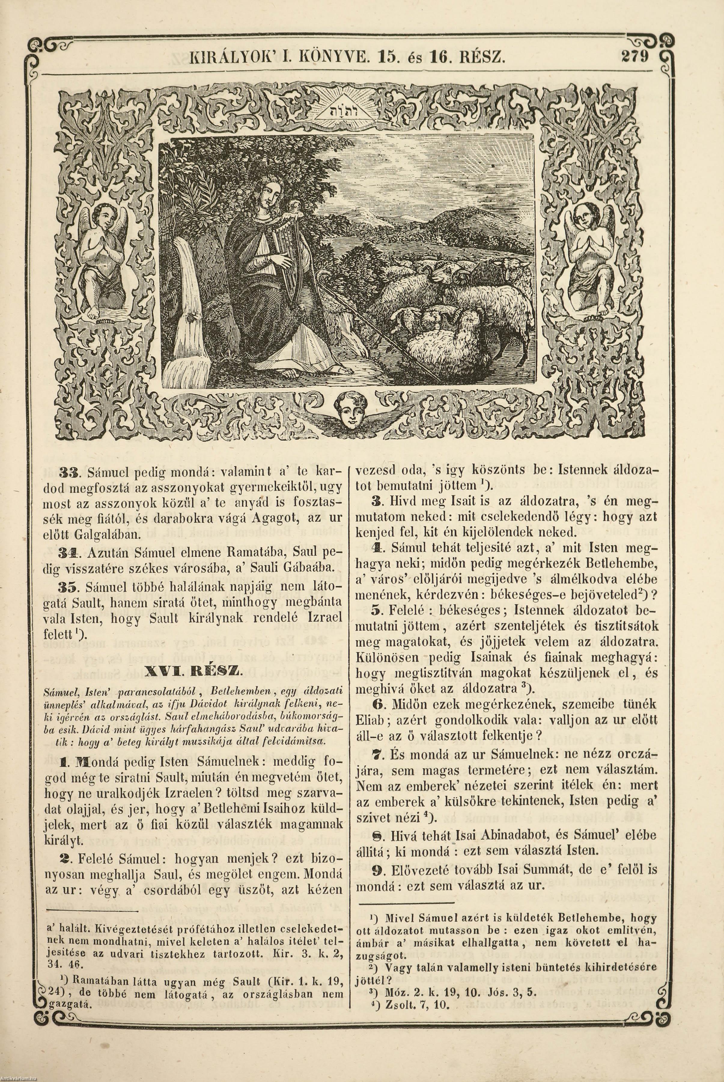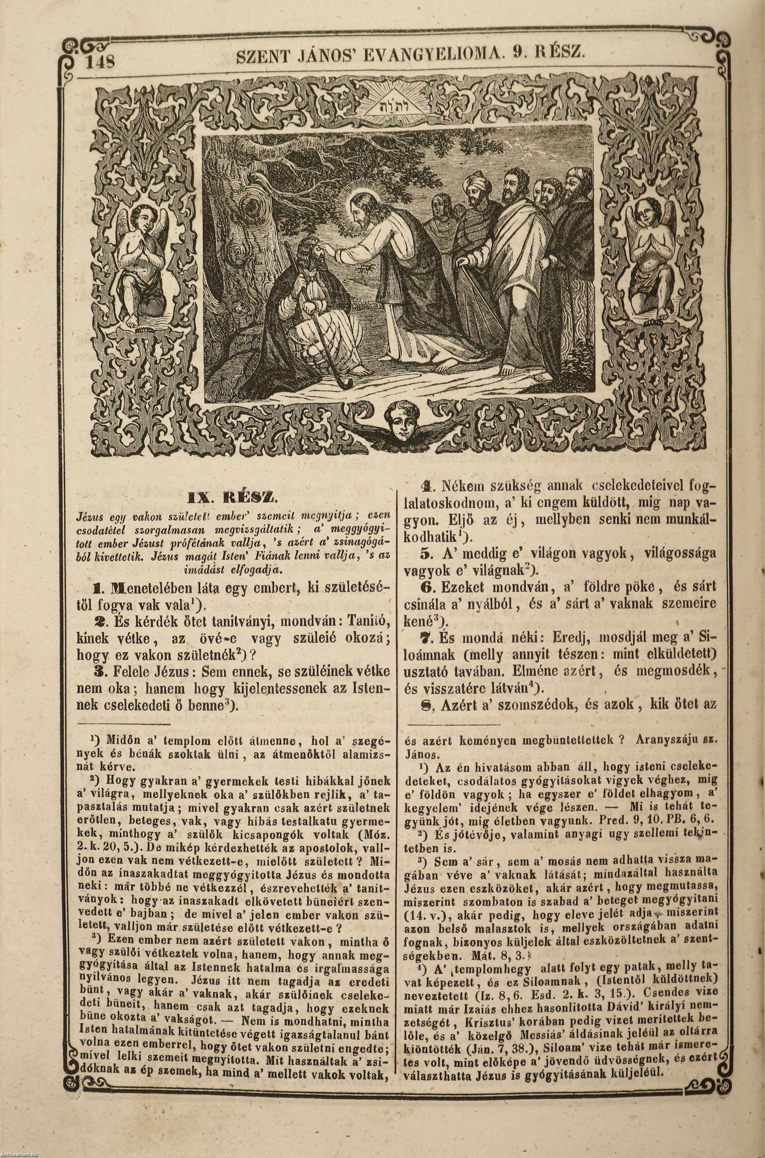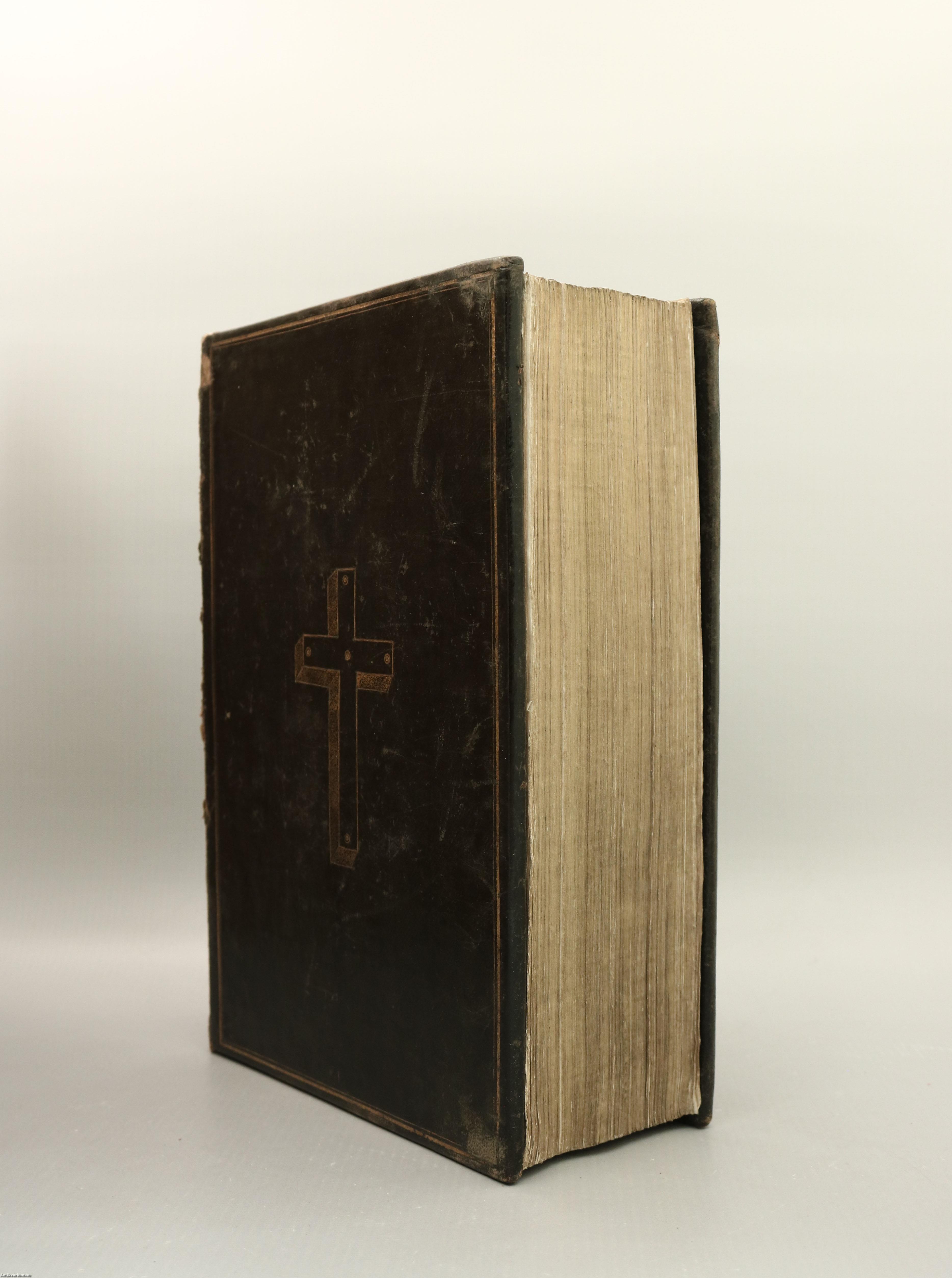 Az Ó és Uj Szövetségi Szent Irás. Keresztény katolikusok' számára. Fordította: Szabó József. Kétszáz, szöveg közti fekete-fehér képpel illusztrált, valamint Szabó József hittudományi tudor és tanár előszavával kiegészített kötet. A címlap hátoldalán a kiadó bélyegzője, az előlapon, a címlapon és az első oldalon tollal írt tulajdonosi bejegyzés látható. Kiadta és nyomtatta Bucsánszky Alajos, Pesten. Korabeli egészbőr kötésben lévő példány feliratozatlan, aranyozott kereszttel díszített, aranyozott keretezéssel ellátott címfedéllel és hátlappal, aranyozott feliratozású, díszes könyvgerinccel, mintázott, színes előzéklapokkal, aranyozott lapélekkel, hiánytalan állapotban, eredeti, feliratozatlan, kopott, keménypapír védődobozban. A fordító, Szabó József (Mezőkomárom, 1805. március 17. – Esztergom, 1884. április 27.) teológiai doktor, fölszentelt püspök. Nagyszombatban a bölcseletet, a bécsi Pázmáneumban hittudományi tanulmányokat folytatott. 1841-től teológiát oktatott Nagyszombaton. 1854-ben hercegprímási irodaigazgatóvá, 1858-ban pedig valóságos esztergomi kanonokká nevezték ki. 1862-től a pesti központi papnevelő kormányzójaként működött. 1868-ban püspökké szentelték és esztergomi érseki helynök lett. Ezt követően 1874-ben őrkanonokká, majd 1881-ben éneklőkanonokká lépett elő. Cikkei többnyire névtelenül jelentek meg a Religio és Nevelésbe, illetve a Magyar Sion hasábjain.