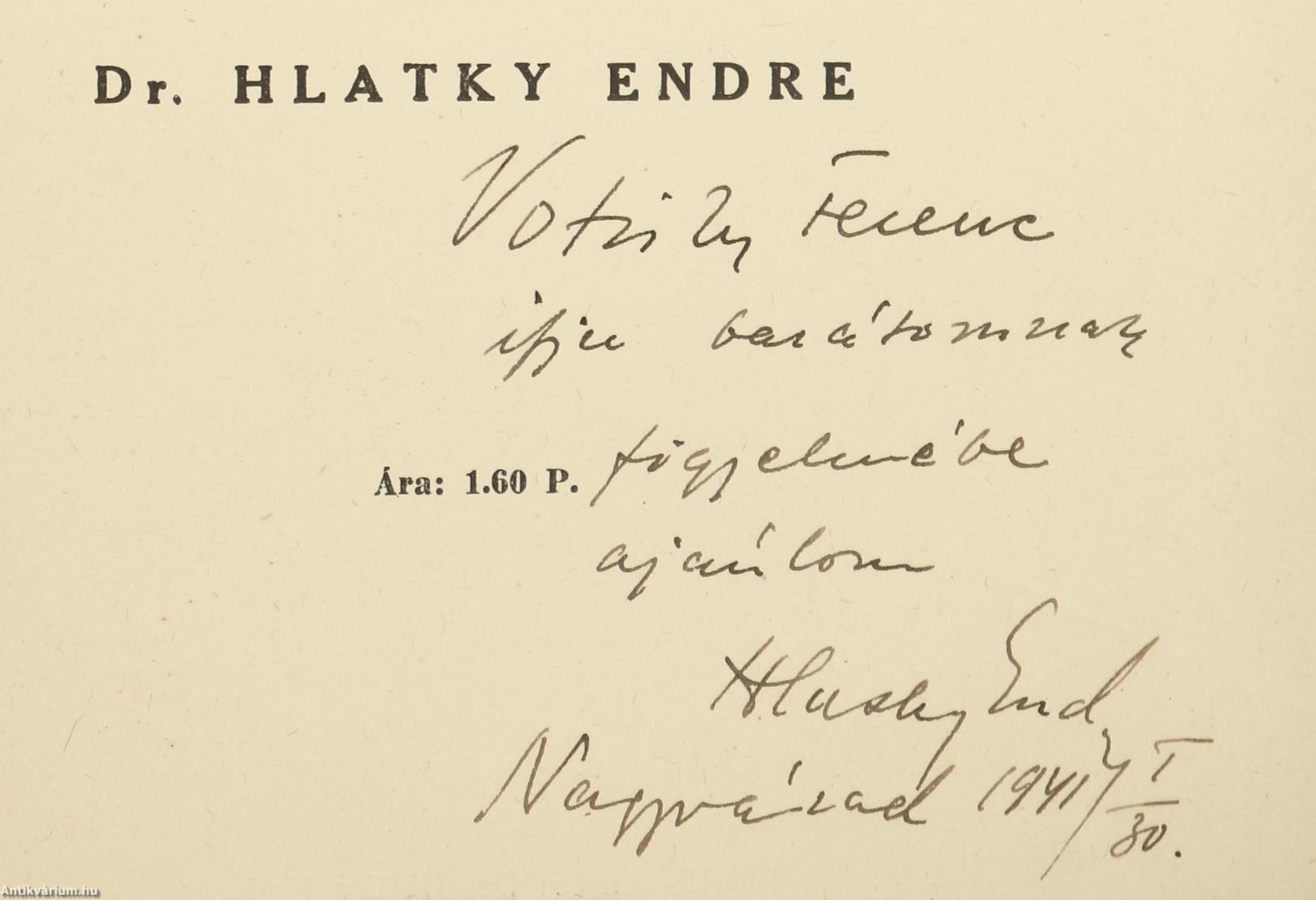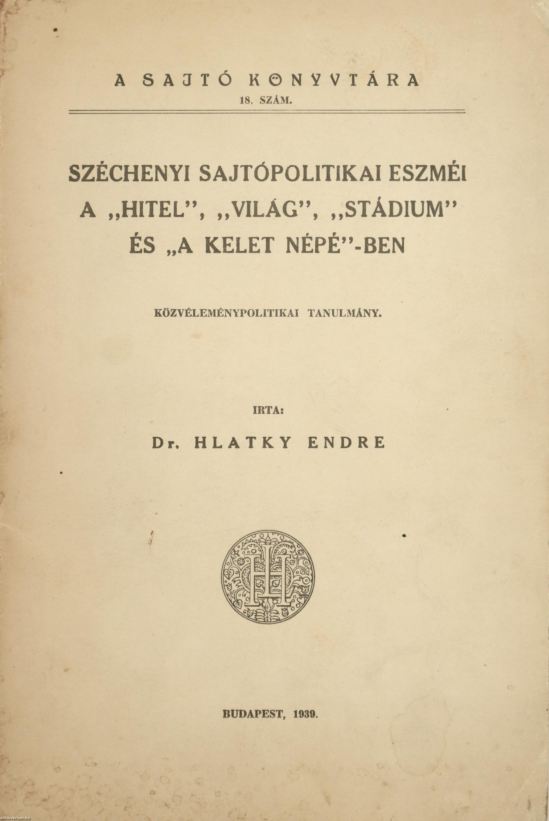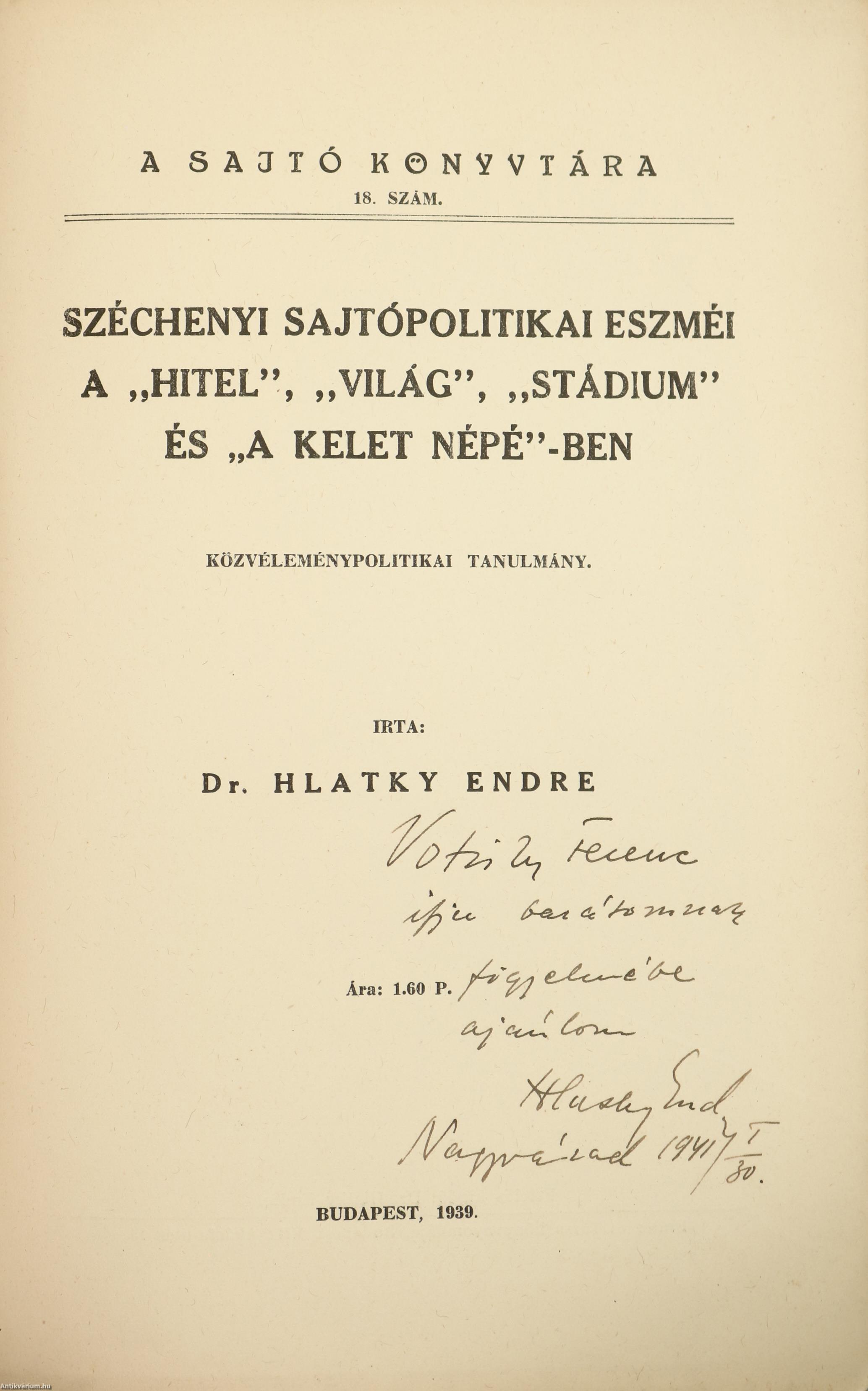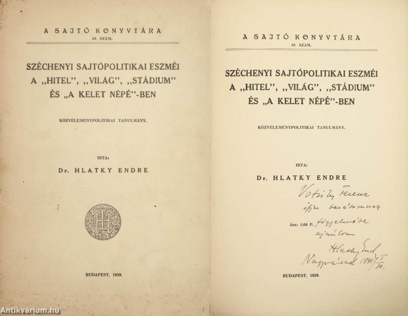 Szerző által dedikált példány.A Sajtó Könyvtára. No.: 18. sz. Széchenyi sajtópolitikai eszméi a "Hitel", "Világ", "Stádium" és "A Kelet Népé"-ben. Közvéleménypolitikai tanulmány. Írta: Dr. Hlatky Endre. A címlapon a szerző, Hlatky Endre tollal beírt, névre szóló dedikációja olvasható: "V. F. ifju barátomnak figyelmébe ajánlom Hlatky Endre Nagyvárad 1941/I./30." "Az itt közölt I., II. és III. fejezet három önálló tanulmányként a "Budapesti Szemle" 1929. évi januári és szeptemberi, valamint az 1932. évi márciusi számában jelent meg. Ugyancsak 1932-ben készült el a IV. fejezet, melynek bő kivonatát a szerző székfoglaló értekezésként 1939. február 20. napján olvasta fel a Magyar Sajtótudományi Társaságban. E fejezetet önálló tanulmányként az "A Sajtó" 1939. évi 2. és 3. számában közölte."