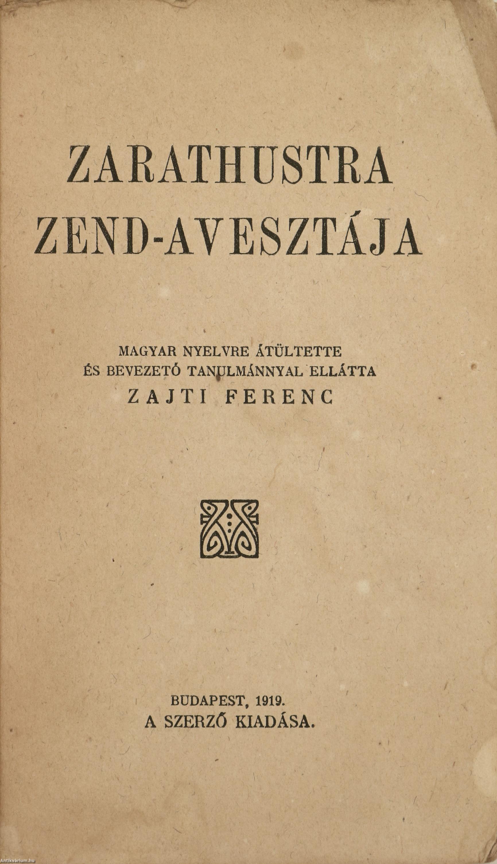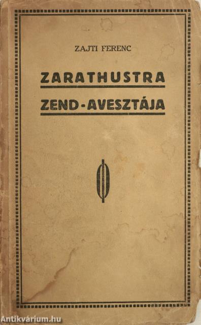 Első magyar nyelvű kiadás. Zarathustra Zend-Avesztája. Magyar nyelvre átültette és bevezető tanulmánnyal ellátta: Zajti Ferenc. A fordító bevezető tanulmányával és tartalomjegyzékkel. A Magyar Sajtó nyomása. A kötet az ősi perzsa vallás, a zoroasztrizmus Kr. e. I. évezredben keletkezett szent könyvének, az Avesztának az első teljes magyar fordítása. Kiadói varrott papírkötésben lévő példány feliratos címfedéllel, feliratozatlan könyvgerinccel és hátlappal, körbevágatlan belívekkel, átlagos, hiánytalan állapotban. A kötet fordítója és a bevezető tanulmány szerzője Zajti Ferenc (Újfehértó, 1886. március 5. – Budapest, 1961. június 29.) festő, autodidakta orientalista, egyetemi tanár, könyvtáros, író. Az „Aveszta Könyvtár” sorozat elindítója, amelyben többek között Stein Aurél, Goldziher Ignác, Kuun Géza és Jivanji Jamshedji Modi tanulmányai jelentek meg. 1928-ban kiadta Ipolyi Arnold 1854-ben született Magyar Mythologiáját, ami elsőként tett kísérletet a magyar ősvallás rekonstruálására. 1928-ban Indiába utazott, ahol a szkíta rokonságú „gudzsár hunokat” kereste. Útjáról hatalmas mennyiségű néprajzi, ipar- és képzőművészeti anyaggal, könyvritkaságokkal, fotódokumentációval tért haza. A Magyar-Indiai Társaság alelnöke volt. Életművének egy töredékét a Magyar Nemzeti Galéria őrzi.