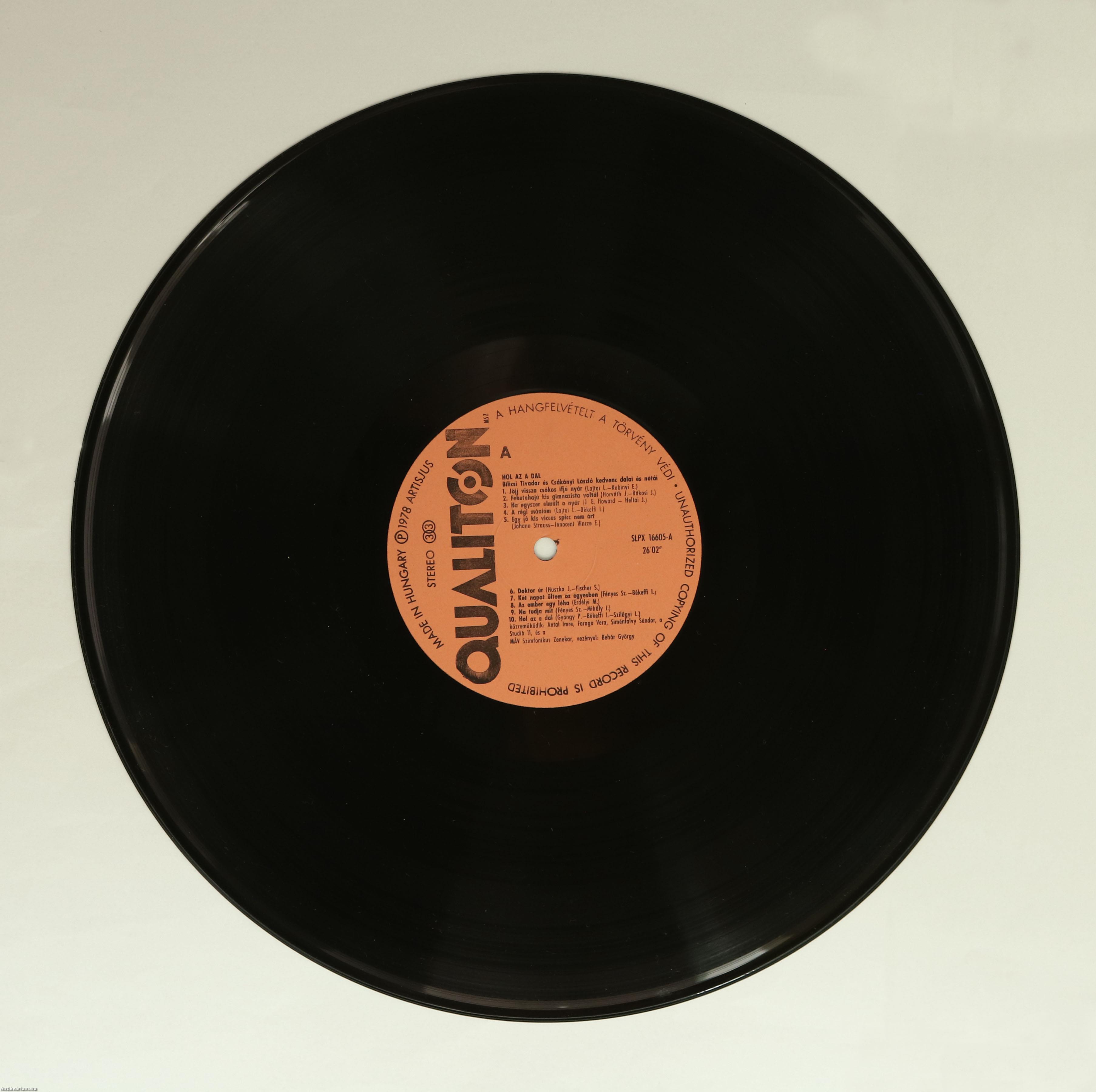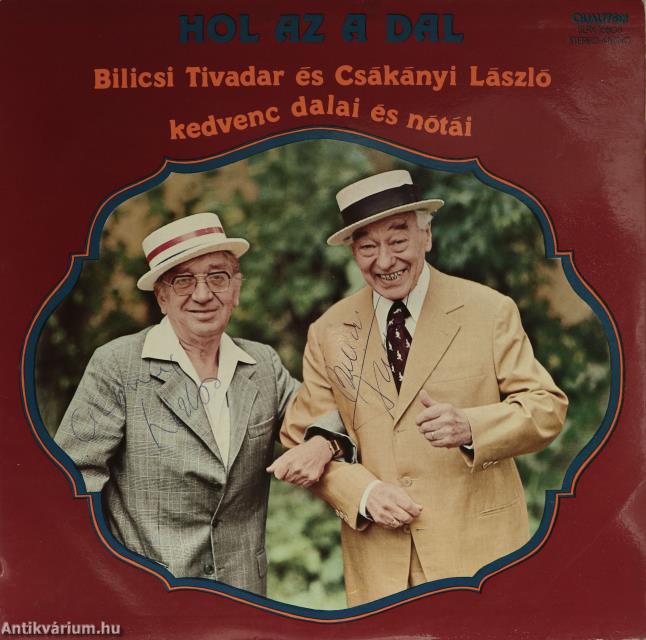 Bilicsi Tivadar színművész, érdemes és kiváló művész, valamint Csákányi László Jászai Mari-díjas magyar színművész, érdemes és kiváló művész által aláírt példány. Hol az a dal. Bilicsi Tivadar és Csákányi László kedvenc dalai és nótái. (hanglemez).