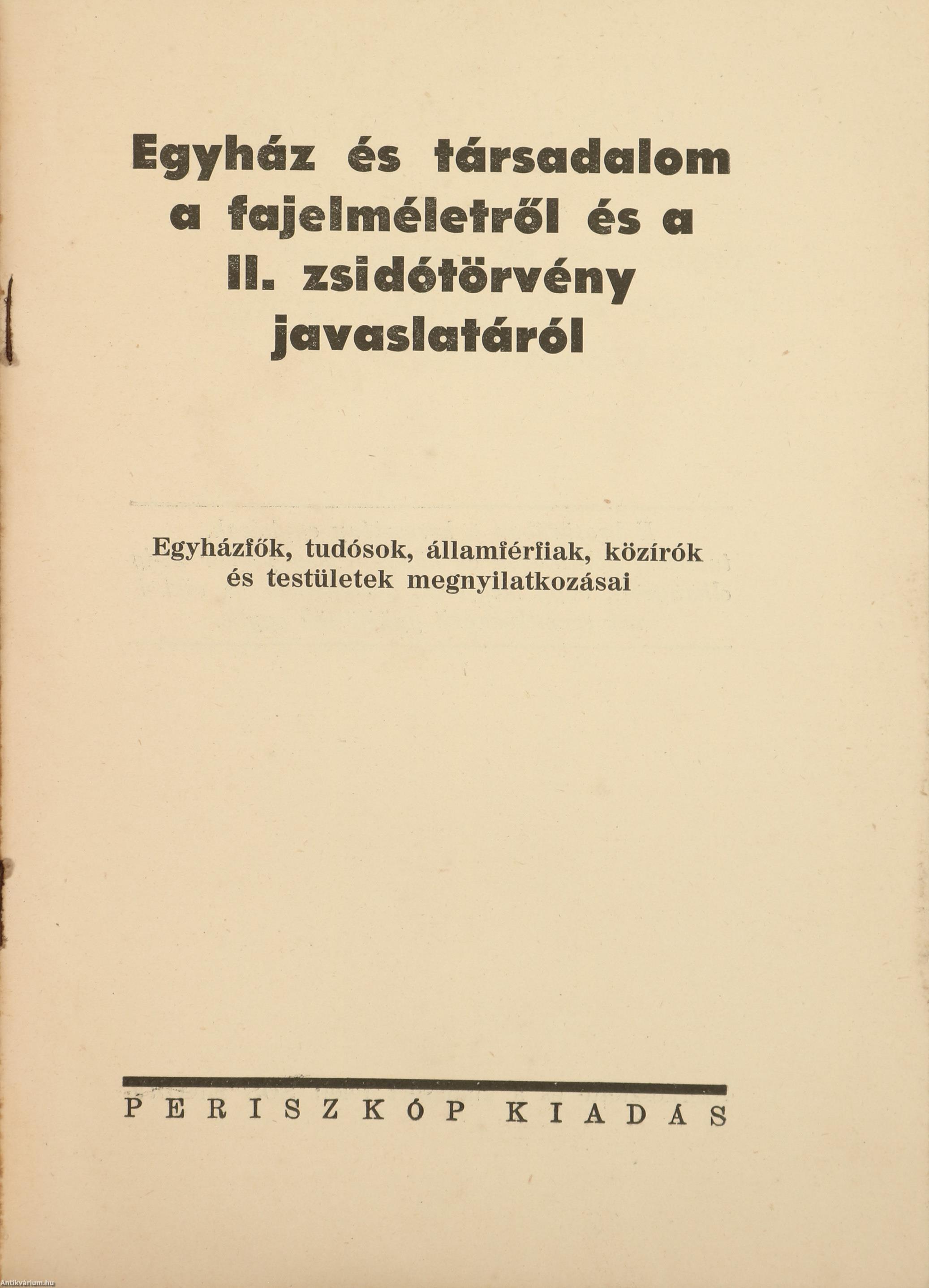 Egyház és társadalom a fajelméletről és a II. zsidótörvény javaslatáról. Egyházfők, tudósok, államférfiak, közírók és testületek megnyilatkozásai. Szerkesztette: Sós Endre.
