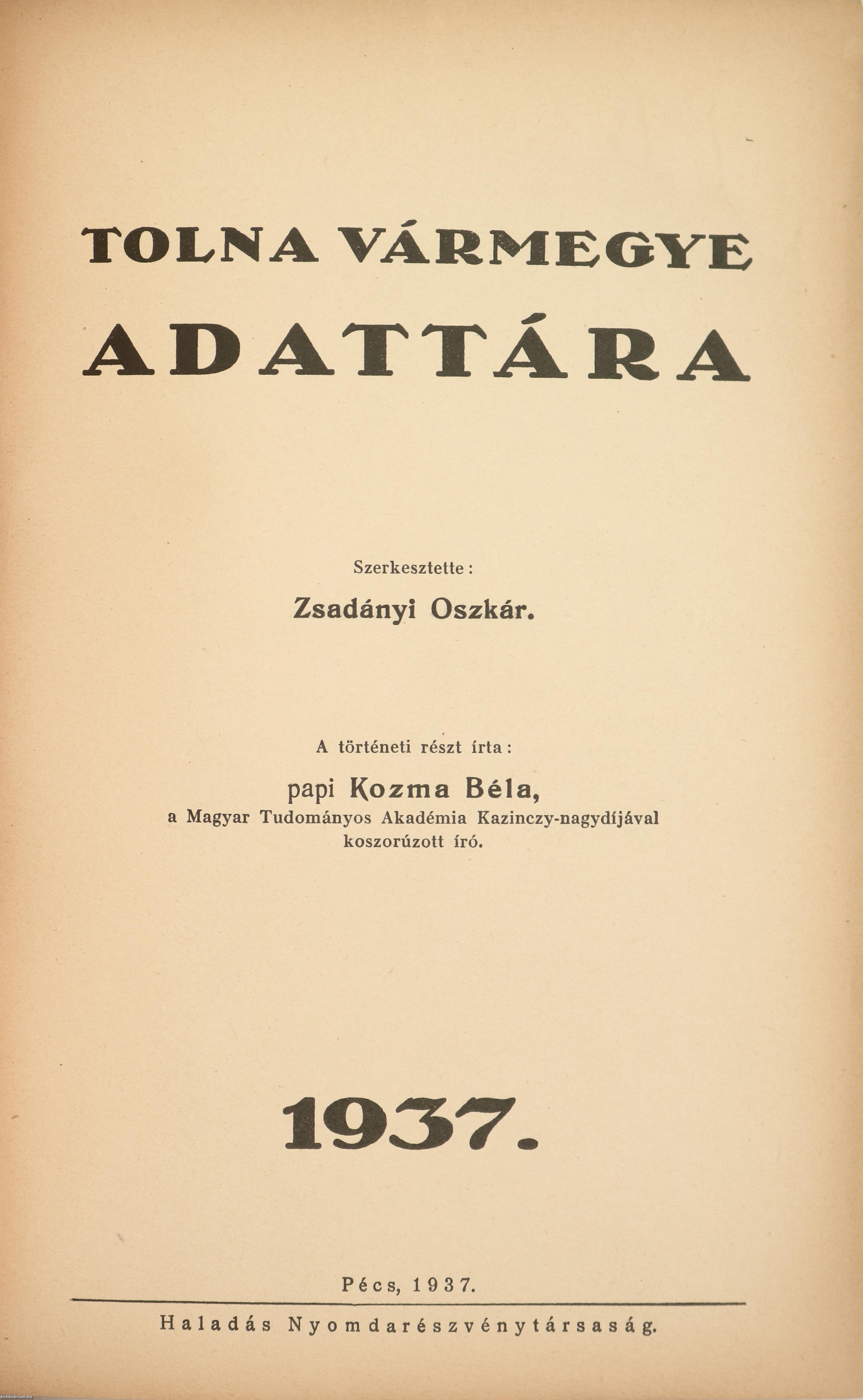 Első kiadás. Tolna Vármegye Adattára./Tolna vármegye és Szekszárd megyei város címtára (Alsódunántúli címtár). Szerkesztette: Zsadányi Oszkár. A történeti részt írta: papi Kozma Béla. Személyi és községi adattárral, valamint önálló címtárral kiegészített helytörténeti és helyismereti monográfia. Tartalomjegyzékkel ellátott kötet. Kiadói egészvászon kötésben lévő példány aranyozott feliratos címfedéllel és könyvgerinccel, kiadói előzéklapokkal, tiszta belívekkel, hiánytalan állapotban.
