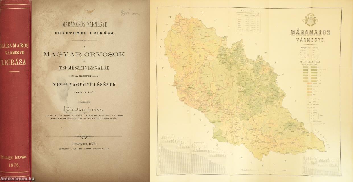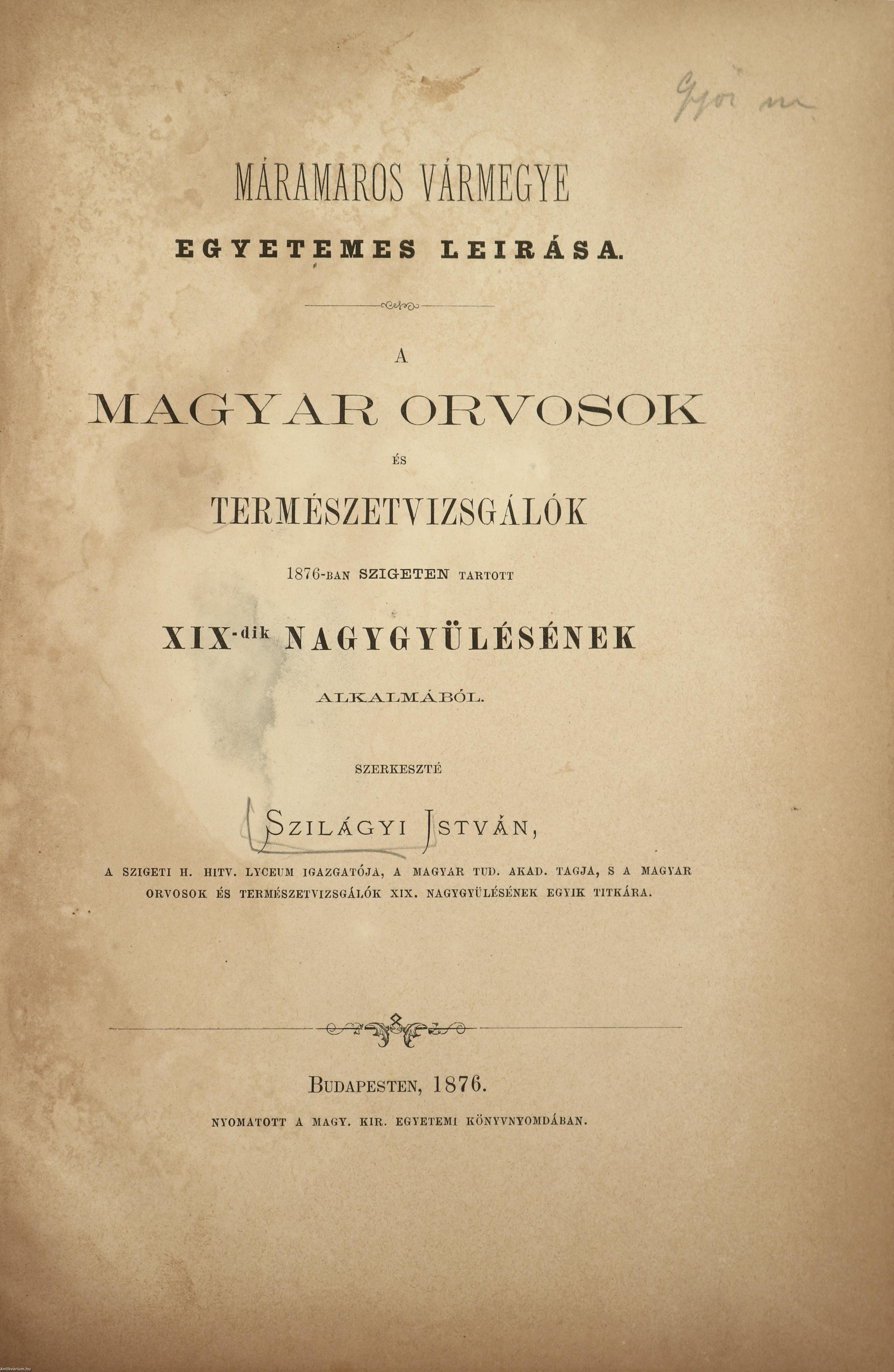 Első kiadás. Máramaros vármegye egyetemes leirása. A magyar orvosok és természetvizsgálók 1876-ban Szigeten tartott XIX-dik nagygyülésének alkalmából. Szerkesztette: Szilágyi István. Máramaros vármegye természeti és társadalmi viszonyait ismertető monográfia. Trefort Ágostonnak szóló ajánlással, számos táblázattal és pár fekete-fehér, szöveg közti ábrával. A kötet végén Máramaros vármegye színes, kihajtható, jelmagyarázatos térképe található.