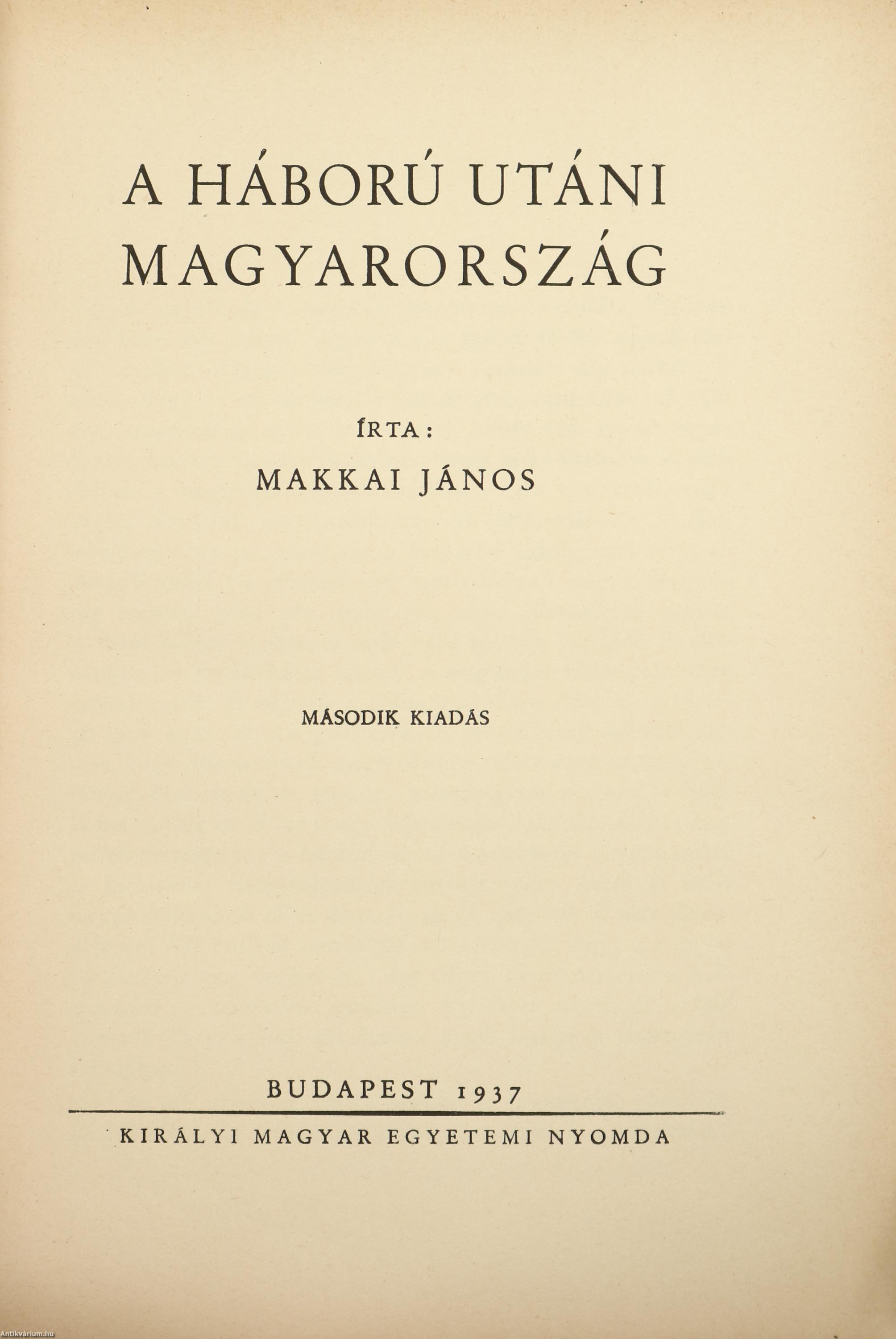 A háború utáni Magyarország. Írta: Makkai János. Második kiadás. Előszóval, irodalom- és tartalomjegyzékkel kiegészített kötet. Nyomtatta a Királyi Magyar Egyetemi Nyomda, Budapesten. Kiadói varrott papírkötésben lévő példány, feliratozott, illusztrált címfedéllel, feliratos könyvgerinccel, hátlapon a nyomda feltüntetésével, hiánytalan, jó állapotban. A kötet szerzője Makkai János (1905-1994) újságíró, politikus, a Magyarság és Új Magyarság című folyóiratok munkatársa, az 1930-as években országgyűlési képviselő. A Darányi-kormány idején kezdeményezője volt a zsidókérdéssel foglalkozó bizottság létrehozásának és az első zsidótörvénynek. Szélsőjobboldali nézeteit később revideálta, a háború végén a Gestapo letartóztatta. 1947-ben nyugatra emigrált.