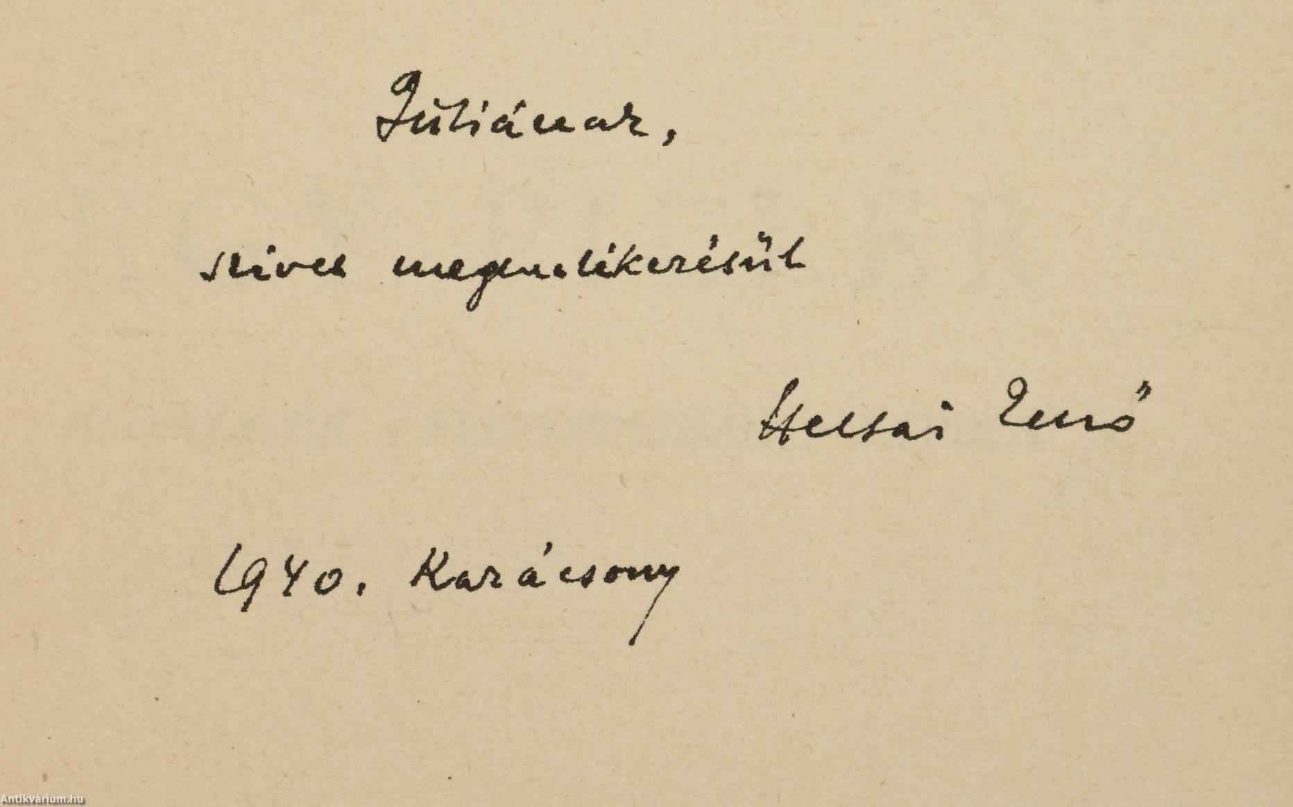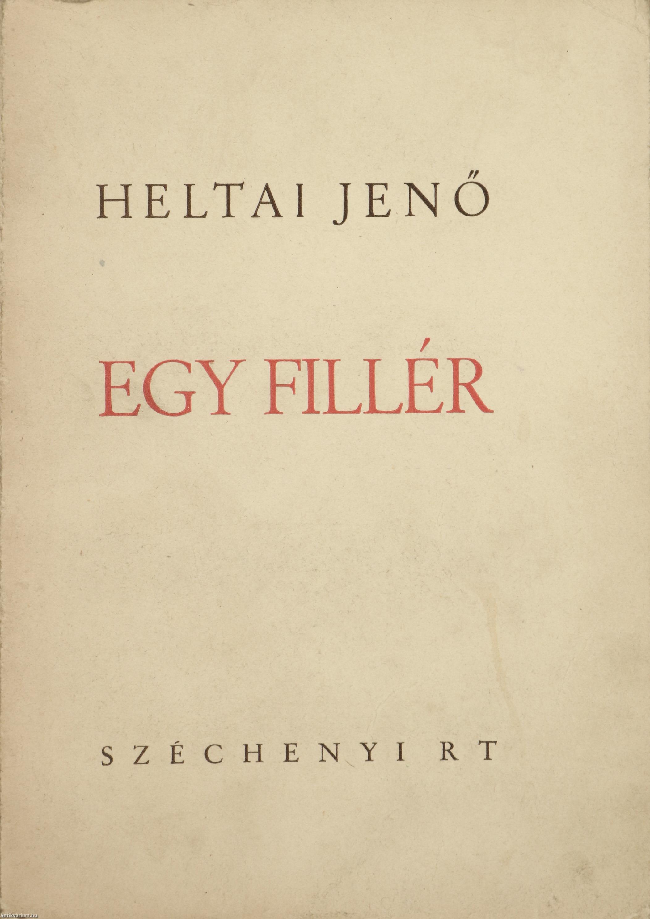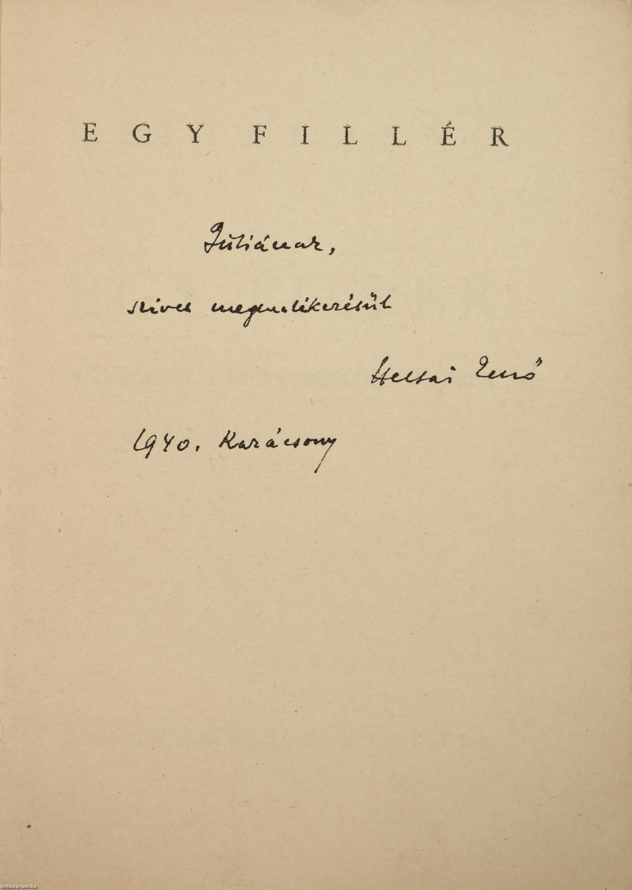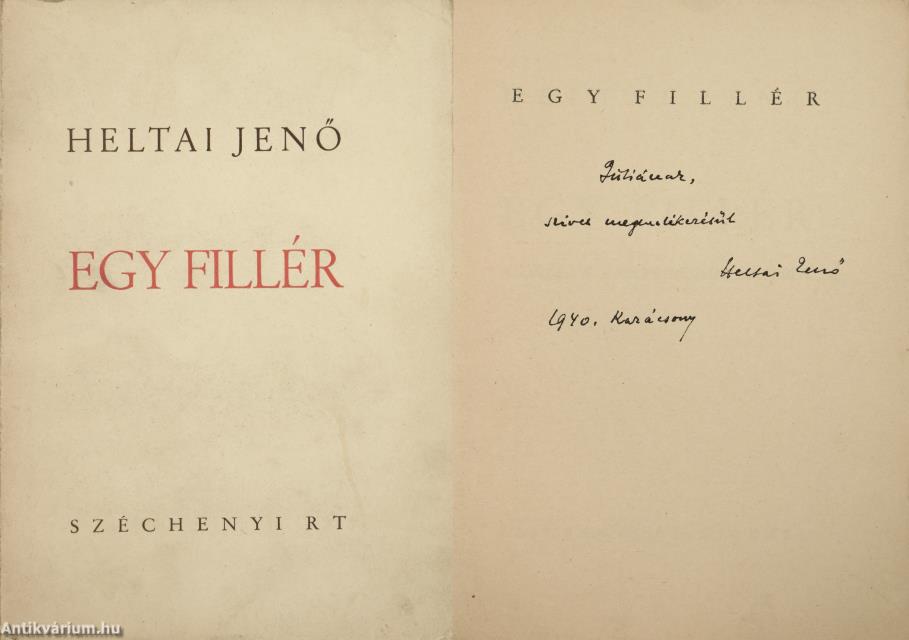 Szerző által dedikált példány. Első kiadás. Egy Fillér. Álomjáték 3 felvonásban, 7 képben. Írta: Heltai Jenő. A feliratozott előlapon Heltai Jenő tollal beírt, névre szóló dedikációja olvasható: "J.-nak, szíves megemlékezésül Heltai Jenő. 1940. Karácsony". Nyomtatta az Athenaeum Irodalmi és Nyomdai Rt. Budapesten, a könyvnyomtatás 500. évében. Kiadói varrott papírkötésben lévő példány két színnel feliratozott címfedéllel, feliratos könyvgerinccel, körbevágatlan belívekkel, hátlapon a nyomda feltüntetésével, hiánytalan állapotban. A szerző, Heltai Jenő /szül.: Herzl Eugen/ (Pest, 1871. augusztus 11. – Budapest, 1957. szeptember 3.) Kossuth-díjas író, költő, újságíró, producer, dramaturg. Jogi tanulmányait félbehagyva újságíróként kezdett dolgozni (pl.: Magyar Hirlap, A Hét, Pesti Napló). 1900-ban titkárként, 1914-től már dramaturg-igazgatóként volt a Vígszínház munkatársa. 1918-tól az Athenaeum Kiadó irodalmi igazgatója, 1916-tól a Magyar Színpadi Szerzők Egyesületének elnöke. A két világháború között a Belvárosi Színház és Magyar Színház igazgatója volt. Nagy műveltségű, kifinomult, ugyanakkor könnyed, franciás lezserségű íróként vált népszerűvé. Színpadi műveiben is kitűnt költői készsége.