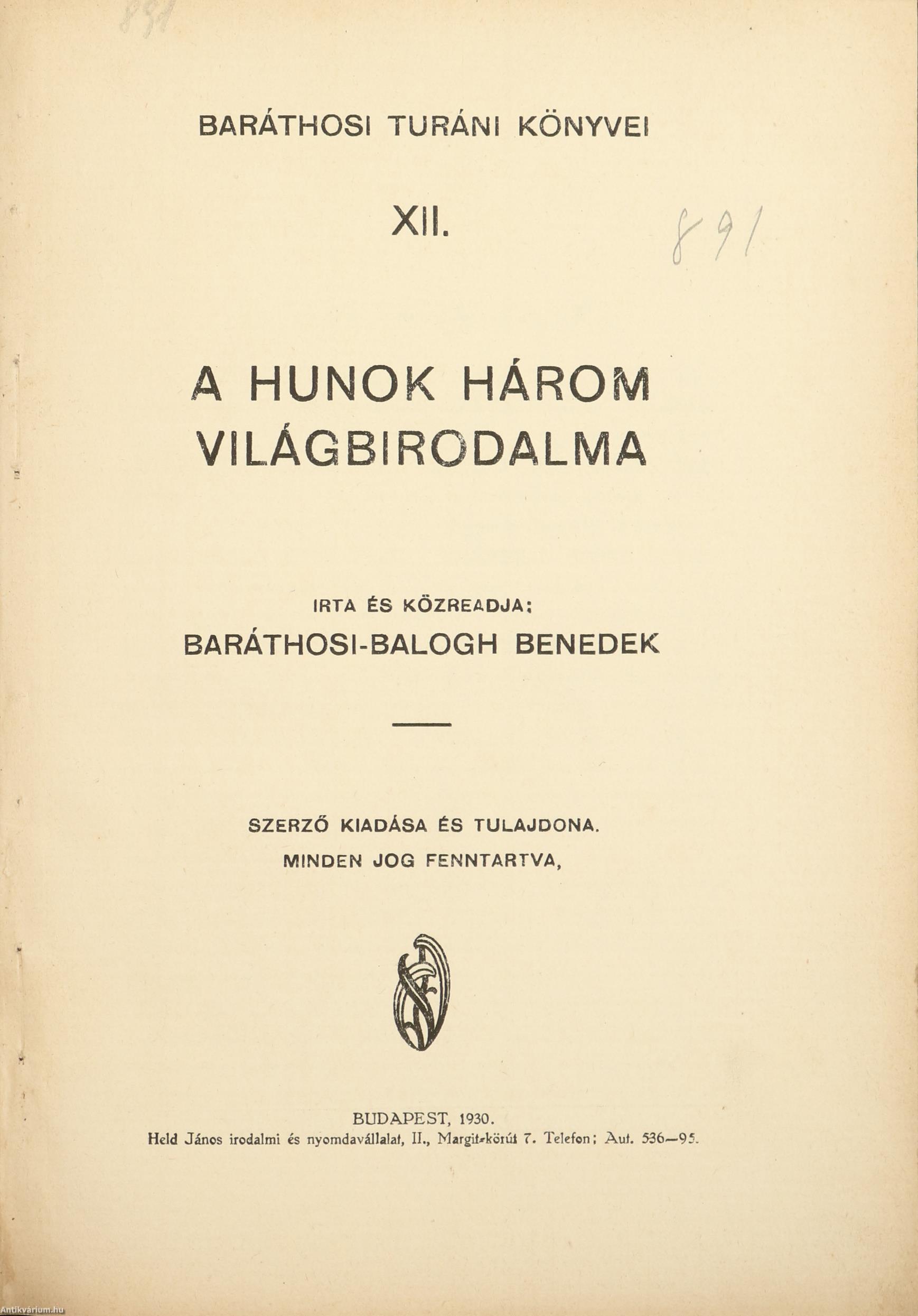 Első kiadás. Baráthosi turáni könyvek. No.: XII. sz. A hunok három világbirodalma. Írta és közreadja: Baráthosi-Balogh Benedek. Szerzői előszóval és bevezetéssel, illetve részletes tartalomjegyzékkel kiegészített kötet. Nyomtatta a Held János Irodalmi és Nyomdavállalat, Budapesten. Könyvkötői félvászon kötésben lévő példány feliratozatlan, mintás címfedéllel és hátlappal, aranyozott feliratozású könyvgerinccel, hiánytalan állapotban. A szerző, Baráthosi-Balogh Benedek (Lécfalva, 1870. április 4. – Budapest, 1945. február 3.) erdélyi magyar néprajzkutató, mandzsu-tunguz kutató. Székelykeresztúron, Nagyenyeden, Budapesten és Kolozsváron tanult, igyekezett ugyanazokat az iskolákat elvégezni, mint nagy példaképe, Kőrösi Csoma Sándor. 1892-1897 között a Wesselényi család házitanítója volt, 1899-től a fővárosban dolgozott tanárként, 1927-től pedig igazgató lett. Gyűjtőútjai során bejárta Ázsia és Európa jelentős részét. 1913-ban a Magyar Nemzeti Múzeum, a Hamburgi Néprajzi Múzeum, a Berlini Egyetem Fonetikai Osztálya szervezett neki közösen egy hároméves expedíciót. A "Dai Nippon" 1-3. kötete volt az első műve (1907), aminek újabb kiadása "Kelet csodái" címmel jelent meg bővebb formában. 1927-től kezdte kiadni a "Baráthosi Turáni Könyvei" c. 24 kötetre tervezett könyvsorozatát, amiből végül 18 kötet jelent meg.