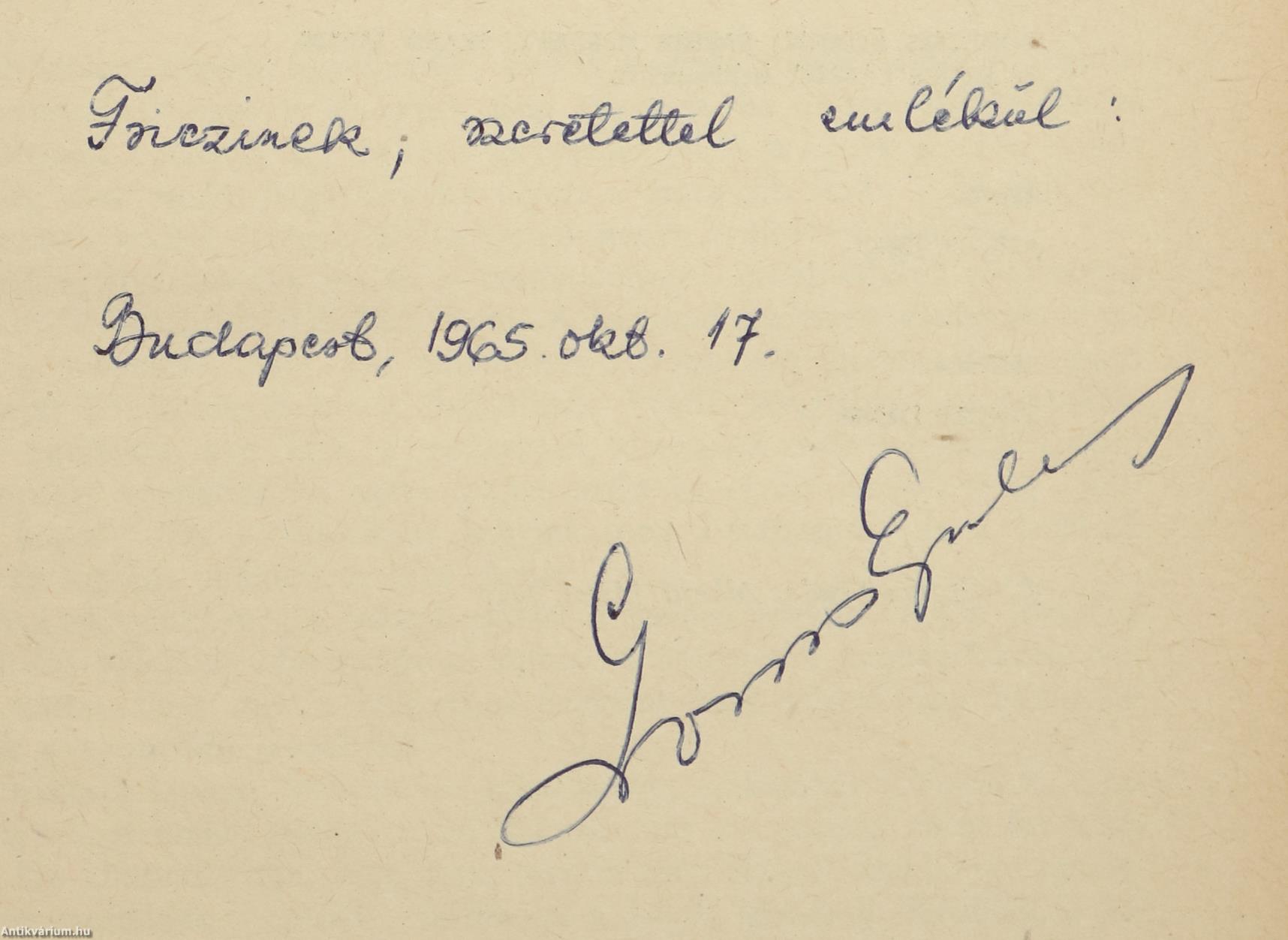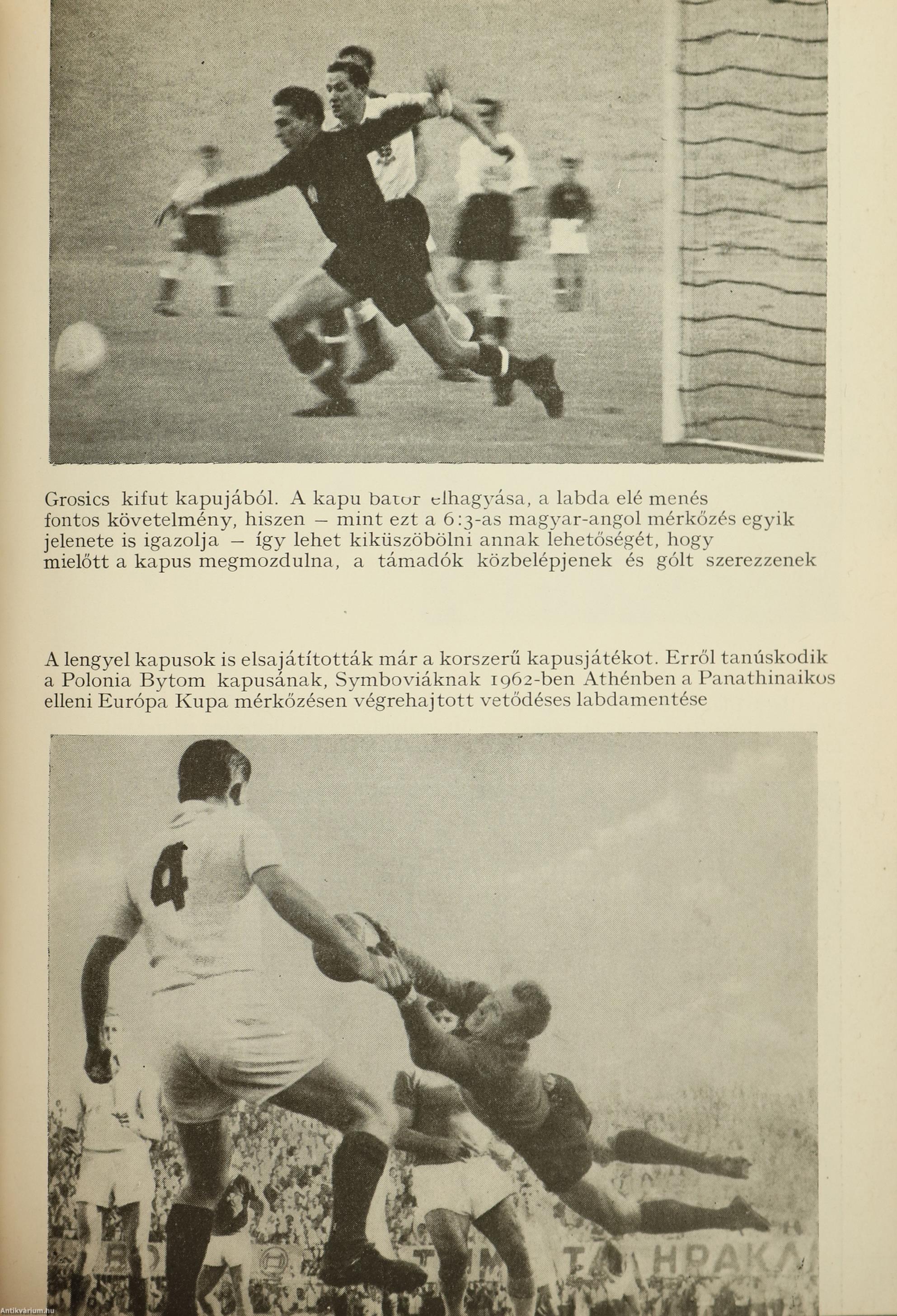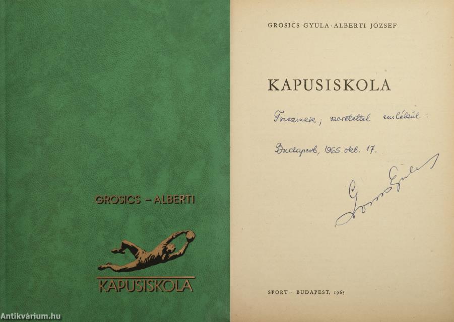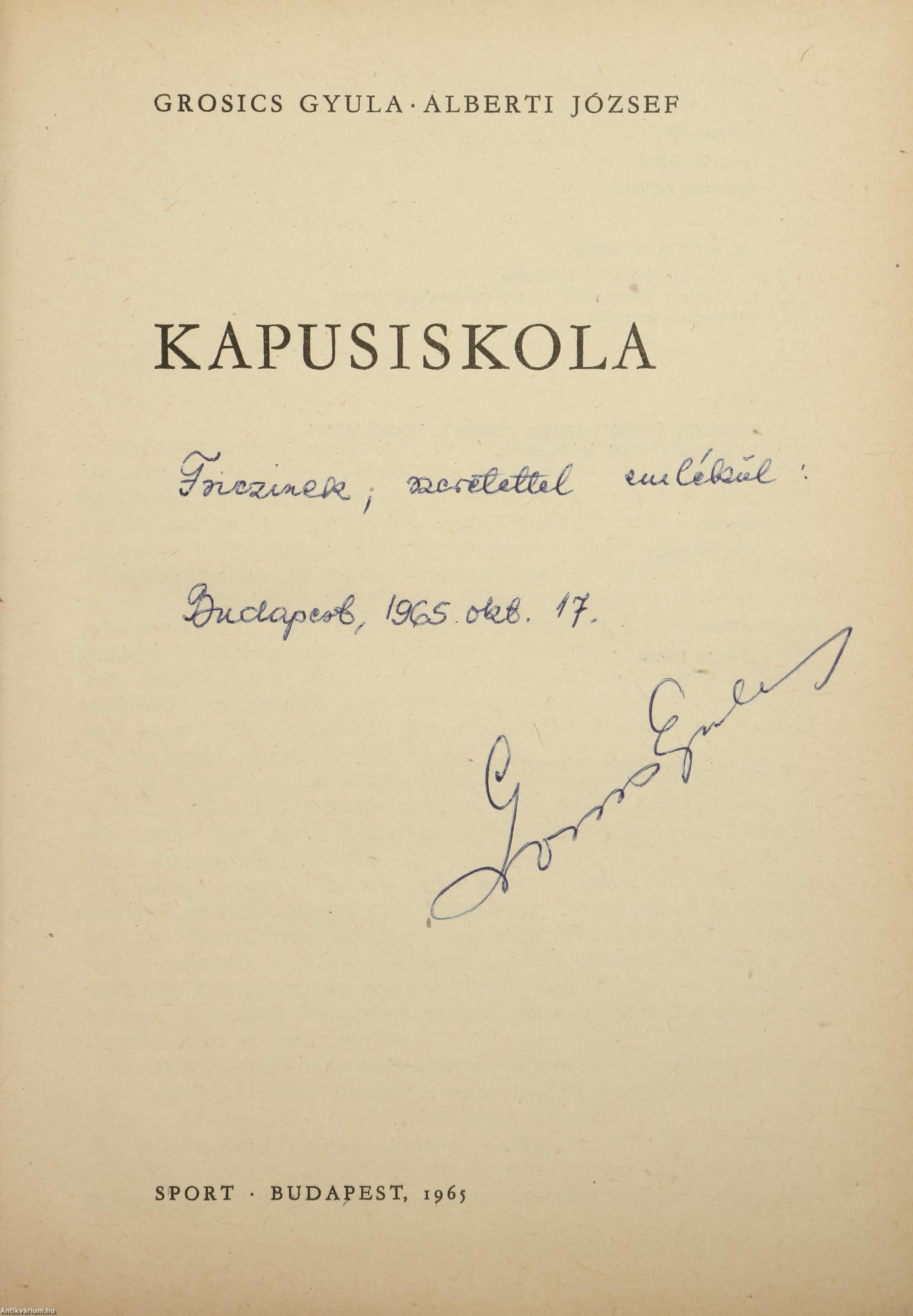 Grosics Gyula a Nemzet Sportolója címmel kitüntetett labdarúgó, az Aranycsapat kapusa által dedikált példány. Első kiadás. Kapusiskola. Írta: Grosics Gyula és Alberti József. A címlapon Grosics Gyula labdarúgó tollal beírt, névre szóló dedikációja olvasható: "F.-nek; szeretettel emlékül: Budapest, 1965. okt. 17. Grosics Gyula". Szöveg közti, fekete-fehér rajzokkal és 14 kétoldalas képtáblán számos, fekete-fehér fényképpel illusztrált, valamint irodalom- és tartalomjegyzékkel kiegészített kötet. Képek: Kövecses Kornél, Saphir Herbert, Szabó János és Szűcs László archívumából. Rajzok: Apródi Jenő. Fedélterv: Vincze Dénes. Nyomtatta a Franklin-nyomda, Budapesten. Kiadói fűzött keménykötésben lévő példány, aranyozott feliratozással és illusztrációval ellátott címfedéllel, feliratos könyvgerinccel, tiszta belívekkel, feliratozatlan hátlappal, hiánytalan, megőrzött, jó állapotban. "...A két kiváló szakember elsősorban szakkönyvet írt, tanácsokat ad a kapusoknak, de a labdarúgást szerető olvasók is forgathatják ezt a könyvet nemcsak azért, hogy megismerjék, mi minden kell ahhoz, hogy valakiből jó kapus váljék, hanem azért is, mert a szerzők képekben és szövegben bemutatják a világ leghíresebb kapusait..." - (Magyar Nemzet, 1965. október 23./21. évfolyam/250. szám). A kötetet dedikálta, Grosics Gyula (Dorog, 1926. február 4. – Budapest, 2014. június 13.), a Nemzet Sportolója címmel kitüntetett magyar labdarúgó, az Aranycsapat "Fekete párduc" becenevet viselő kapusa. 1947 és 1962 között 86 alkalommal szerepelt a válogatottban. Játszott a később legendássá vált 1953-as Anglia elleni, 6:3-ra végződő mérkőzésen és az 1952-es olimpián is Helsinkiben, ahol a magyar csapat aranyérmet nyert.