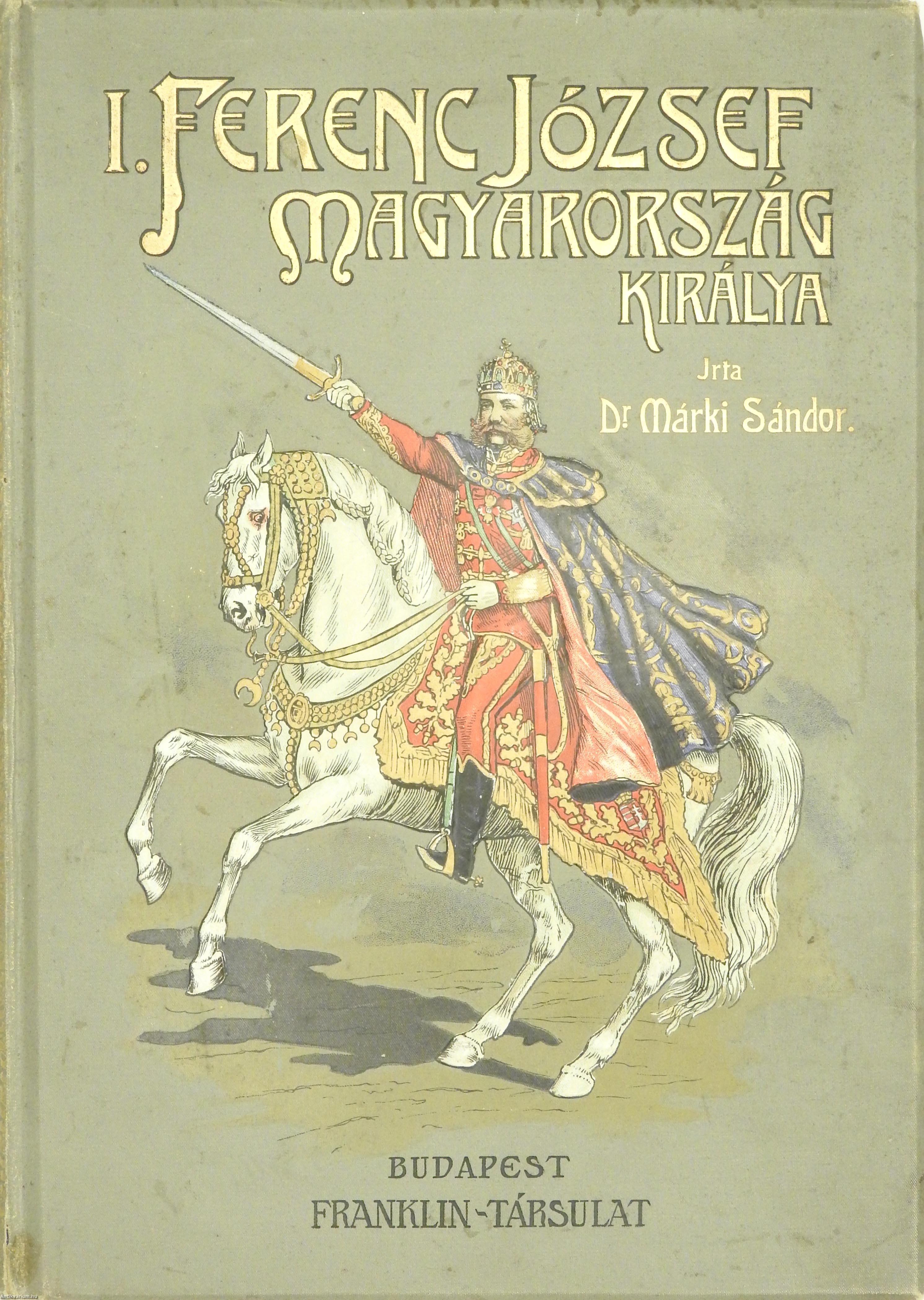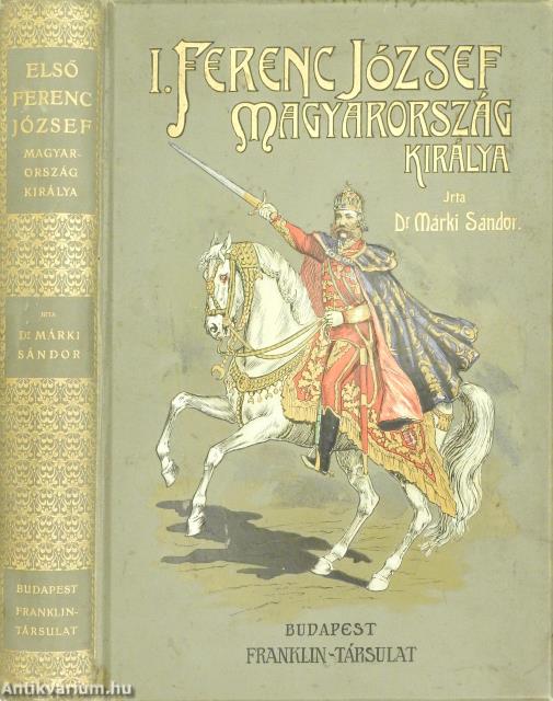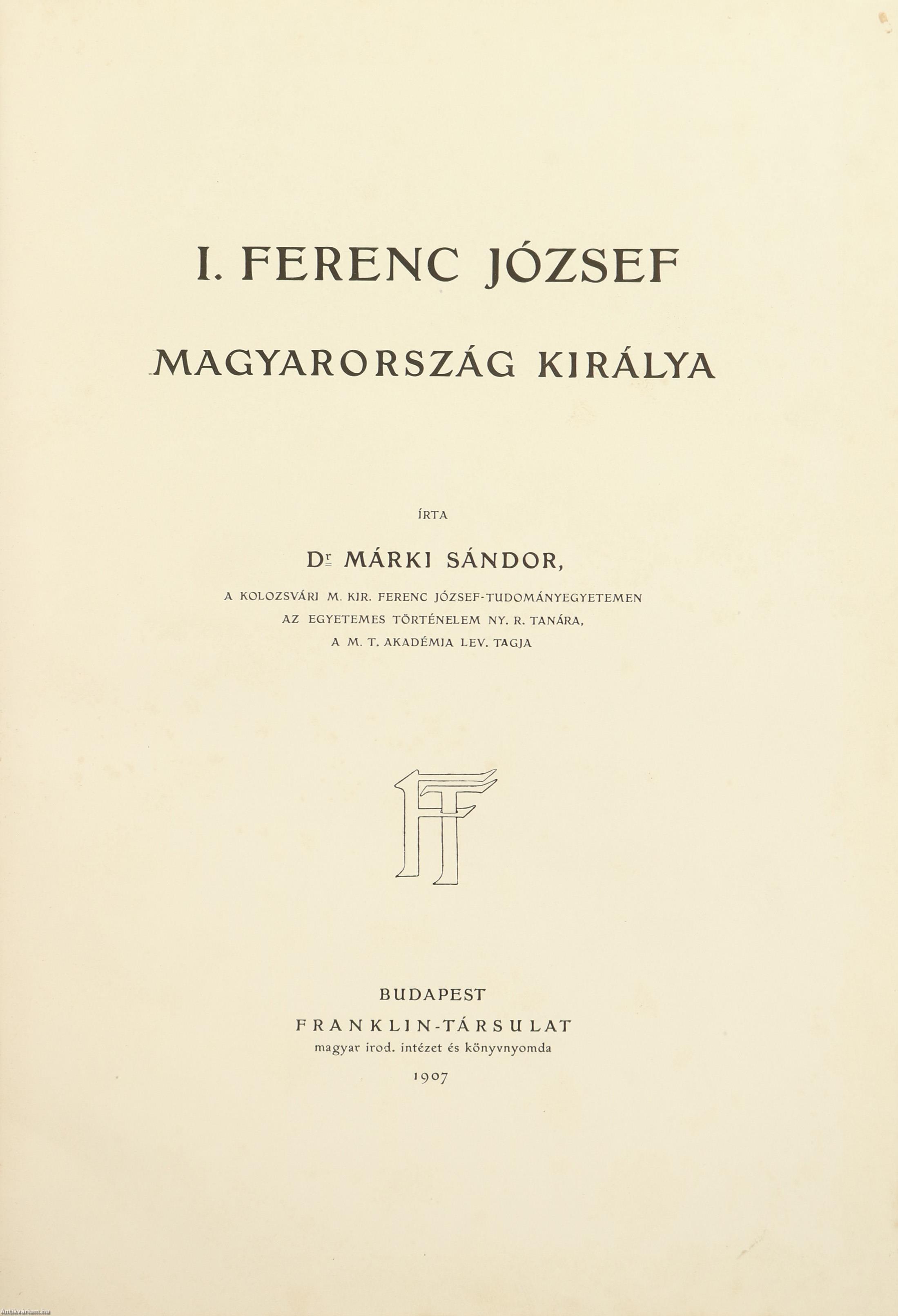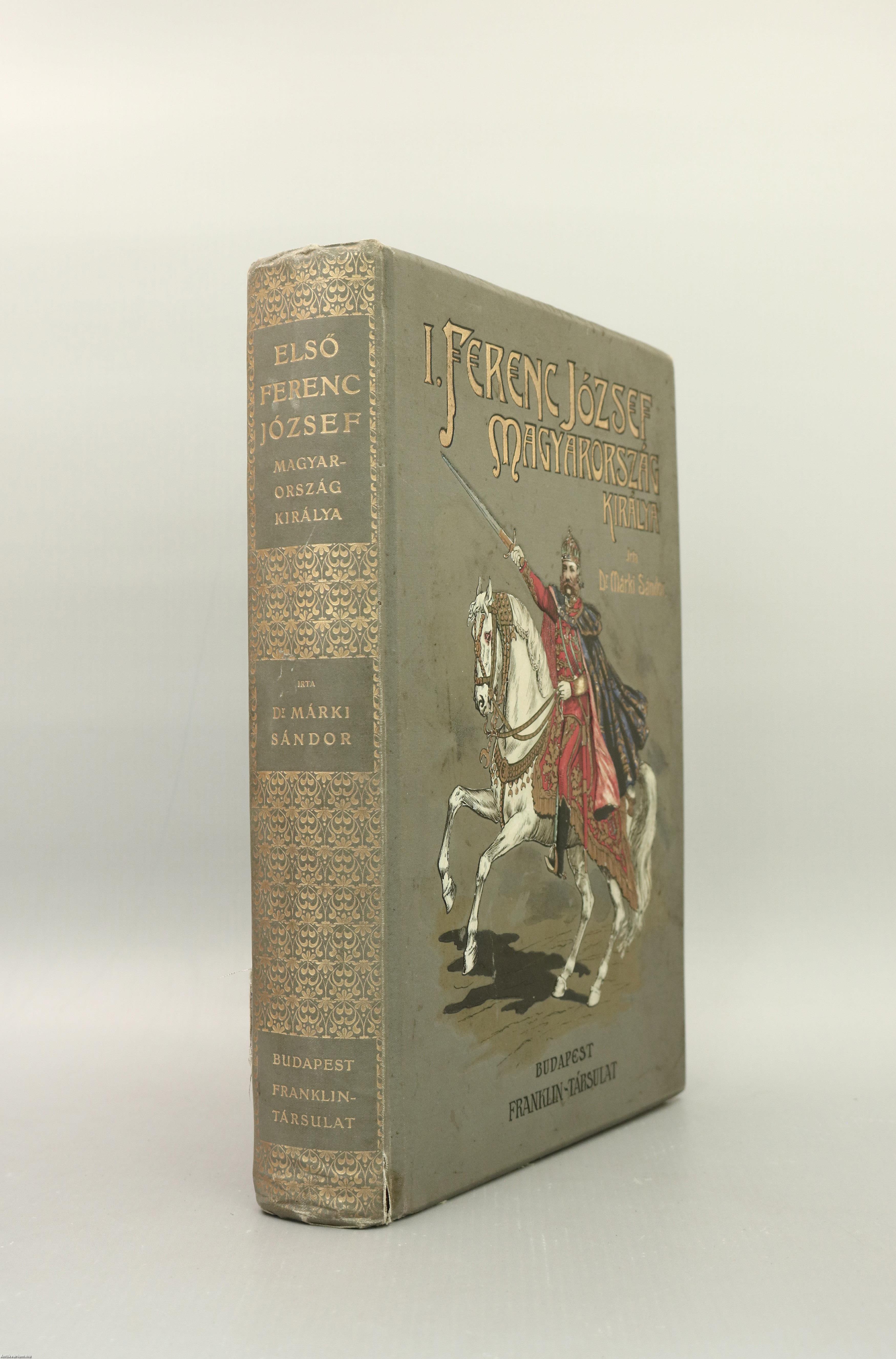 Első kiadás. I. Ferenc József Magyarország királya. Írta: Dr. Márki Sándor, a Kolozsvári M. Kir. Ferenc József-Tudományegyetemen az egyetemes történelem ny. r. tanára, a M. T. Akadémia lev. tagja. Százkét, szöveg közti, fekete-fehér képpel és tizennégy fekete-fehér, feliratos, hártyapapírral védett képtáblával illusztrált, valamint négy hasonmással, tartalomjegyzékkel és a képek jegyzékével ellátott kiadás. Nyomtatta a Franklin-Társulat Nyomdája, Budapesten. Kiadói egészvászon díszkötésben lévő példány aranyozott feliratozású, több színnel színezett, festett, dombornyomott illusztrációval ellátott címfedéllel, aranyozott feliratozású, dúsan aranyozott könyvgerinccel, növénymotívumokkal díszített kiadói előzéklapokkal (a címfedél felől ragasztott címkével), a dupla keretes hátlapon a kötészet feltüntetésével, hiánytalan állapotban. A kötet szerzője, Márki Sándor (Kétegyháza, 1853. március 27. – Gödöllő, 1925. július 1.) történész, egyetemi tanár, az MTA tagja. 1876-ban tanári oklevelet, 1878-ban doktorátust szerzett, majd az aradi Orczy- és Vásárhelyi-könyvtárak őre lett. Később Budapesten tanár, majd 1892-től a kolozsvári egyetem történelemtanára. A Magyar Történelmi Társulat, a Magyar Földrajzi Társaság, az Erdélyi Múzeum-Egyesület és a Szent István Társulat tagja. Az első világháború után munkahelye, a kolozsvári egyetem kényszerű helyváltoztatását követve ő is Szegedre költözött, ahol haláláig az egyetem Középkori Történeti Intézetének vezetője volt. Értékes hagyatékát a SZTE Egyetemi Könyvtár kézirattára őrzi.