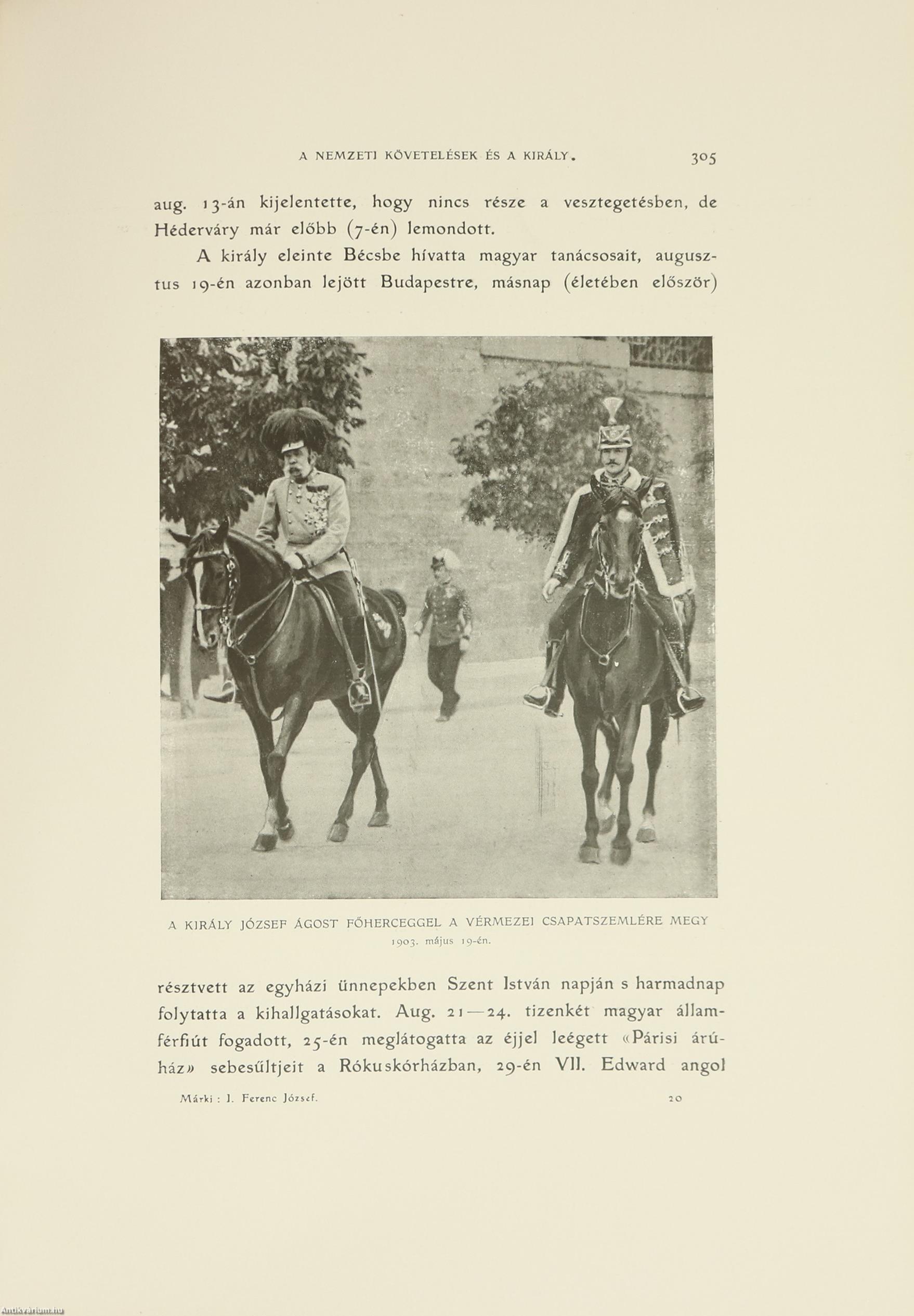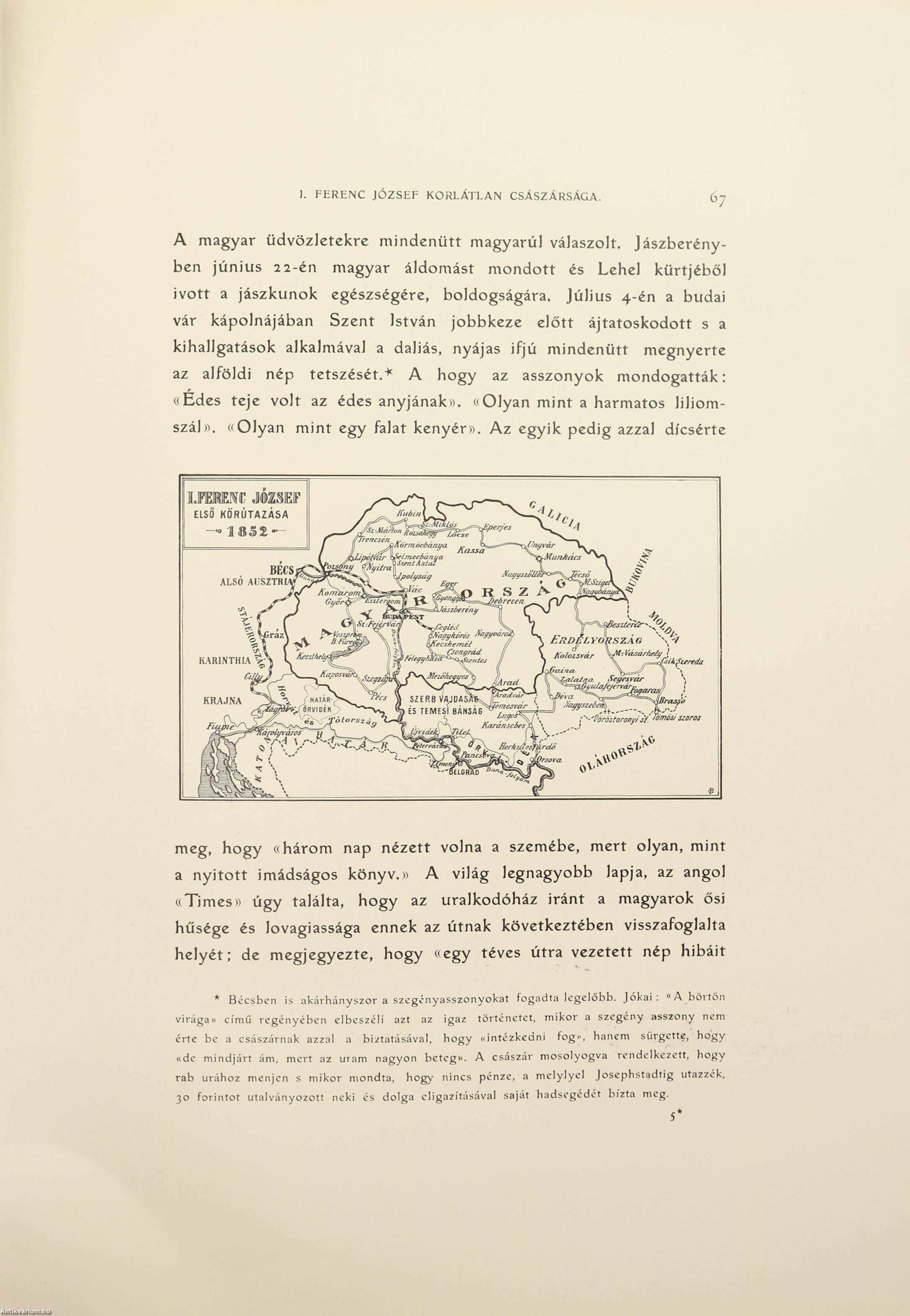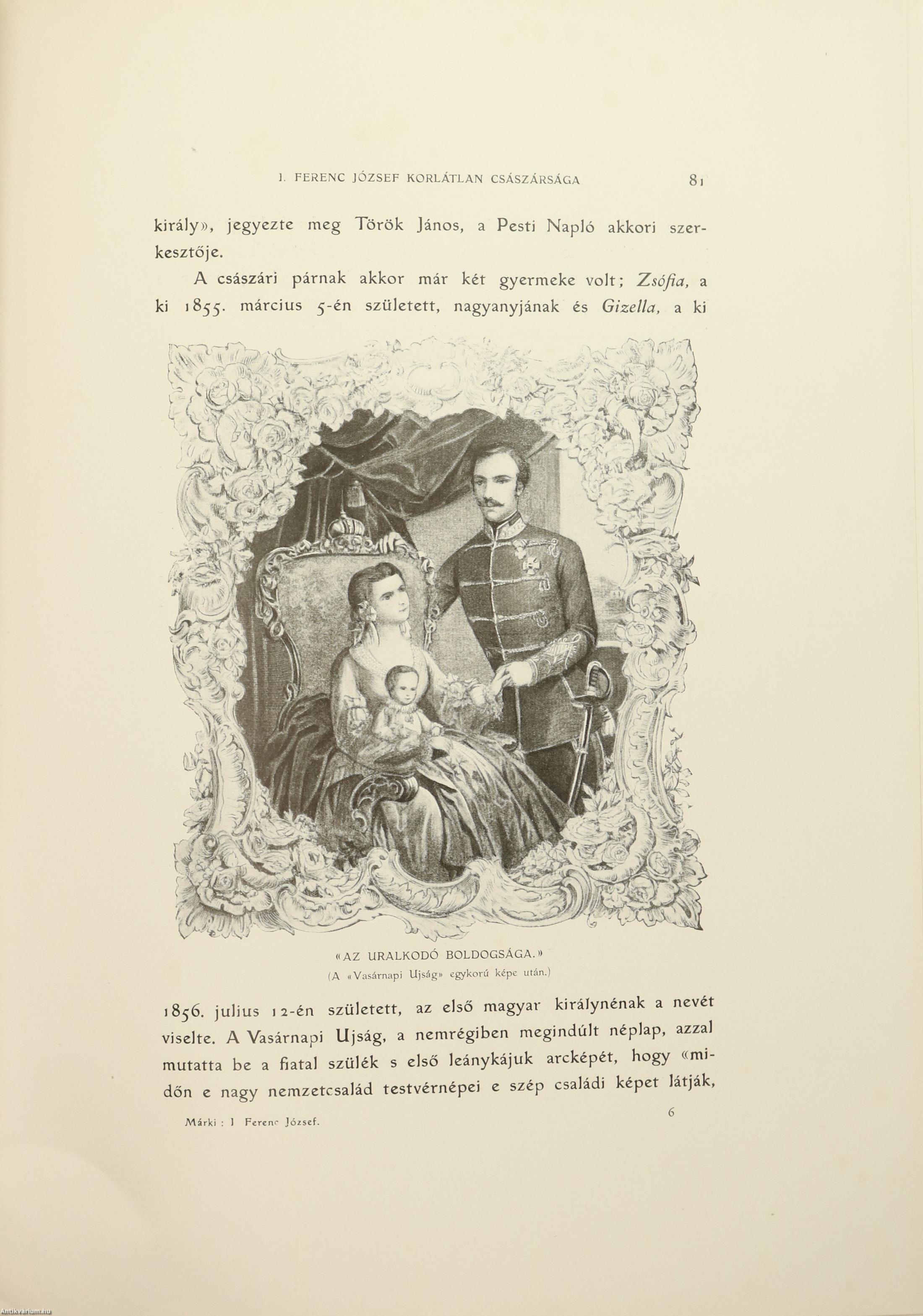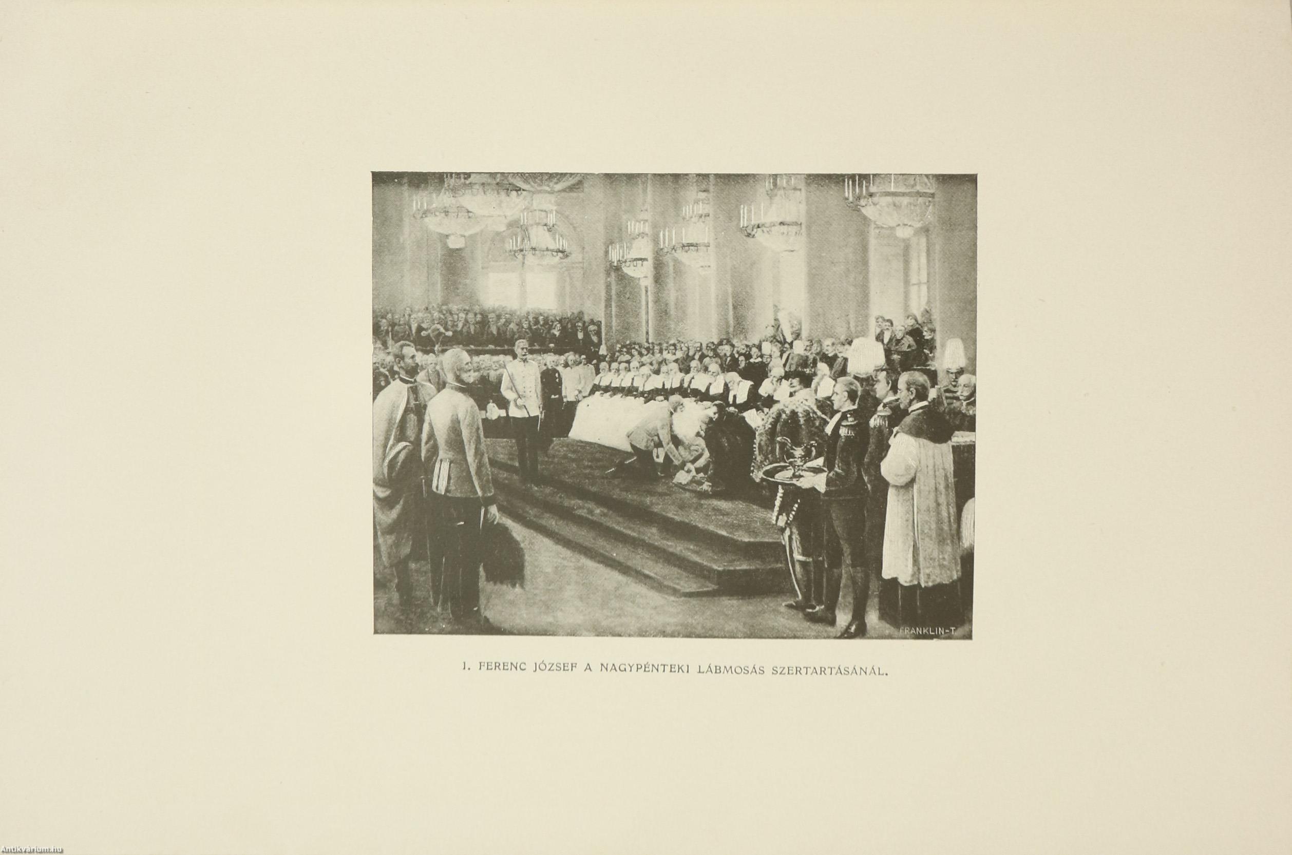 Első kiadás. I. Ferenc József Magyarország királya. Írta: Dr. Márki Sándor, a Kolozsvári M. Kir. Ferenc József-Tudományegyetemen az egyetemes történelem ny. r. tanára, a M. T. Akadémia lev. tagja. Százkét, szöveg közti, fekete-fehér képpel és tizennégy fekete-fehér, feliratos, hártyapapírral védett képtáblával illusztrált, valamint négy hasonmással, tartalomjegyzékkel és a képek jegyzékével ellátott kiadás. Nyomtatta a Franklin-Társulat Nyomdája, Budapesten. Kiadói egészvászon díszkötésben lévő példány aranyozott feliratozású, több színnel színezett, festett, dombornyomott illusztrációval ellátott címfedéllel, aranyozott feliratozású, dúsan aranyozott könyvgerinccel, növénymotívumokkal díszített kiadói előzéklapokkal (a címfedél felől ragasztott címkével), a dupla keretes hátlapon a kötészet feltüntetésével, hiánytalan állapotban. A kötet szerzője, Márki Sándor (Kétegyháza, 1853. március 27. – Gödöllő, 1925. július 1.) történész, egyetemi tanár, az MTA tagja. 1876-ban tanári oklevelet, 1878-ban doktorátust szerzett, majd az aradi Orczy- és Vásárhelyi-könyvtárak őre lett. Később Budapesten tanár, majd 1892-től a kolozsvári egyetem történelemtanára. A Magyar Történelmi Társulat, a Magyar Földrajzi Társaság, az Erdélyi Múzeum-Egyesület és a Szent István Társulat tagja. Az első világháború után munkahelye, a kolozsvári egyetem kényszerű helyváltoztatását követve ő is Szegedre költözött, ahol haláláig az egyetem Középkori Történeti Intézetének vezetője volt. Értékes hagyatékát a SZTE Egyetemi Könyvtár kézirattára őrzi.
