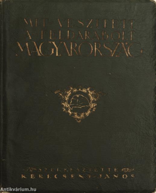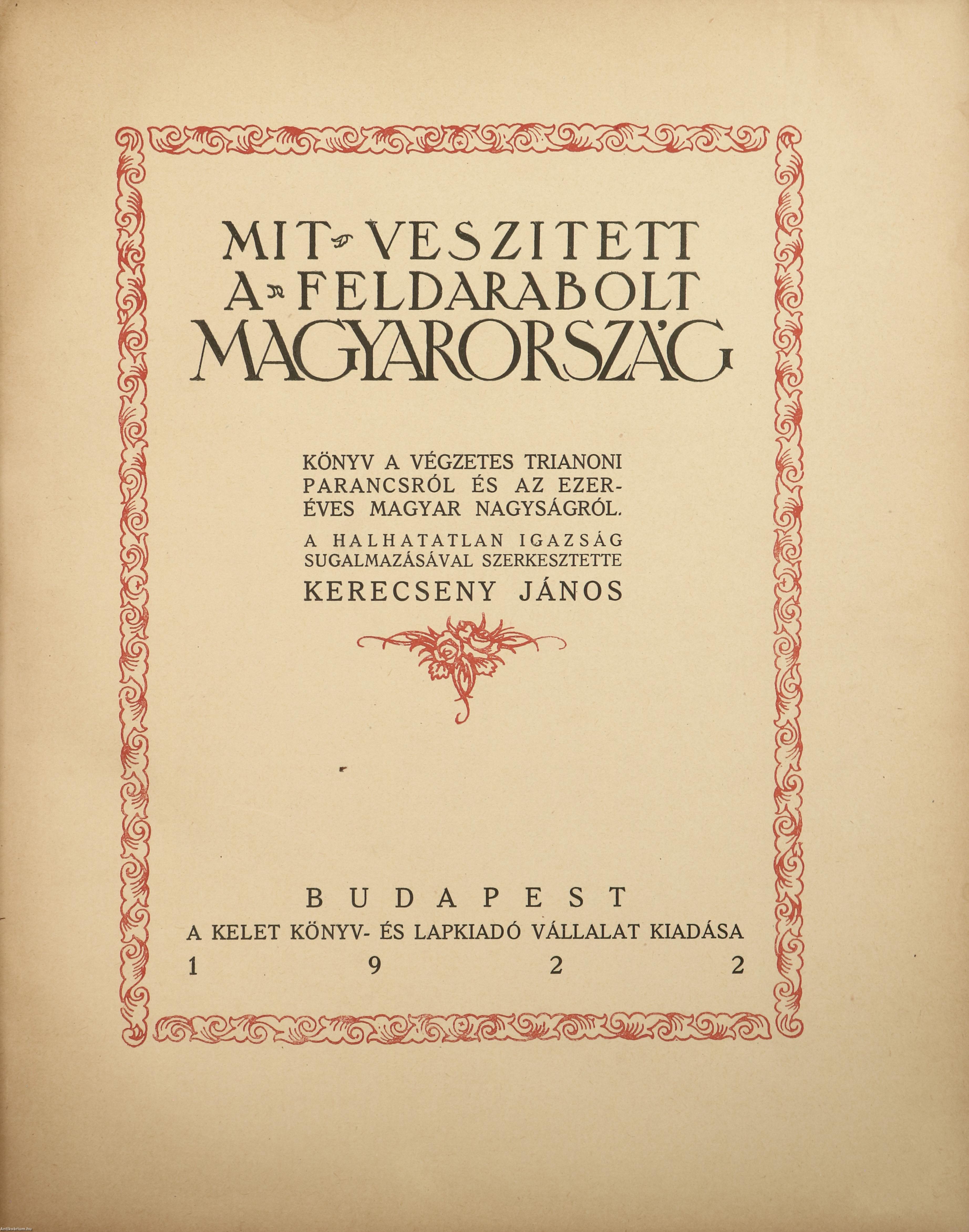 Első kiadás. Mit veszitett a feldarabolt Magyarország. Könyv a végzetes trianoni parancsról és az ezeréves magyar nagyságról. A halhatatlan igazság sugalmazásával szerkesztette: Kerecseny János. Szöveg közti, fekete-fehér reprodukciókkal és egy térképvázlattal, 2 fekete-fehér, hártyapapírral védett képtáblával, illetve egyszínű iniciálékkal illusztrált, valamint előszóval és tartalomjegyzékkel kiegészített kötet. Az iniciálékat és a címlapot Tábor János rajzolta. A klisék egy része a Könyves Kálmán műintézetből valók, a többit idősb. Weinwurm Antal és a Sokszorosító Ipar Rt. készítették. Nyomtatta a Heller K. és Társa Kő- és Könyvnyomdai Műintézet, Budapesten. Kiadói varrott kemény papírkötésben lévő példány aranyozott feliratozású, aranyozott illusztrációval ellátott címfedéllel, feliratozatlan könyvgerinccel, hátlapon a nyomda feltüntetésével, virágmotívumokkal díszített előzéklapokkal, hiánytalan állapotban. A kötet szerzője, Kerecseny János (Nagykanizsa, 1894. október 18. – Cleveland [USA] 1970. március 3.) szerkesztő, újságíró. 1920-ban megalapította a Kelet Könyv- és Lapkiadót, amelynek 1925-ig a vezetője is volt. 1926-tól 1942-ig a Szittya Kiadó vezetőjeként és a Néprokonsági Könyvtár lektoraként tevékenykedett. A világháborúban katonai szolgálatot teljesített. 1945-ben Németországba távozott, onnan az USA-ba emigrált.