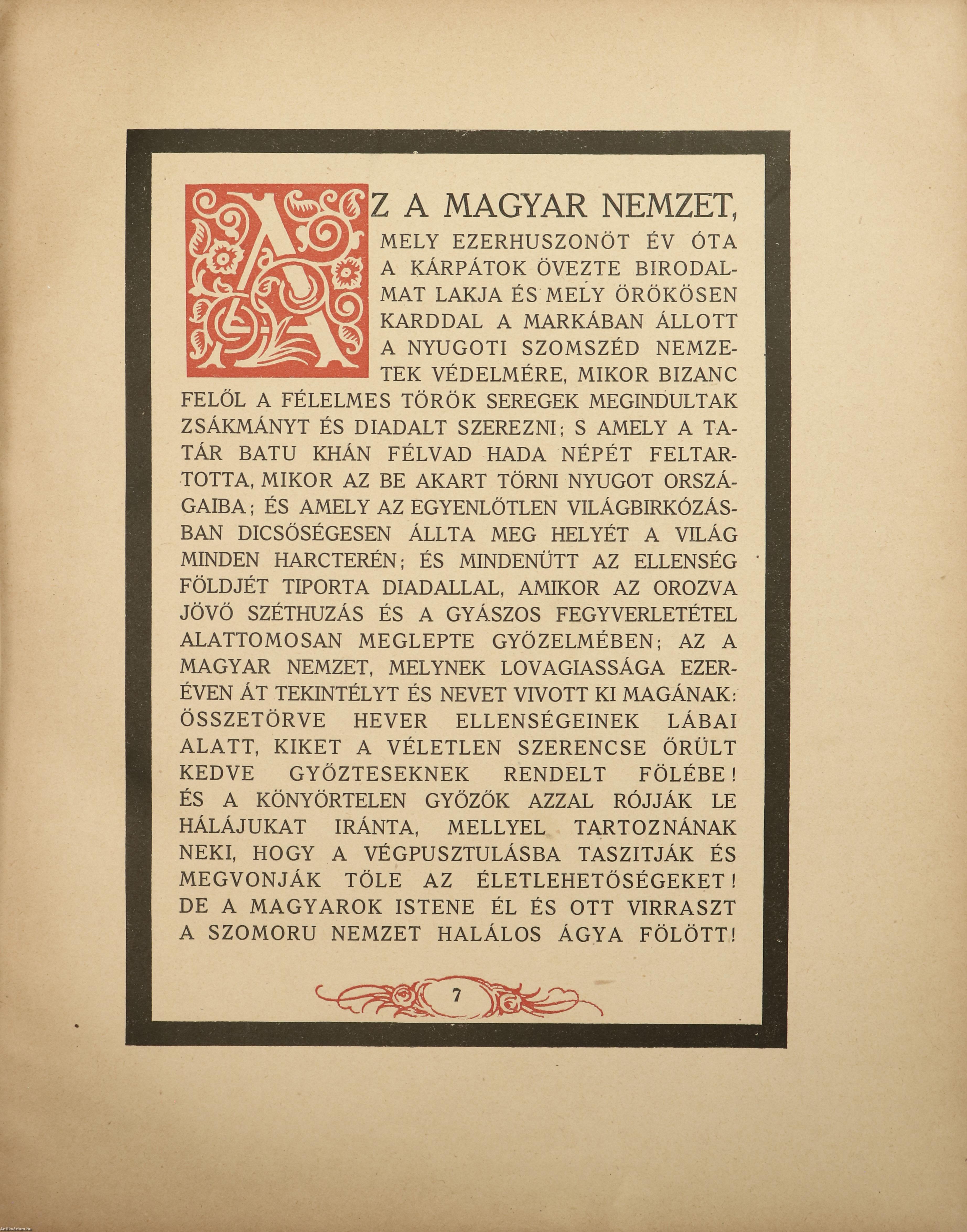 Az a magyar nemzet, mely ezerhuszonöt év óta a Kárpátok övezte birodalmat lakja és mely örökösen karddal a markában állott a nyugoti szomszéd nemzetek védelmére, mikor Bizánc felől a félelmetes török seregek megindultak zsákmányt és diadalt szerezni; s amely a tatár Bathu Khán félvad hada népét feltartotta, mikor az be akart törni nyugot országaiba; és amely az egyenlőtlen világbirkózásban dicsőségesen állta meg helyét a világ minden harcterén; és mindenütt az ellenség földjét tiporta a diadallal, amikor az orozva jövő széthuzás és a gyászos fegyverletétel alattomosan meglepte győzelmében; az a magyar nemzet, melynek lovassága ezeréven át tekintélyt és nevet vivott ki magának: összetörve hever ellenségeinek lábai alatt, kiket a véletlen szerencse őrült kedve győzteseknek rendelt fölébe! És a könyörtelen győzők azzal rójják le hálájukat iránta, mellyel tartoznának neki, hogy a végpusztulásba taszitják és megvonják tőle az életlehetőségeket! De a magyarok Istene él és ott virraszt a szomoru nemzet halálos ágya fölött!