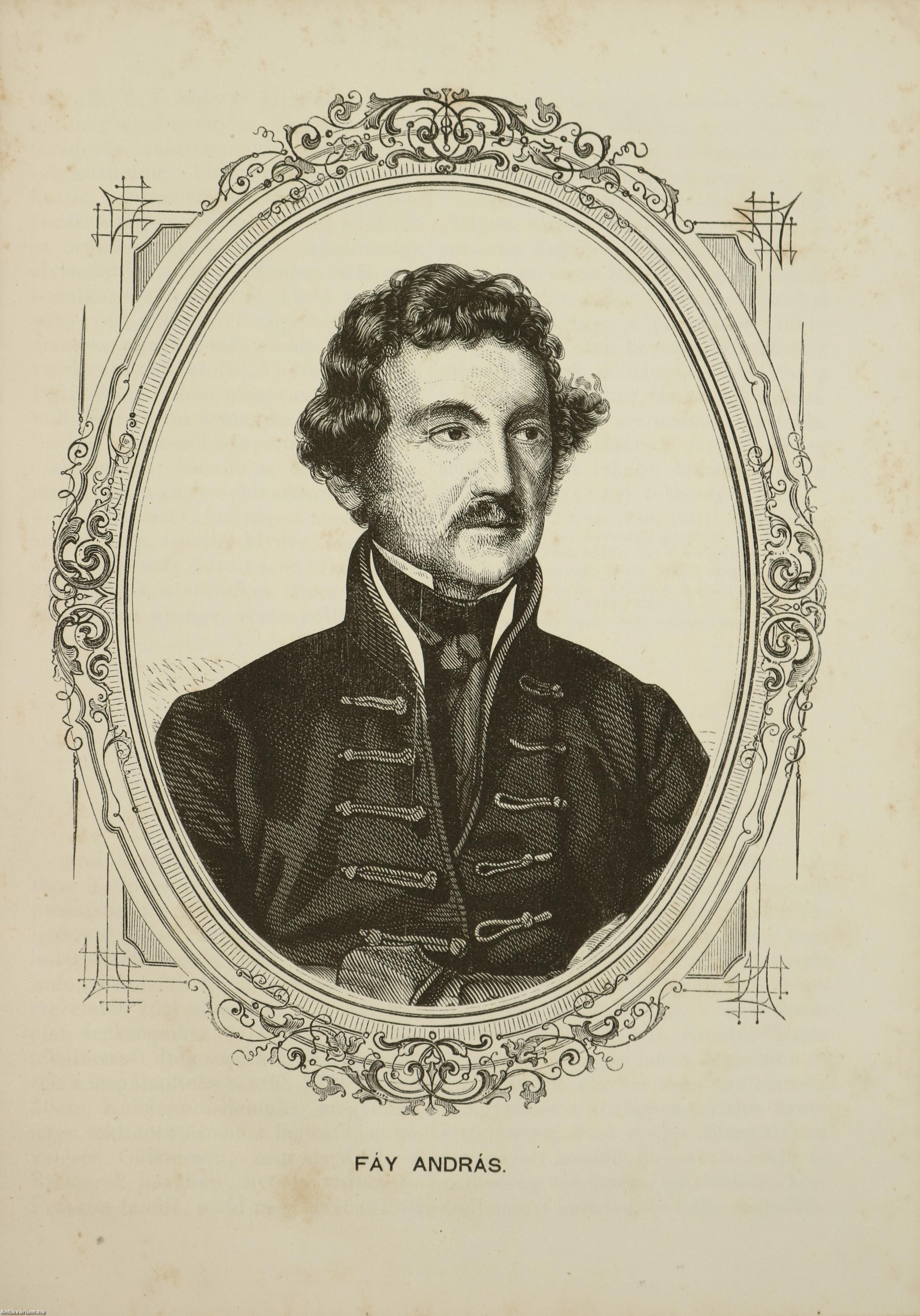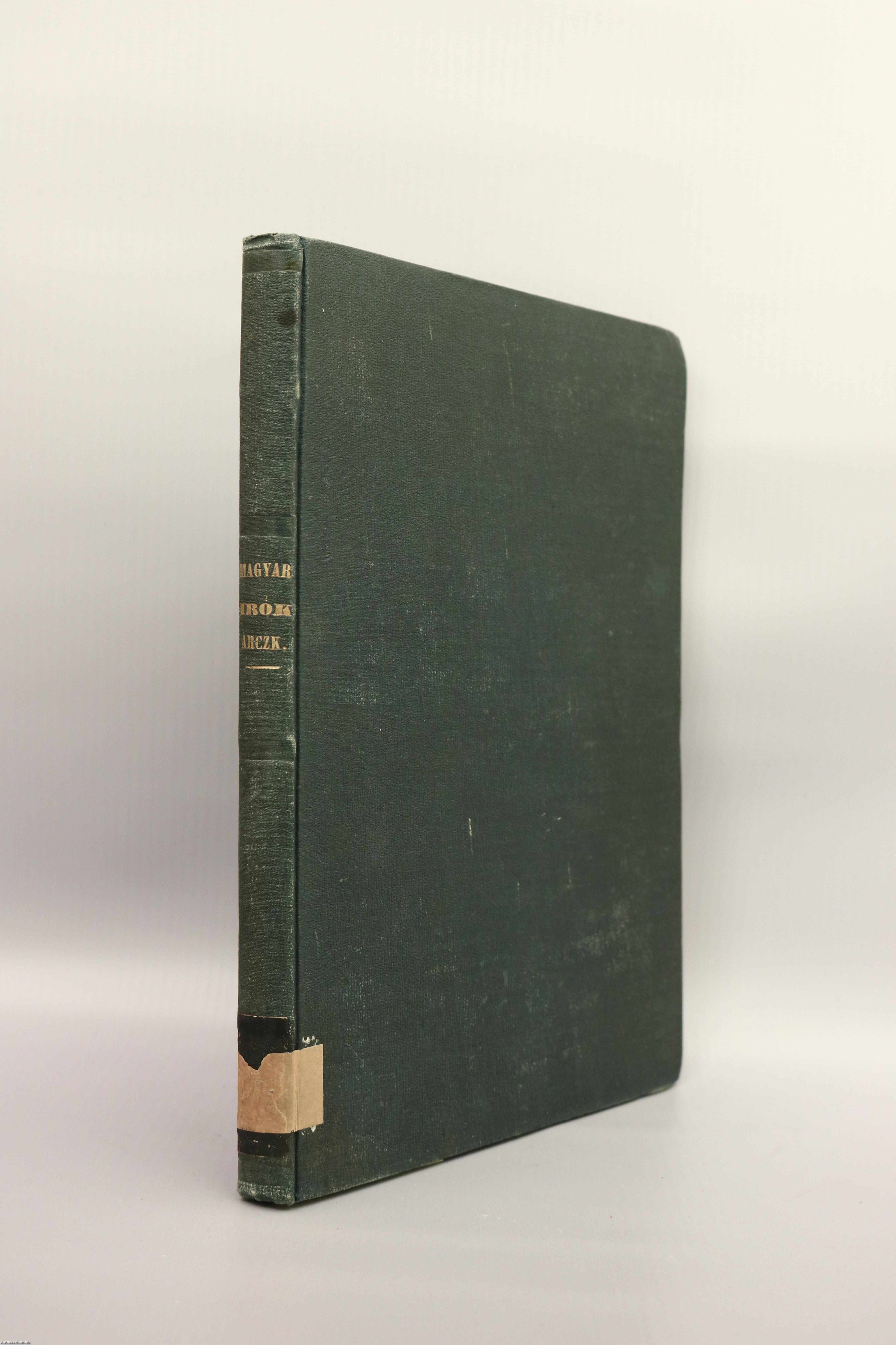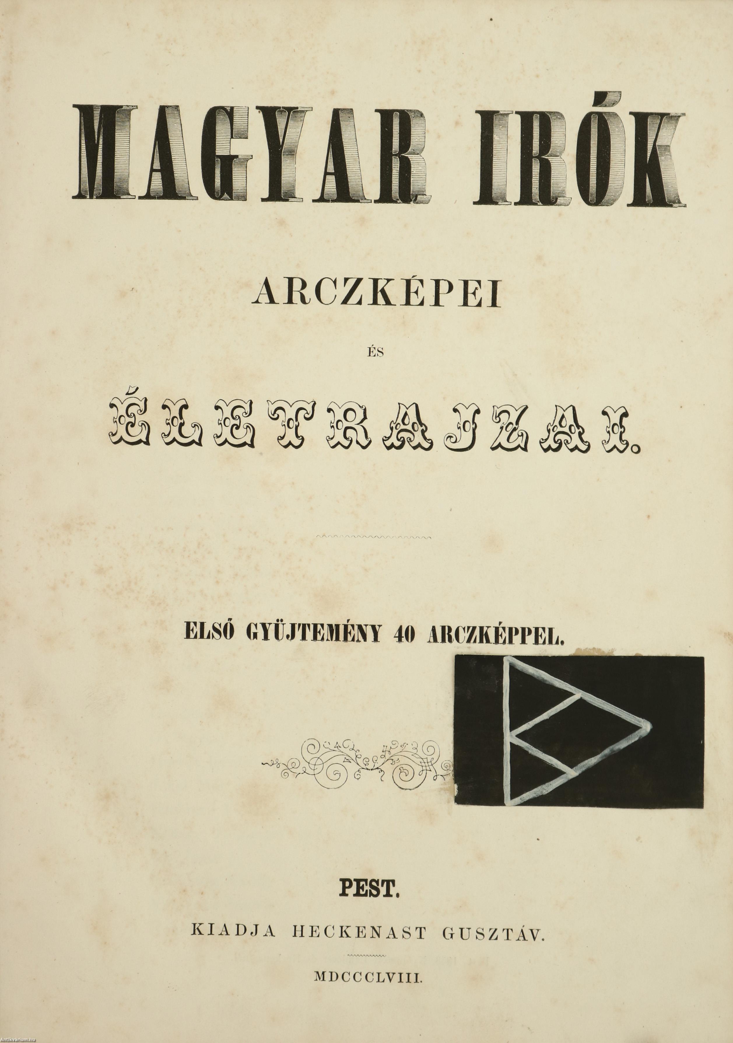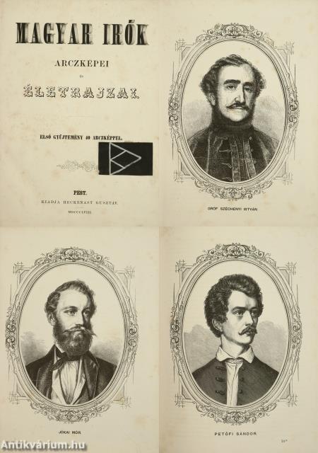 Első, unicus kiadás. Magyar irók arczképei és életrajzai. Első gyűjtemény 40 arczképpel. [Írta: Tóth Lőrinc.] A kötet 40 magyar író életrajzát és oldalszámozáson belüli, egész oldalas, fametszésű portréját tartalmazza. Az életrajzokat Tóth Lőrinc (1814-1903) ügyvéd, kúriai elnök, drámaíró, szakíró írta. Nyomatott Landerer és Heckenastnál, Pesten. A címlapon és annak verzóján beragasztott címke látható. Az első előzék címlap felőli része hiányzik. Szüry 2903. Korabeli egészvászon kötésben lévő példány feliratozatlan címfedéllel és hátlappal, aranyozott feliratos könyvgerinccel, tiszta belívekkel, tartalmilag hiánytalan állapotban.