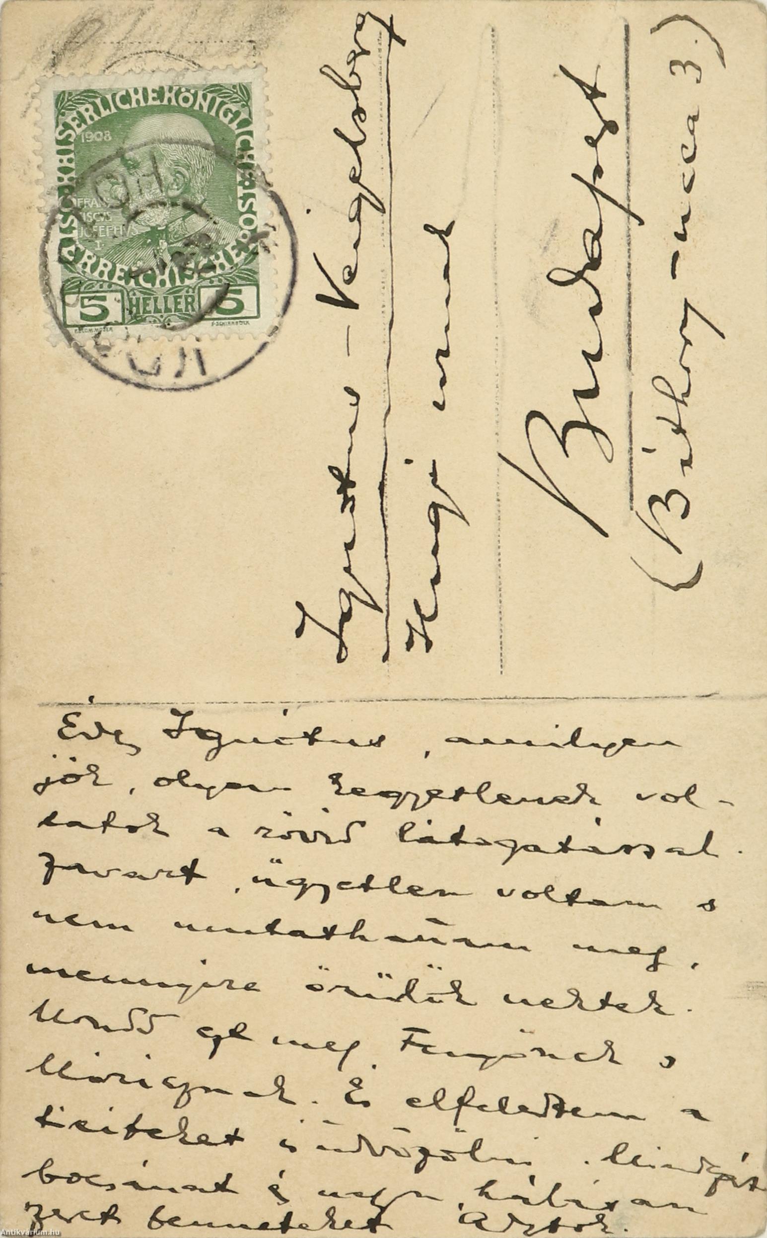 Címzése: „Ignotus-Veigelsberg / Hugó urnak / Budapest / (Báthory-ucca 3.)”